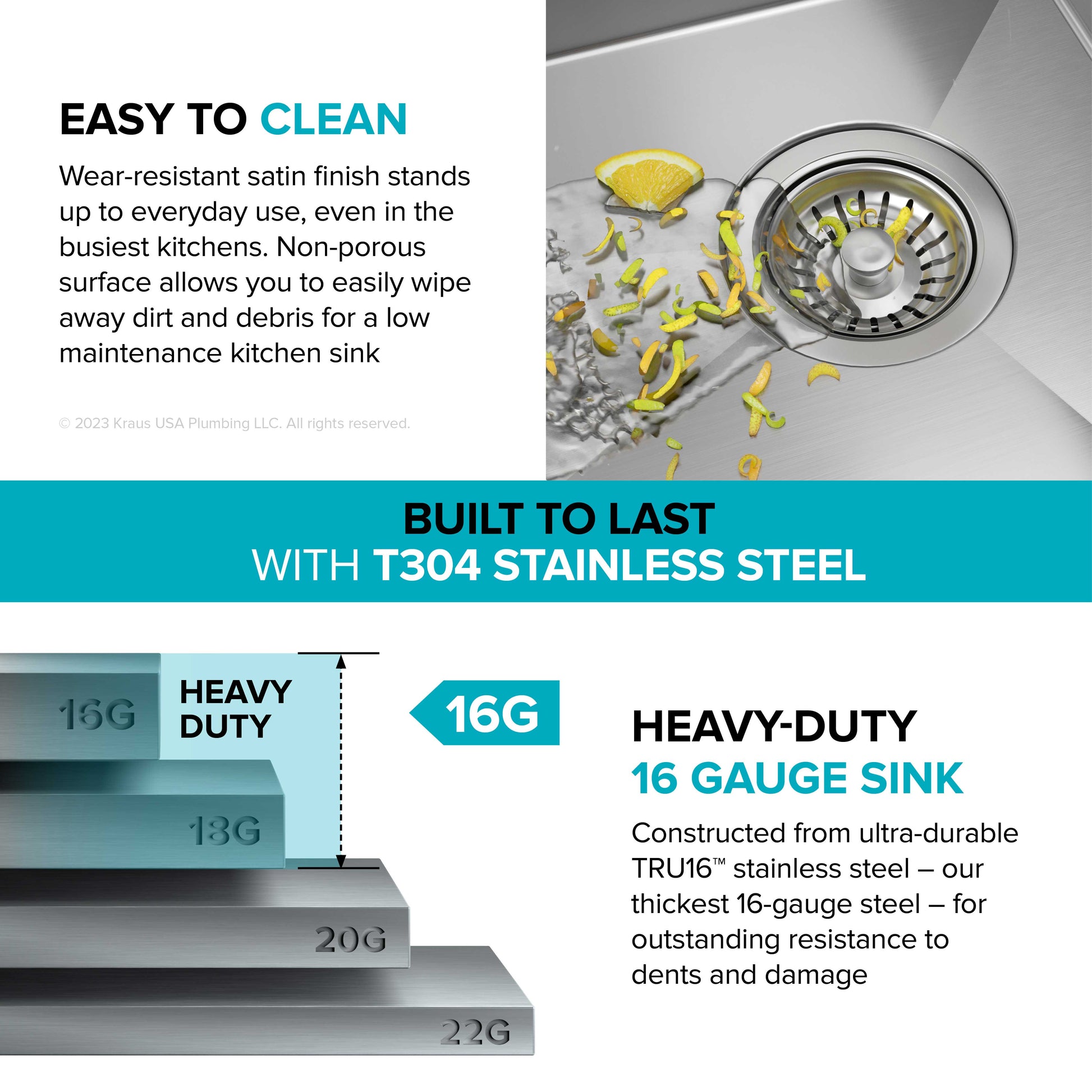 Heavy-Duty 16 Gauge Steel: Made with TRU16, the thickest stainless steel on the market, this ultra durable sink is highly resistant to corrosion and dents