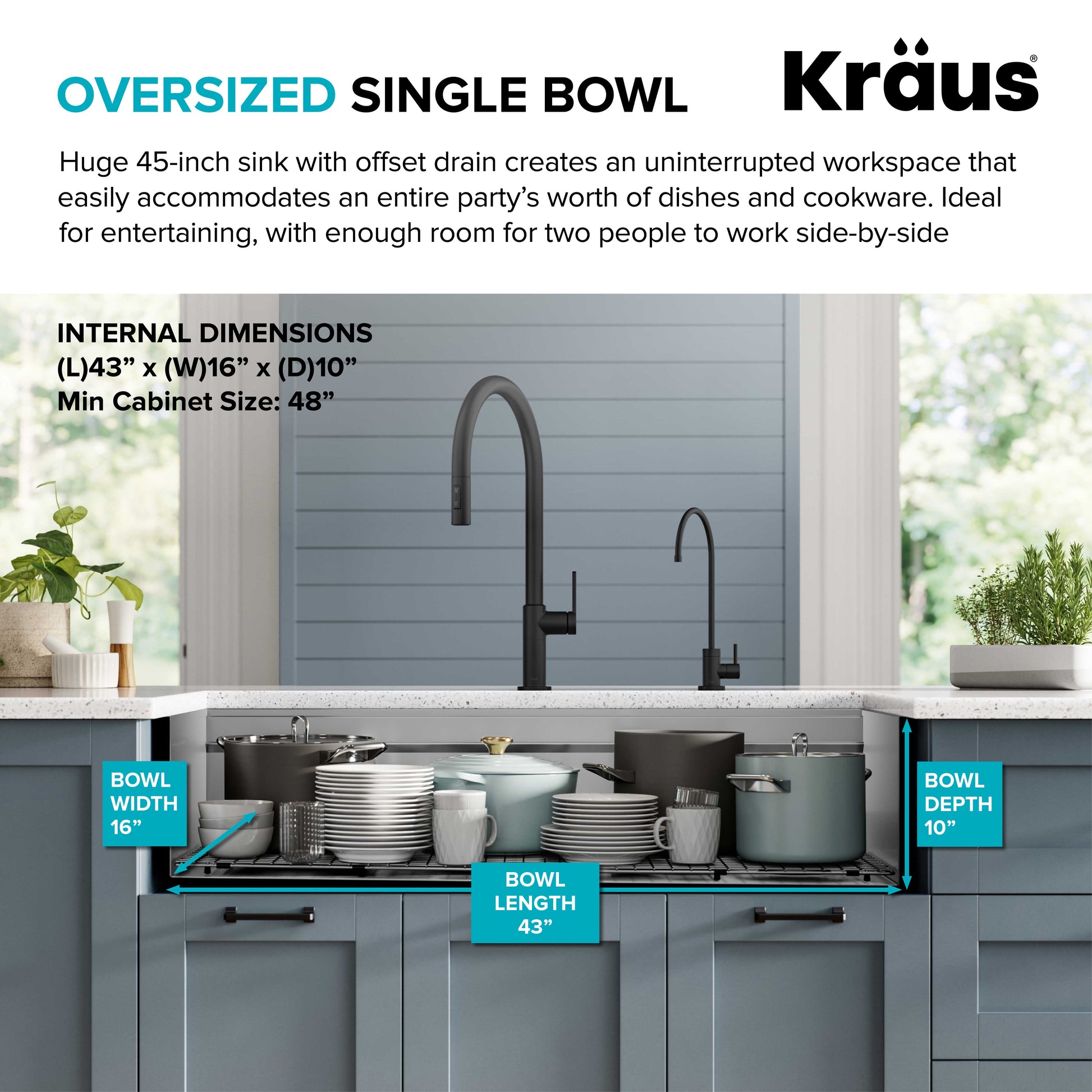 Oversized 45-Inch Single Bowl: Impressively large and deep sink with tight-radius corners and offset drain that create an uninterrupted workspace for washing your largest cookware