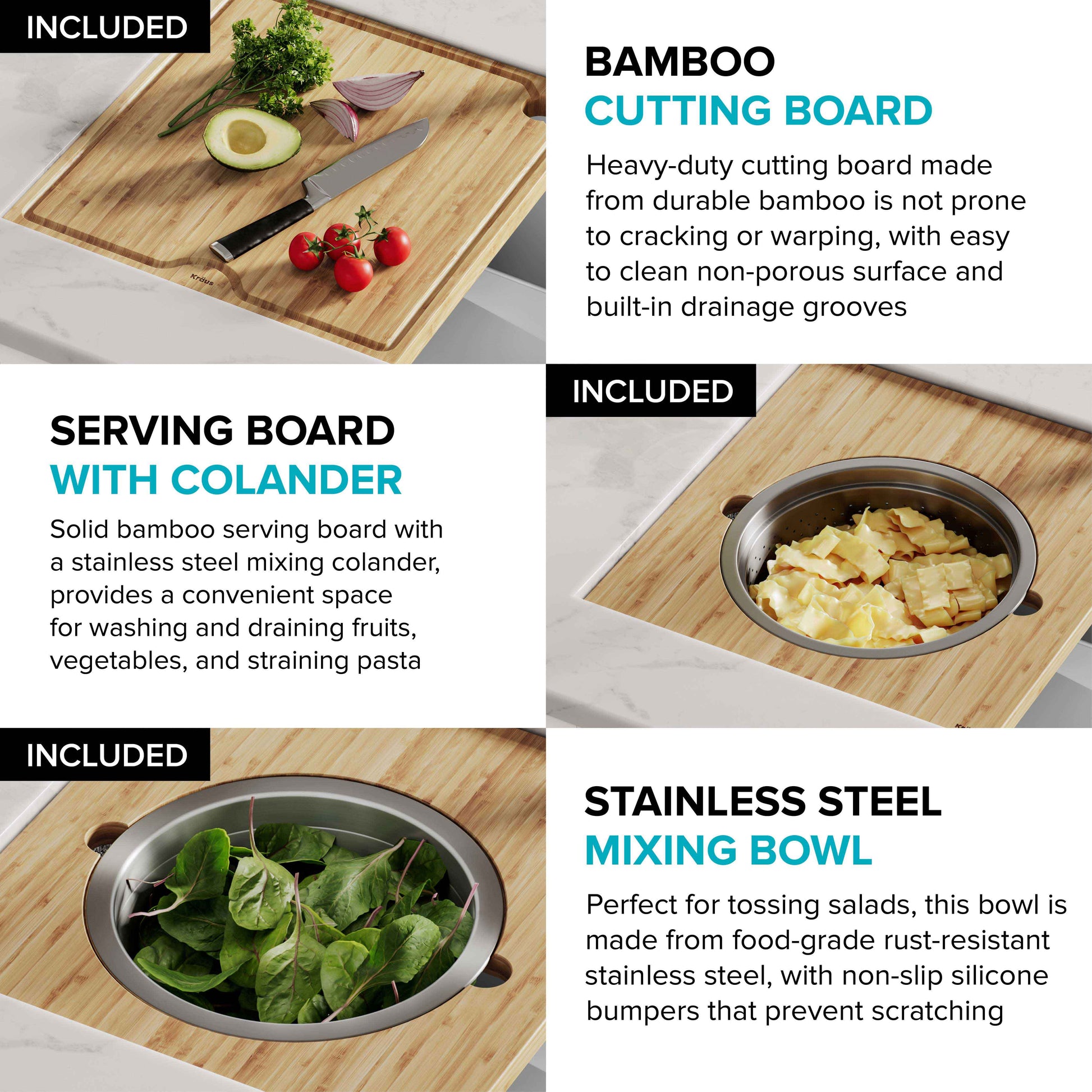 10-Piece Chef's Kit: For outstanding value and to make full use of your workstation, the package includes a solid bamboo cutting board, stainless steel dish rack, roll-up drying rack for rinsing and drying produce right over the sink, and a serving board with stainless steel bowl and colander