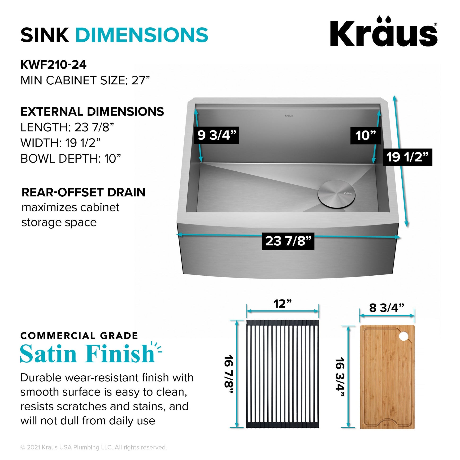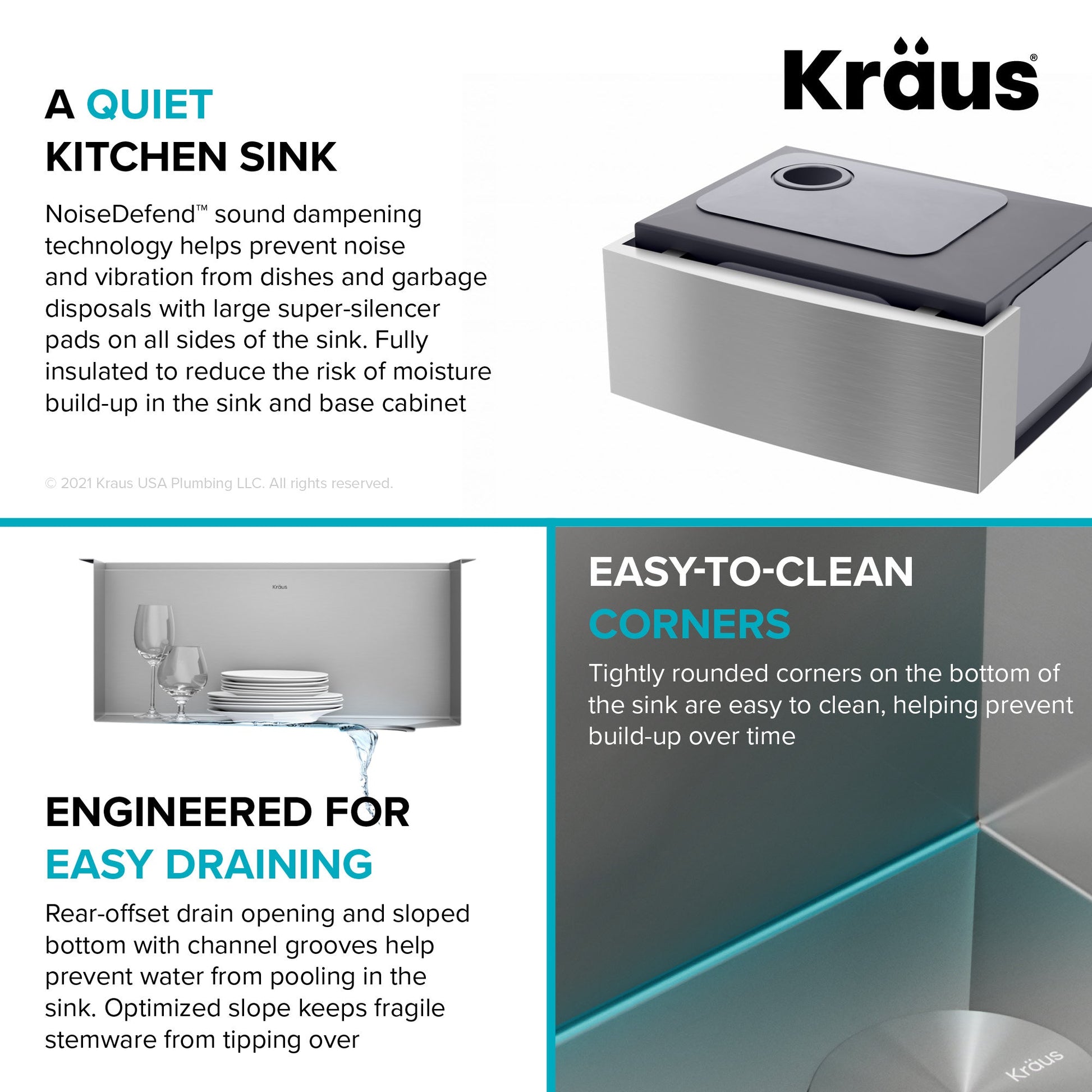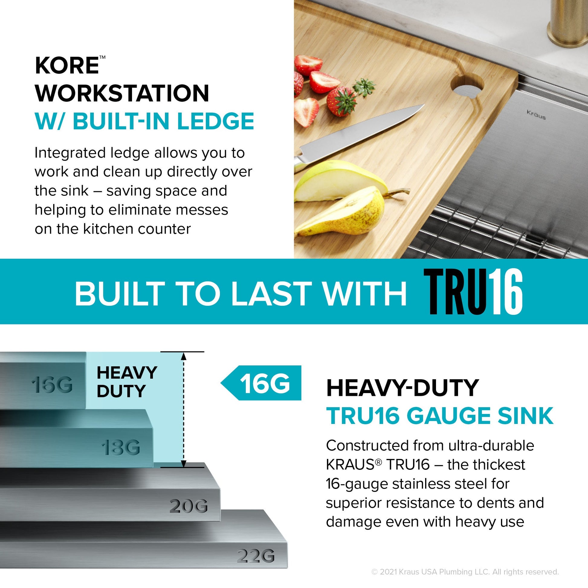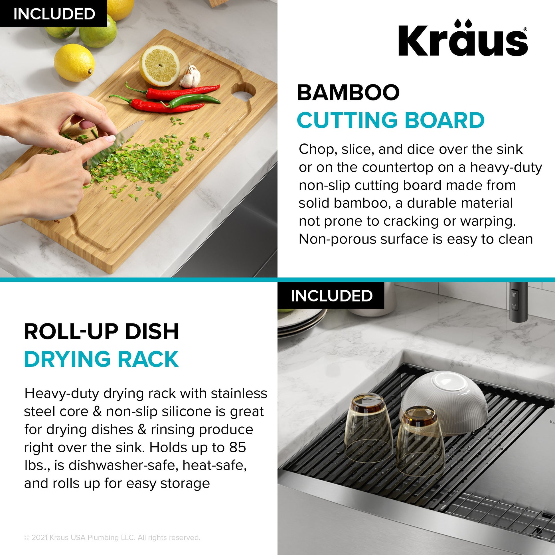Cook, serve, and entertain in style with KRAUS Kore Workstation Sinks. Engineered with an integrated ledge to support custom sliding accessories, this sink creates a multifunctional workspace to streamline all your kitchen tasks from meal prep to cleanup. The sink kit includes a heavy-duty cutting board and roll-up dish rack that allow you to work right over the sink without losing any space on the kitchen counter. Featuring a clean, classically-inspired rounded apron front, this farmhouse sink creates a focal point with a distinctive modern look that fits perfectly into any environment, from traditional to transitional to urban kitchens. Installs as an undermount for a seamless transition between sink and countertop, with no exposed mounting deck to trap food for easy cleaning. Made with KRAUS TRU16 the thickest 16 gauge stainless steel for maximum durability and NoiseDefend sound dampening pads to absorb noise and vibration for an ultra-quiet experience. Wear-resistant finish is easy to clean and not prone to corrosion, while rounded corners reduce buildup over time. Channel grooves and a sloped bottom improve drainage, with a rear off-set drain that adds storage space underneath the sink. The installation-ready sink comes with a protective stainless steel bottom grid and drain assembly with matching cover for a clean look