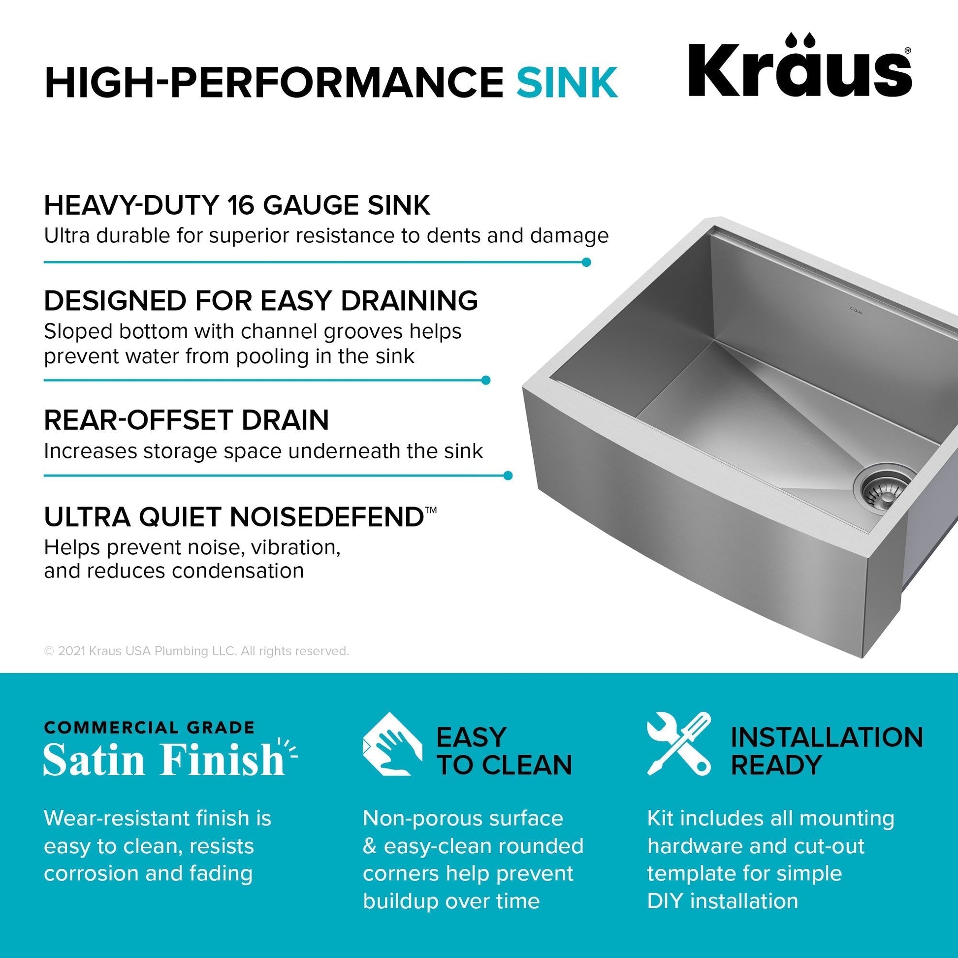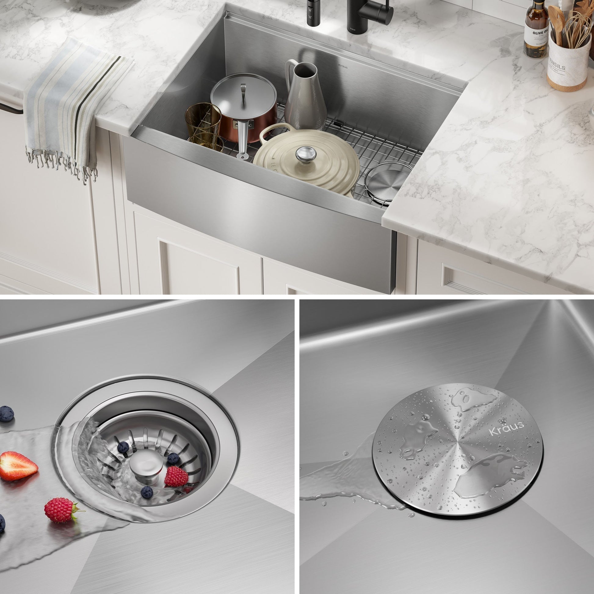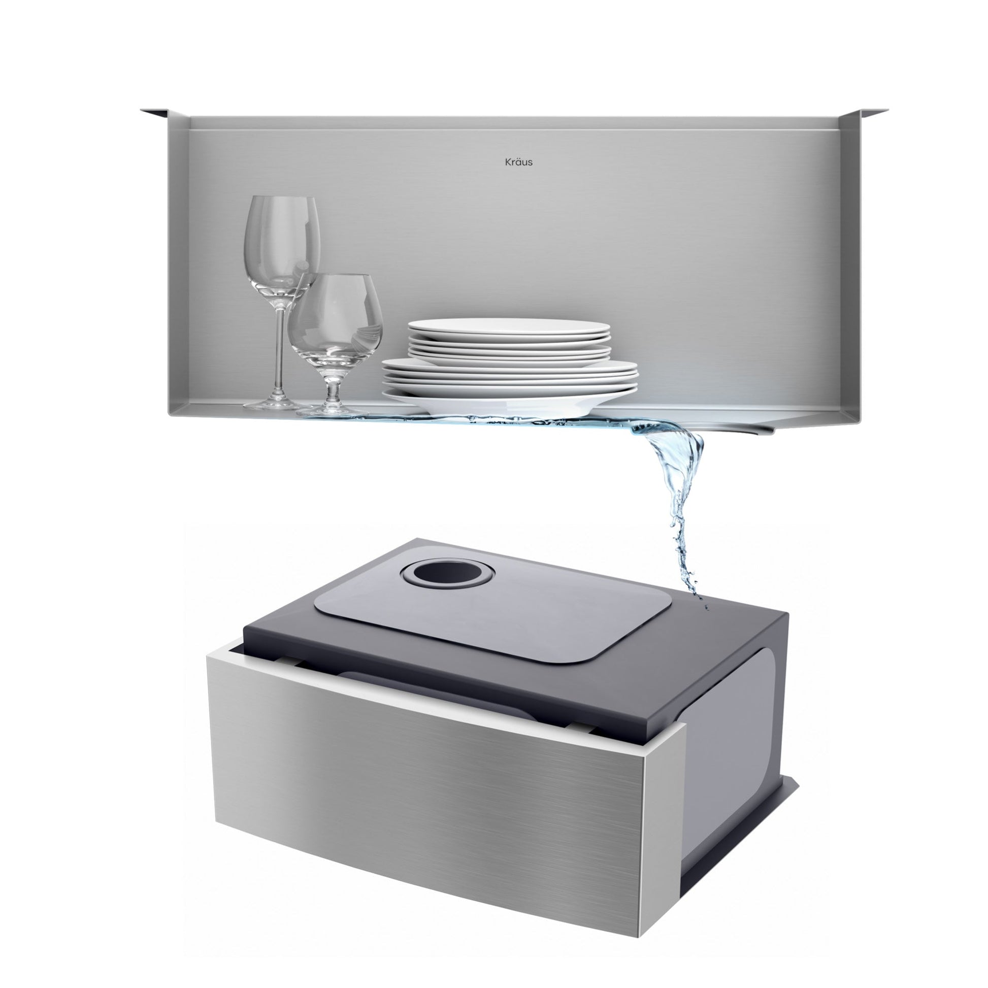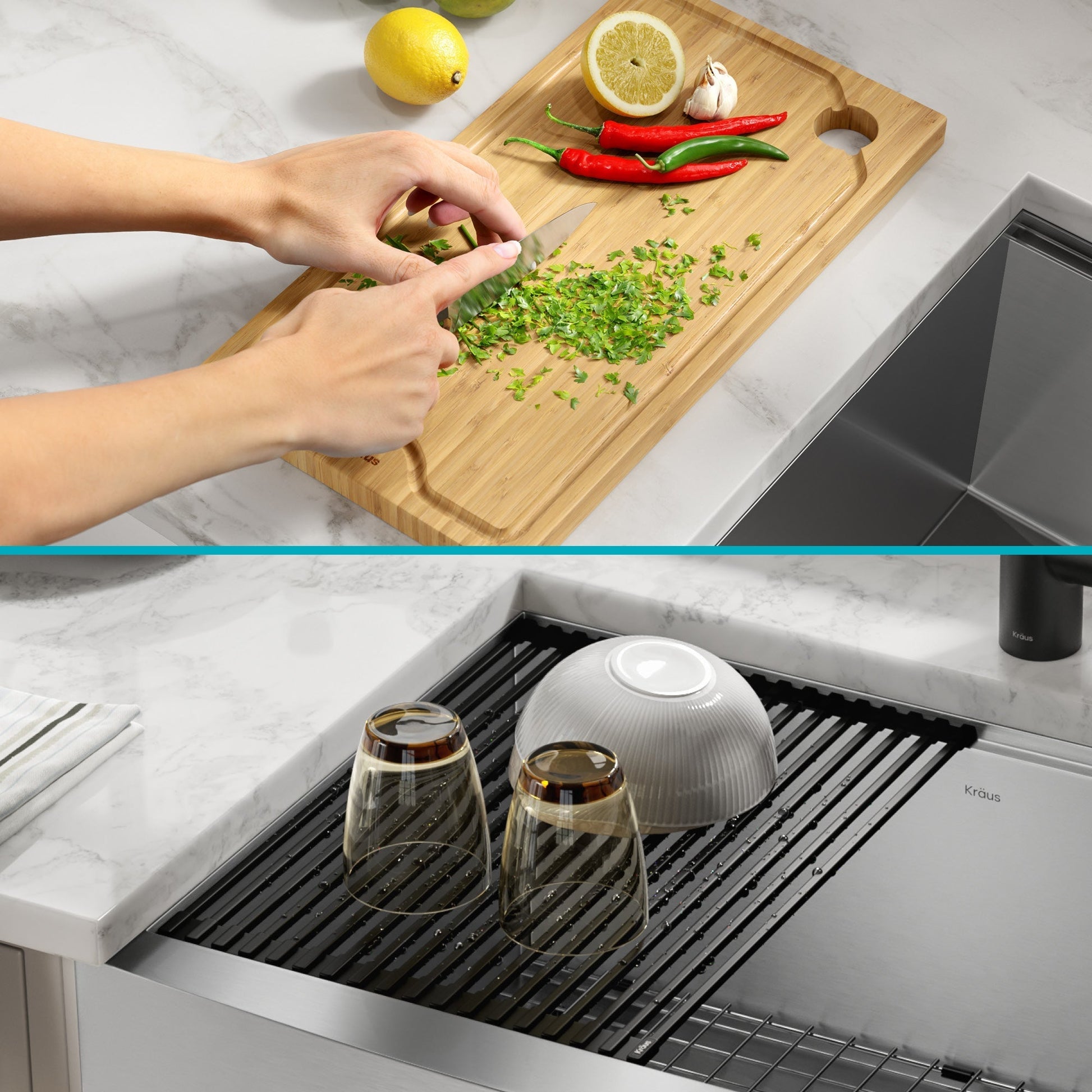 Cook, serve, and entertain in style with KRAUS Kore Workstation Sinks. Engineered with an integrated ledge to support custom sliding accessories, this sink creates a multifunctional workspace to streamline all your kitchen tasks from meal prep to cleanup. The sink kit includes a heavy-duty cutting board and roll-up dish rack that allow you to work right over the sink without losing any space on the kitchen counter. Featuring a clean, classically-inspired rounded apron front, this farmhouse sink creates a focal point with a distinctive modern look that fits perfectly into any environment, from traditional to transitional to urban kitchens. Installs as an undermount for a seamless transition between sink and countertop, with no exposed mounting deck to trap food for easy cleaning. Made with KRAUS TRU16 the thickest 16 gauge stainless steel for maximum durability and NoiseDefend sound dampening pads to absorb noise and vibration for an ultra-quiet experience. Wear-resistant finish is easy to clean and not prone to corrosion, while rounded corners reduce buildup over time. Channel grooves and a sloped bottom improve drainage, with a rear off-set drain that adds storage space underneath the sink. The installation-ready sink comes with a protective stainless steel bottom grid and drain assembly with matching cover for a clean look