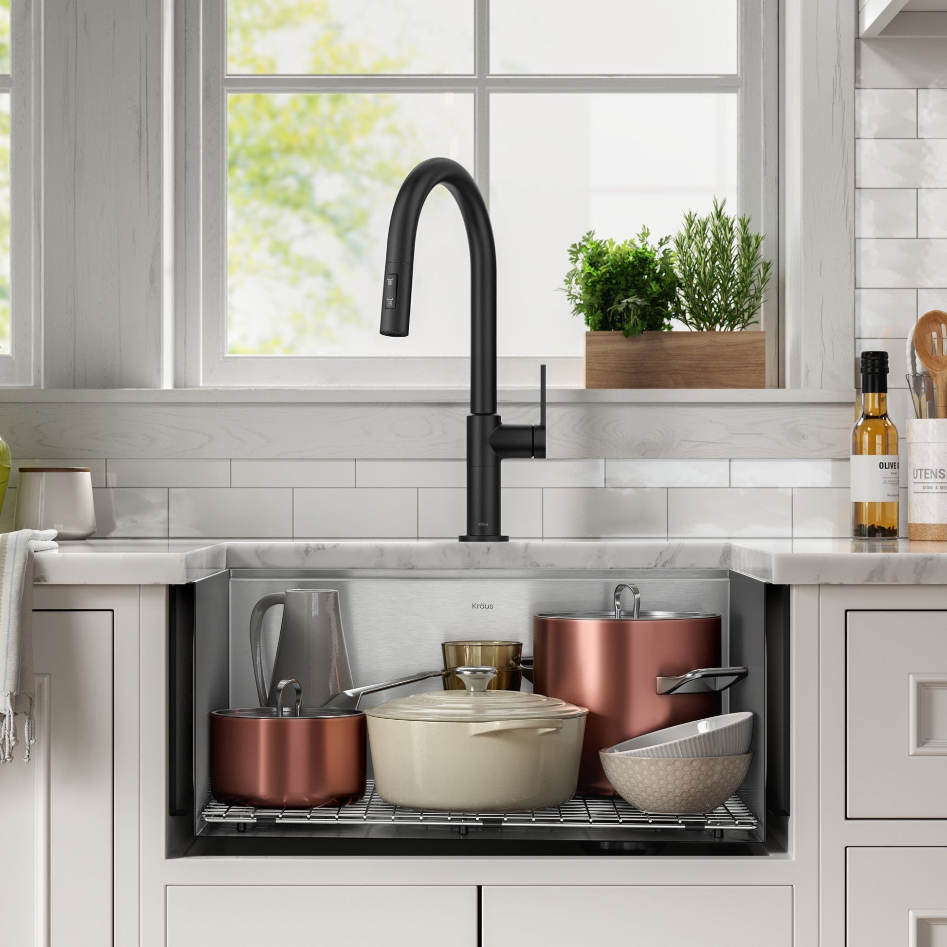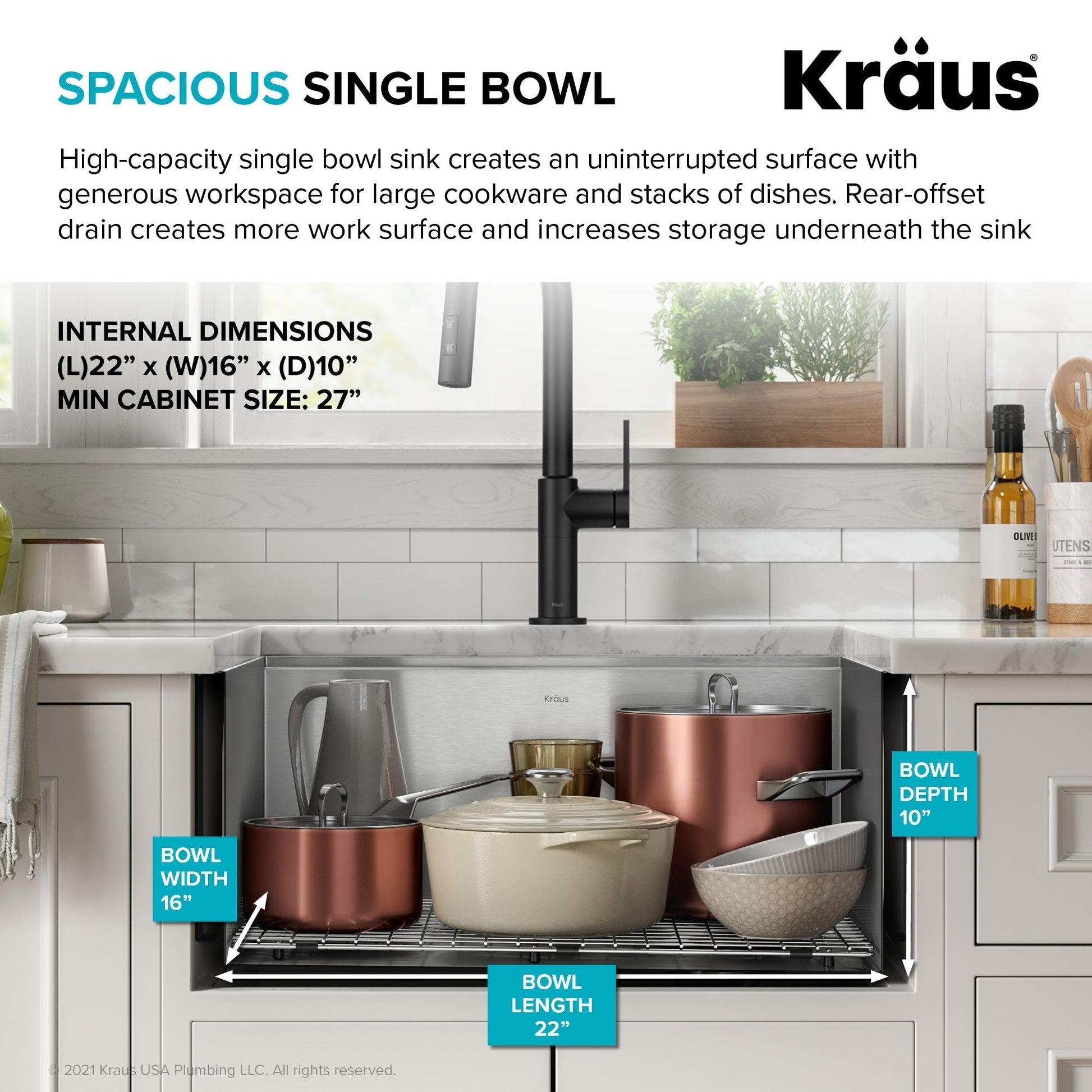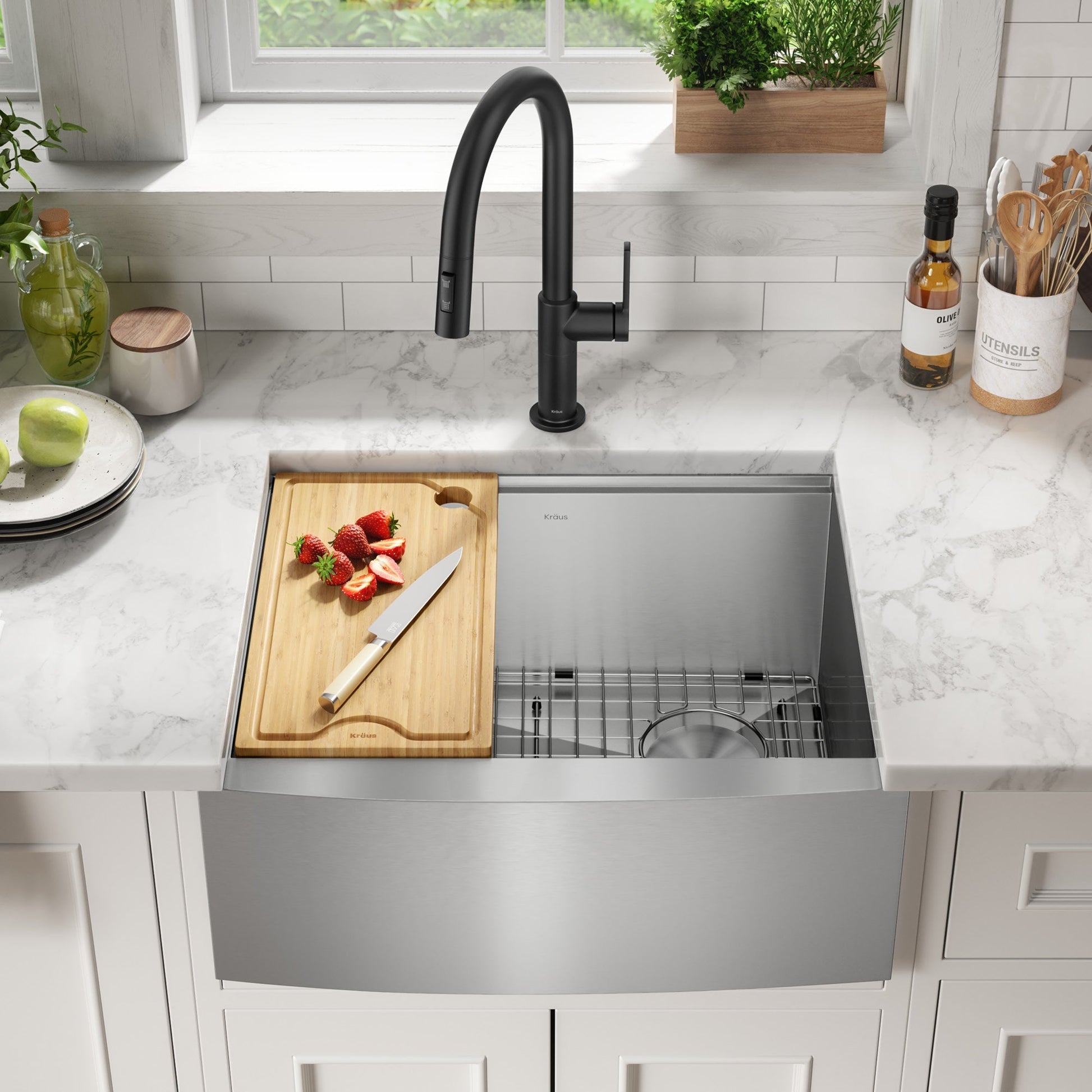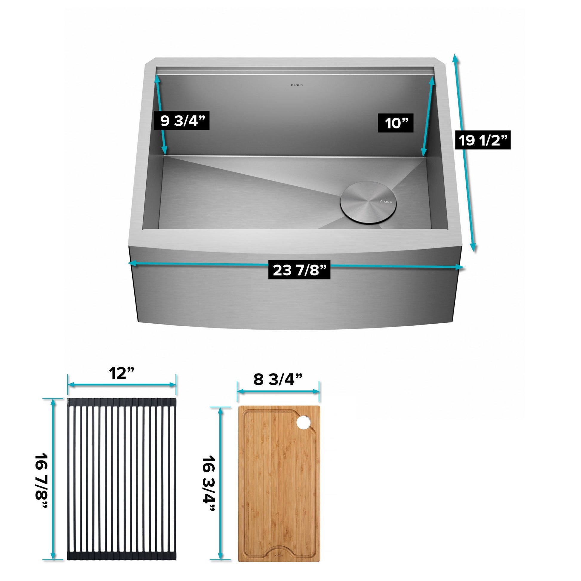 Cook, serve, and entertain in style with KRAUS Kore Workstation Sinks. Engineered with an integrated ledge to support custom sliding accessories, this sink creates a multifunctional workspace to streamline all your kitchen tasks from meal prep to cleanup. The sink kit includes a heavy-duty cutting board and roll-up dish rack that allow you to work right over the sink without losing any space on the kitchen counter. Featuring a clean, classically-inspired rounded apron front, this farmhouse sink creates a focal point with a distinctive modern look that fits perfectly into any environment, from traditional to transitional to urban kitchens. Installs as an undermount for a seamless transition between sink and countertop, with no exposed mounting deck to trap food for easy cleaning. Made with KRAUS TRU16 the thickest 16 gauge stainless steel for maximum durability and NoiseDefend sound dampening pads to absorb noise and vibration for an ultra-quiet experience. Wear-resistant finish is easy to clean and not prone to corrosion, while rounded corners reduce buildup over time. Channel grooves and a sloped bottom improve drainage, with a rear off-set drain that adds storage space underneath the sink. The installation-ready sink comes with a protective stainless steel bottom grid and drain assembly with matching cover for a clean look