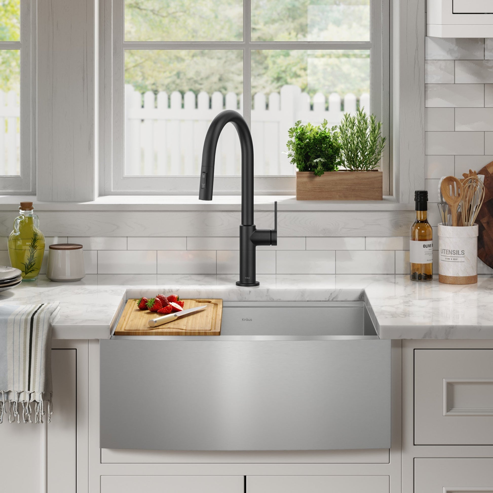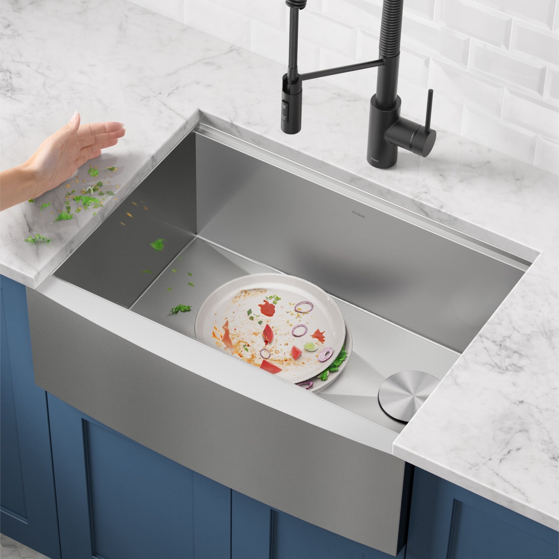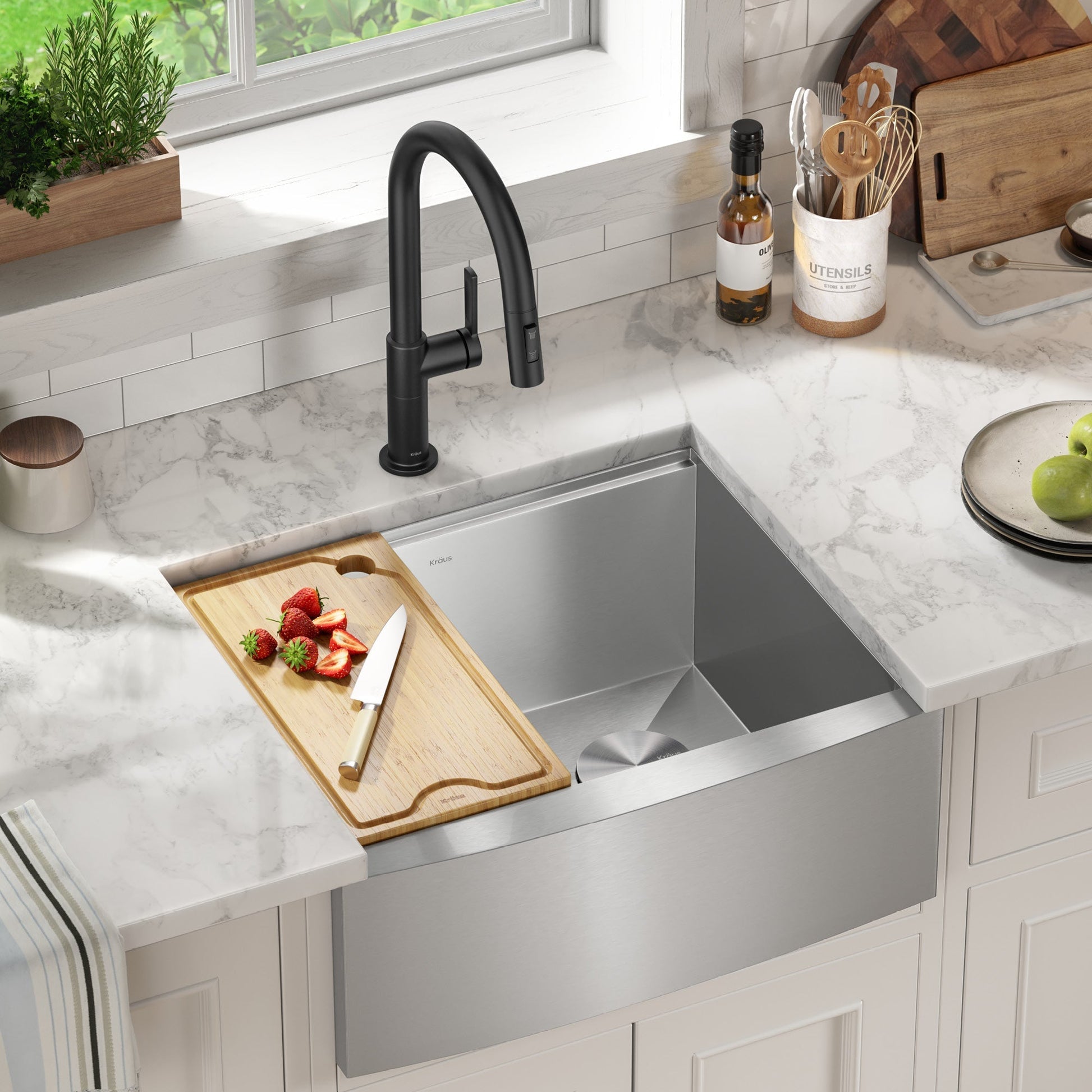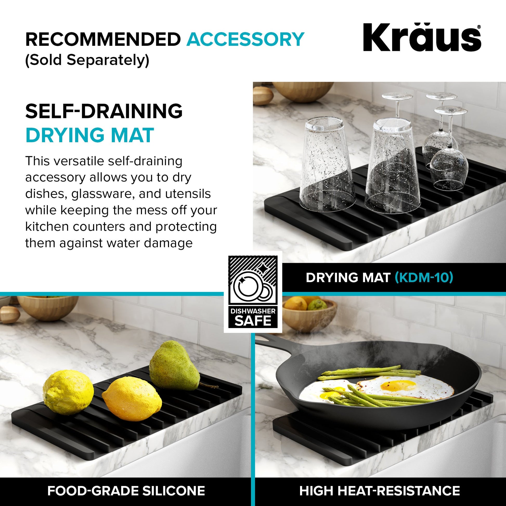 Cook, serve, and entertain in style with KRAUS Kore Workstation Sinks. Engineered with an integrated ledge to support custom sliding accessories, this sink creates a multifunctional workspace to streamline all your kitchen tasks from meal prep to cleanup. The sink kit includes a heavy-duty cutting board and roll-up dish rack that allow you to work right over the sink without losing any space on the kitchen counter. Featuring a clean, classically-inspired rounded apron front, this farmhouse sink creates a focal point with a distinctive modern look that fits perfectly into any environment, from traditional to transitional to urban kitchens. Installs as an undermount for a seamless transition between sink and countertop, with no exposed mounting deck to trap food for easy cleaning. Made with KRAUS TRU16 the thickest 16 gauge stainless steel for maximum durability and NoiseDefend sound dampening pads to absorb noise and vibration for an ultra-quiet experience. Wear-resistant finish is easy to clean and not prone to corrosion, while rounded corners reduce buildup over time. Channel grooves and a sloped bottom improve drainage, with a rear off-set drain that adds storage space underneath the sink. The installation-ready sink comes with a protective stainless steel bottom grid and drain assembly with matching cover for a clean look