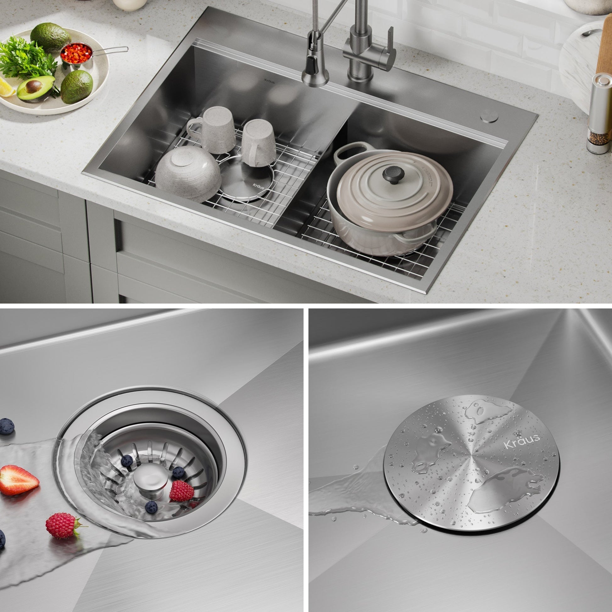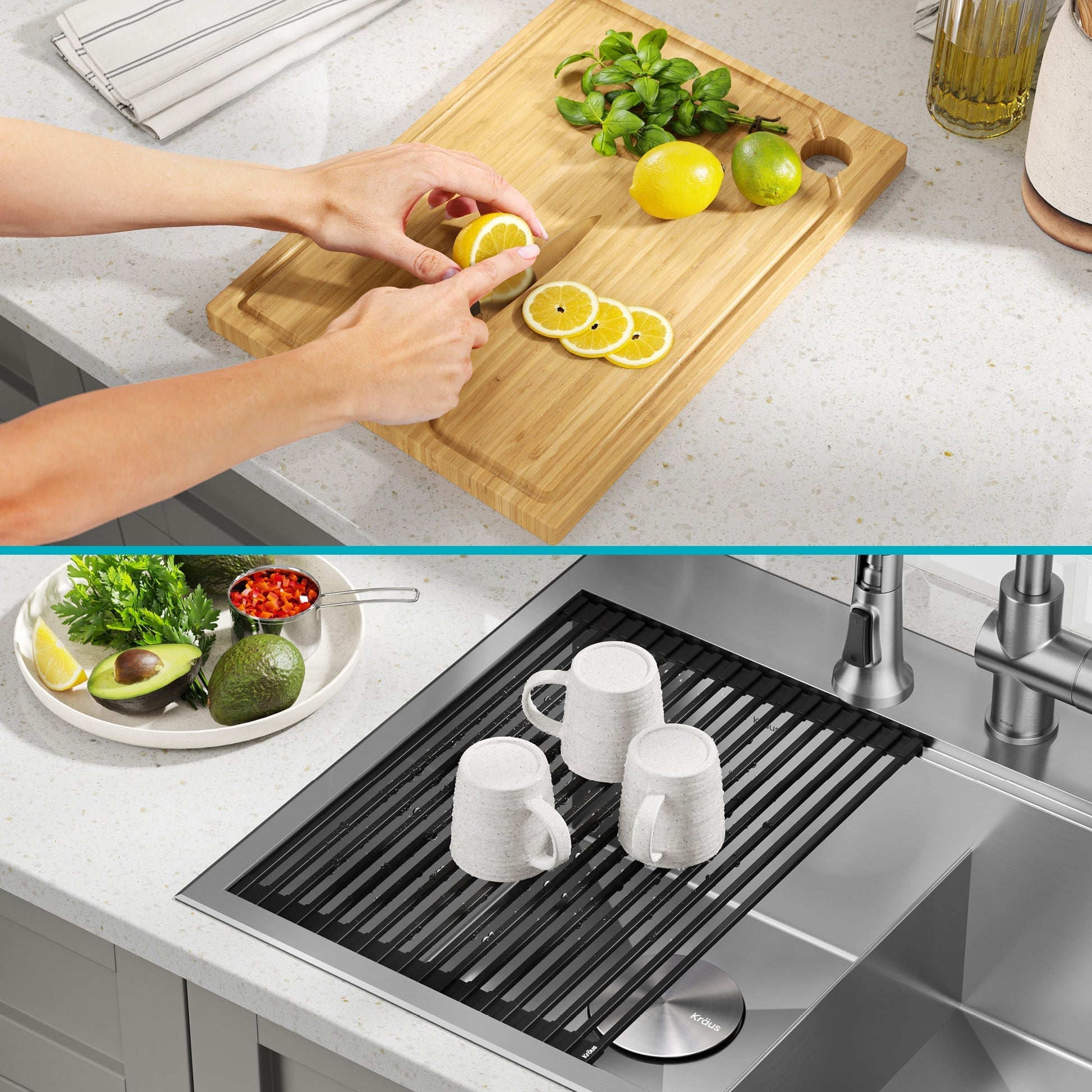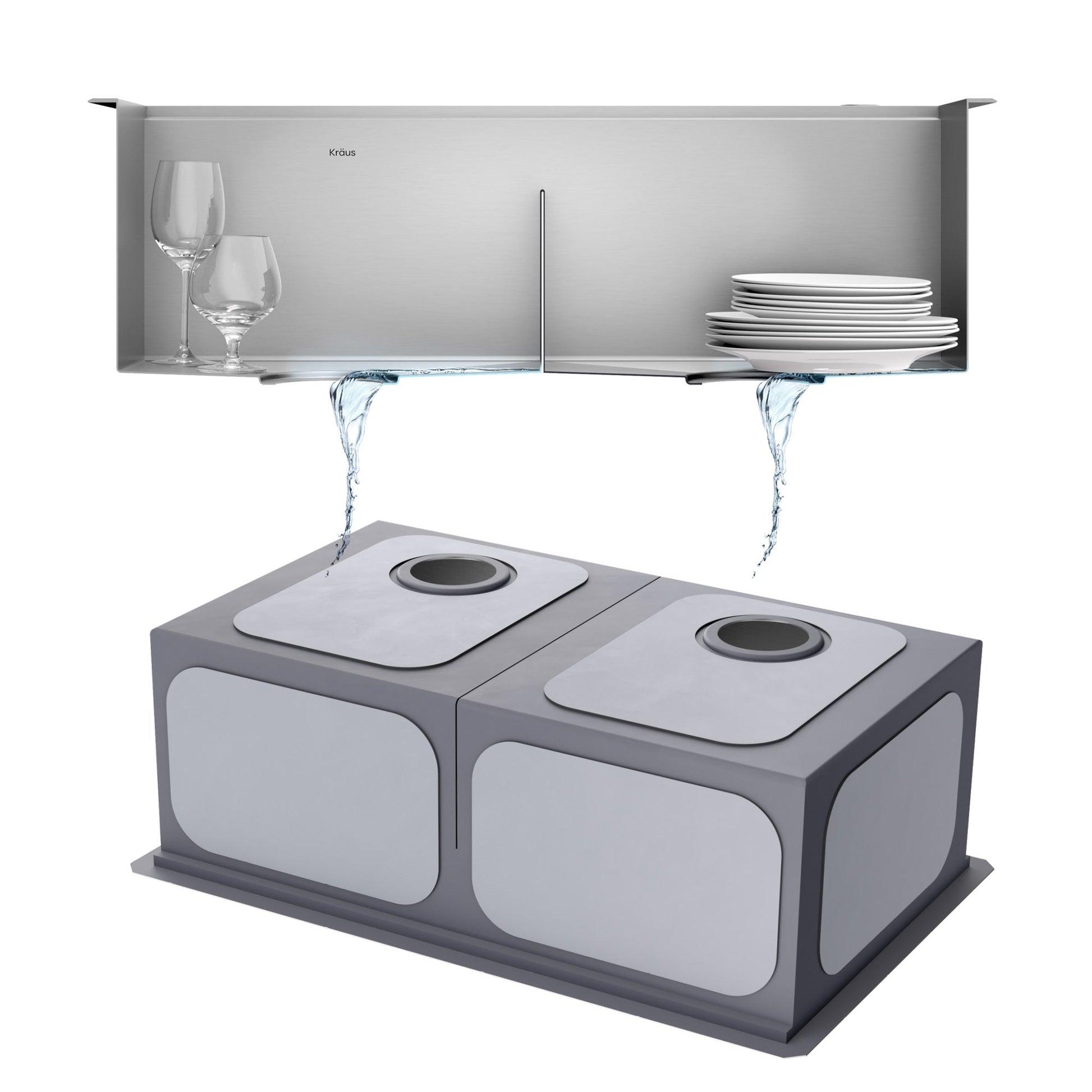 Cook, serve, and entertain in style with KRAUS Kore Workstation Sinks. Engineered with an integrated ledge to support custom sliding accessories, this sink creates a multifunctional workspace to streamline all your kitchen tasks from meal prep to cleanup. The kit includes a heavy-duty cutting board and roll-up dish rack that allow you to work right over the sink without losing space on the kitchen counter. Kore sinks are made with KRAUS TRU16, the thickest 16-gauge stainless steel for maximum durability. Ideal for retrofitting into an existing countertop cutout, the versatile dual-mount design installs as an undermount or drop-in with any type of kitchen counter material. The thick 4mm mounting deck sits flat against the countertop for a perfectly finished look, with two pre-drilled holes for installation of a kitchen faucet and soap dispenser. The double bowl sink with low divider is perfect for multi-tasking, with extra clearance for items like baking sheets and long-handled pans. Thick NoiseDefend sound dampening pads absorb noise and vibration for an ultra-quiet experience. Wear-resistant finish is easy to clean and not prone to corrosion, while rounded corners on the sink bottom reduce buildup over time. Channel grooves and a sloped bottom improve drainage, with rear center set drains that add storage space underneath the sink. The installation-ready sink comes with a protective stainless steel bottom grid and drain assembly with matching cover for a clean look