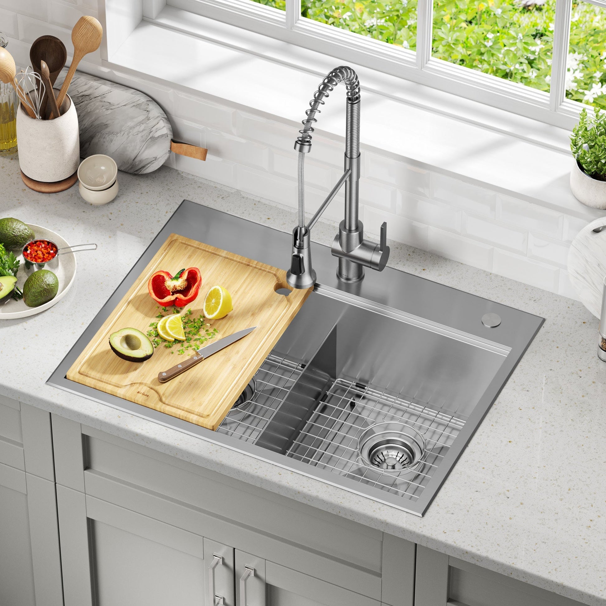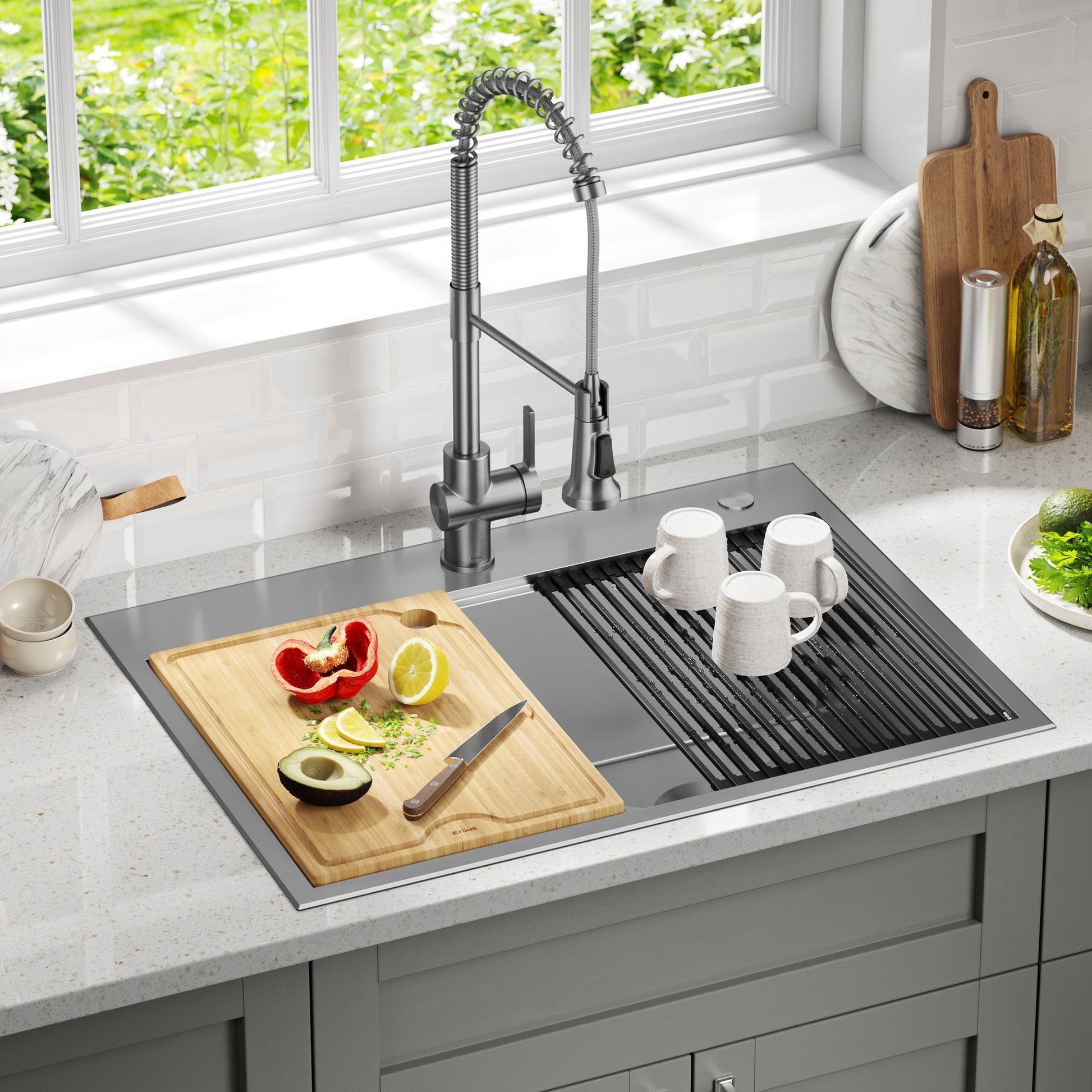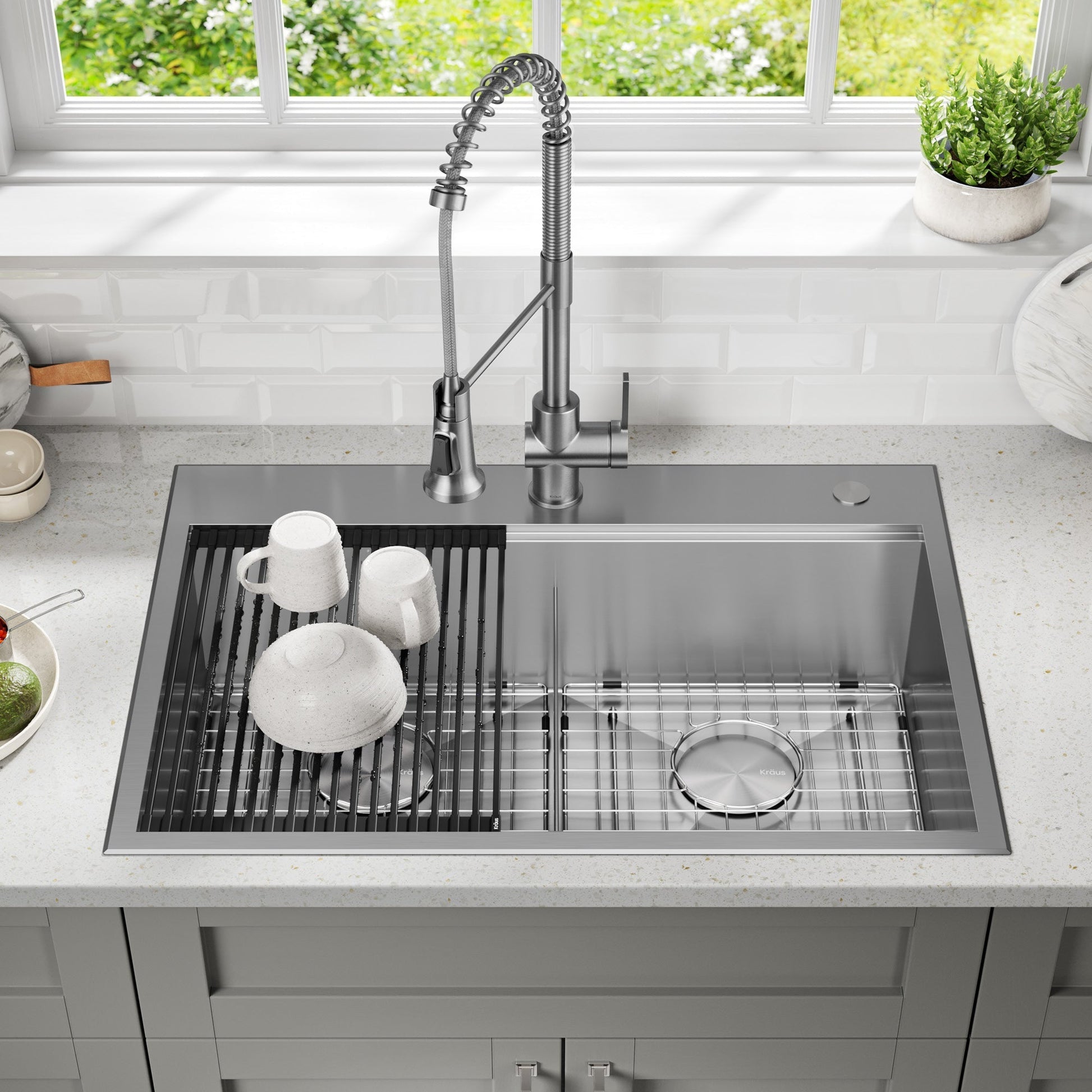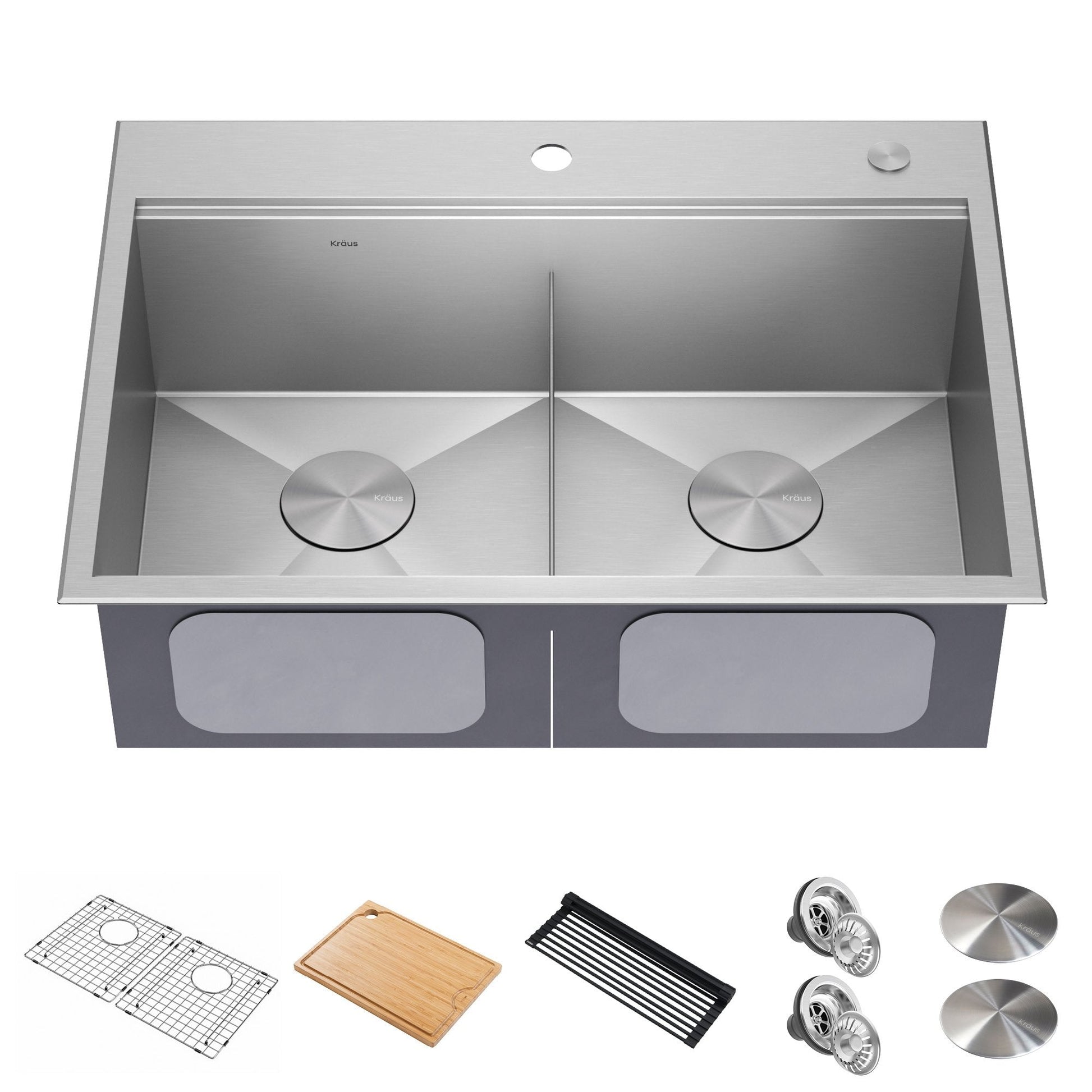 Cook, serve, and entertain in style with KRAUS Kore Workstation Sinks. Engineered with an integrated ledge to support custom sliding accessories, this sink creates a multifunctional workspace to streamline all your kitchen tasks from meal prep to cleanup. The kit includes a heavy-duty cutting board and roll-up dish rack that allow you to work right over the sink without losing space on the kitchen counter. Kore sinks are made with KRAUS TRU16, the thickest 16-gauge stainless steel for maximum durability. Ideal for retrofitting into an existing countertop cutout, the versatile dual-mount design installs as an undermount or drop-in with any type of kitchen counter material. The thick 4mm mounting deck sits flat against the countertop for a perfectly finished look, with two pre-drilled holes for installation of a kitchen faucet and soap dispenser. The double bowl sink with low divider is perfect for multi-tasking, with extra clearance for items like baking sheets and long-handled pans. Thick NoiseDefend sound dampening pads absorb noise and vibration for an ultra-quiet experience. Wear-resistant finish is easy to clean and not prone to corrosion, while rounded corners on the sink bottom reduce buildup over time. Channel grooves and a sloped bottom improve drainage, with rear center set drains that add storage space underneath the sink. The installation-ready sink comes with a protective stainless steel bottom grid and drain assembly with matching cover for a clean look