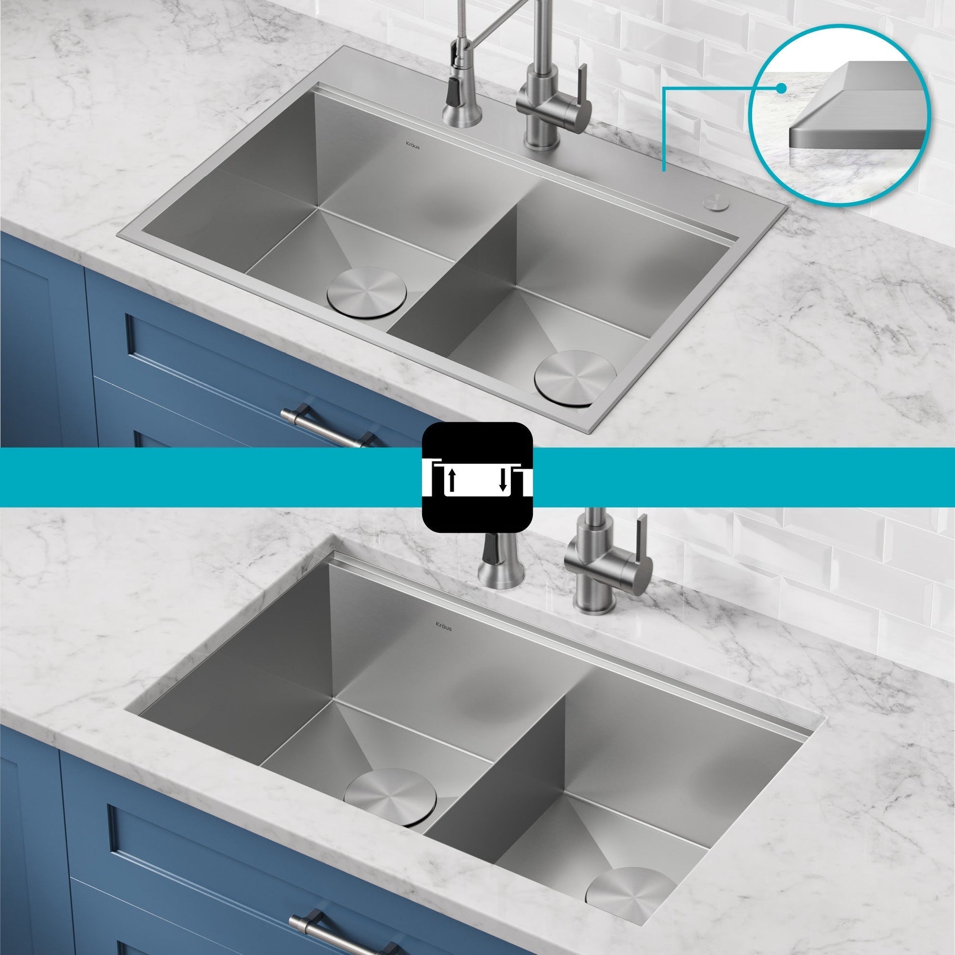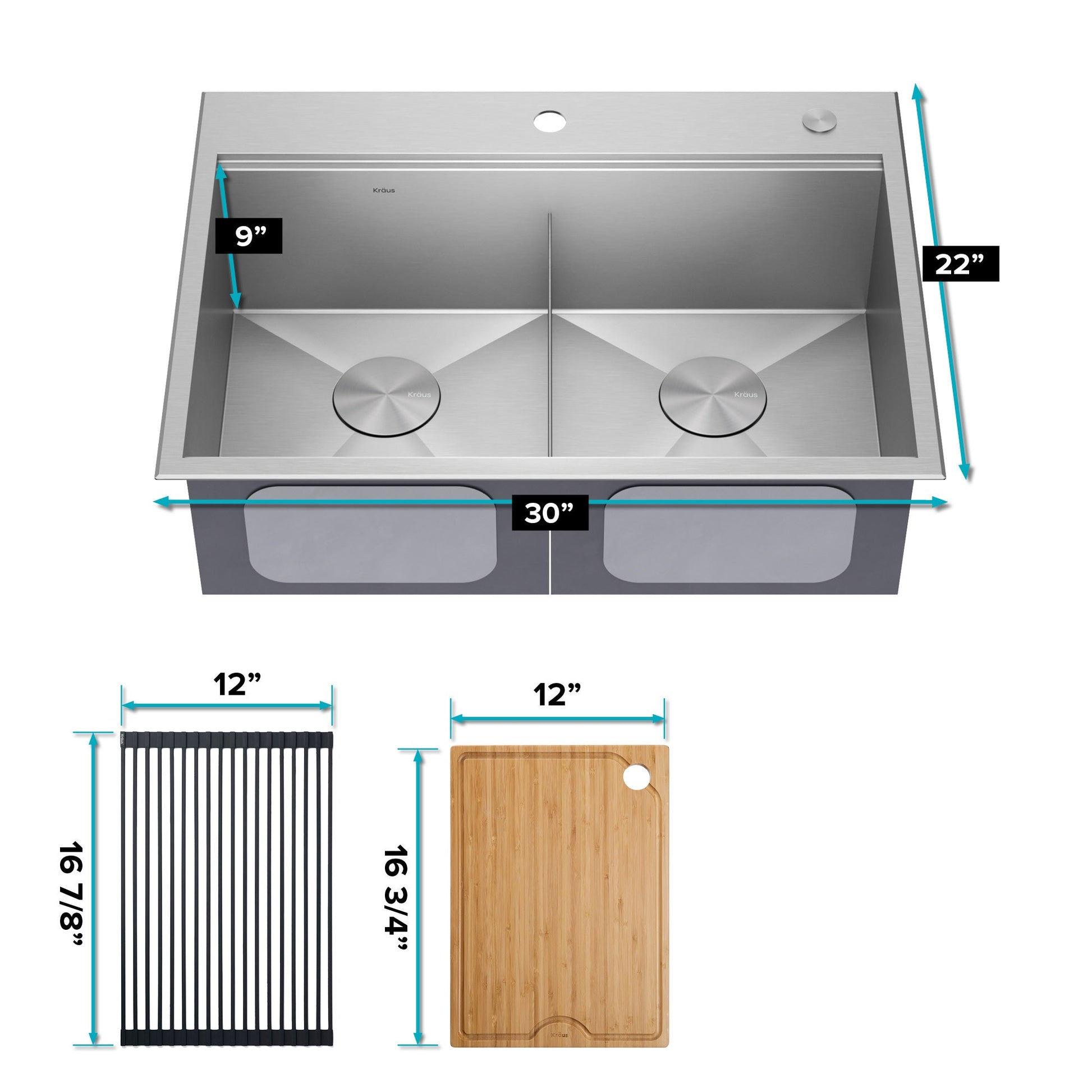Note from DirectSinks about the KWT302-30 - A 30" Double Bowl is not common, but often looked for when renovating a kitchen. This sink can be mounted in a 33" cabinet. (We like this sink because most double bowl sinks are too big and need a 36" cabinet.) This model from Kraus can easily be the best option if you need a 30" 50/50 Top Mount Sink. Bonus feature of this model is that the center divider is at a reduced height of 6" and a thinner profile An added perk that we like is that it is a workstation sink & 16 gauge. Although we show this sink as a Top Mount sink, this sink can also be undermouted according to Kraus. Either way, this is a great Double Bowl Workstation Sink for an 33" Cabinet.