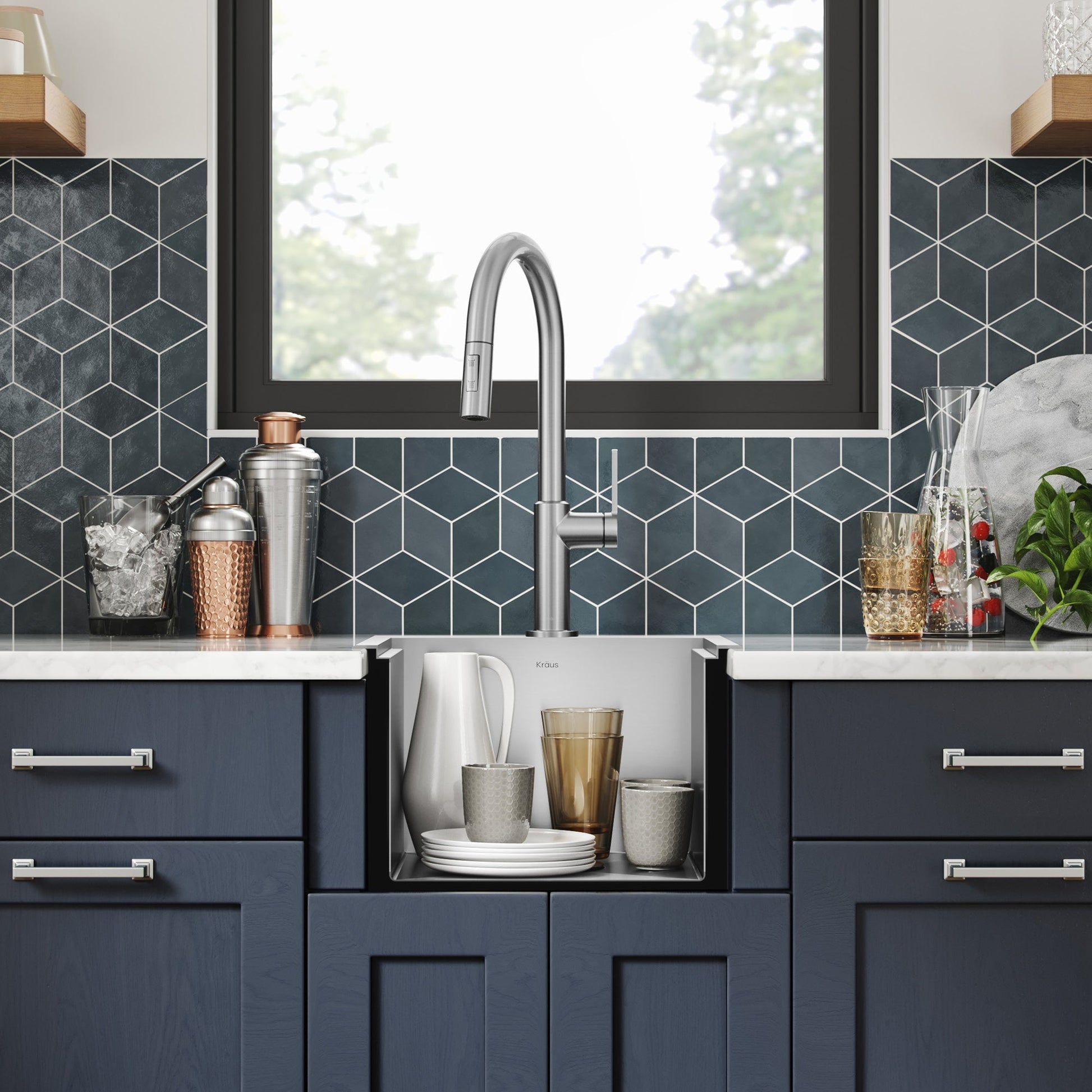 Cook, serve, and entertain in style with KRAUS Kore Workstation Sinks. Engineered with an integrated ledge to support custom accessories, this compact kitchen bar sink creates a multifunctional workspace that will supercharge the functionality of your bar or entertainment area. The space-saving design makes this sink ideal for use in galley kitchens, RVs, or as an auxiliary prep sink. The kit includes a durable bamboo cutting board/sink cover that extends your countertop space by allowing you to chop and slice right over the sink. Kore sinks are made with KRAUS TRU16 stainless steel our thickest 16-gauge steel for maximum durability with resistance to dents and damage. Perfect for DIY installation, the drop-in design installs as a top mount with any type of countertop material. The extra-thick mounting deck sits flat against the countertop for a perfectly finished look, with a beveled edge for easy cleaning and 1 pre-drilled hole for easy installation of a kitchen or bar faucet. Thick NoiseDefend sound dampening pads help absorb noise and vibration. The wear-resistant finish is easy to clean and not prone to corrosion, while rounded corners on the sink bottom reduce buildup over time. Channel grooves and a sloped bottom help improve drainage, with a rear-set drain that adds storage space underneath the sink. The installation-ready kit comes with mounting hardware and a drain assembly with matching cover.