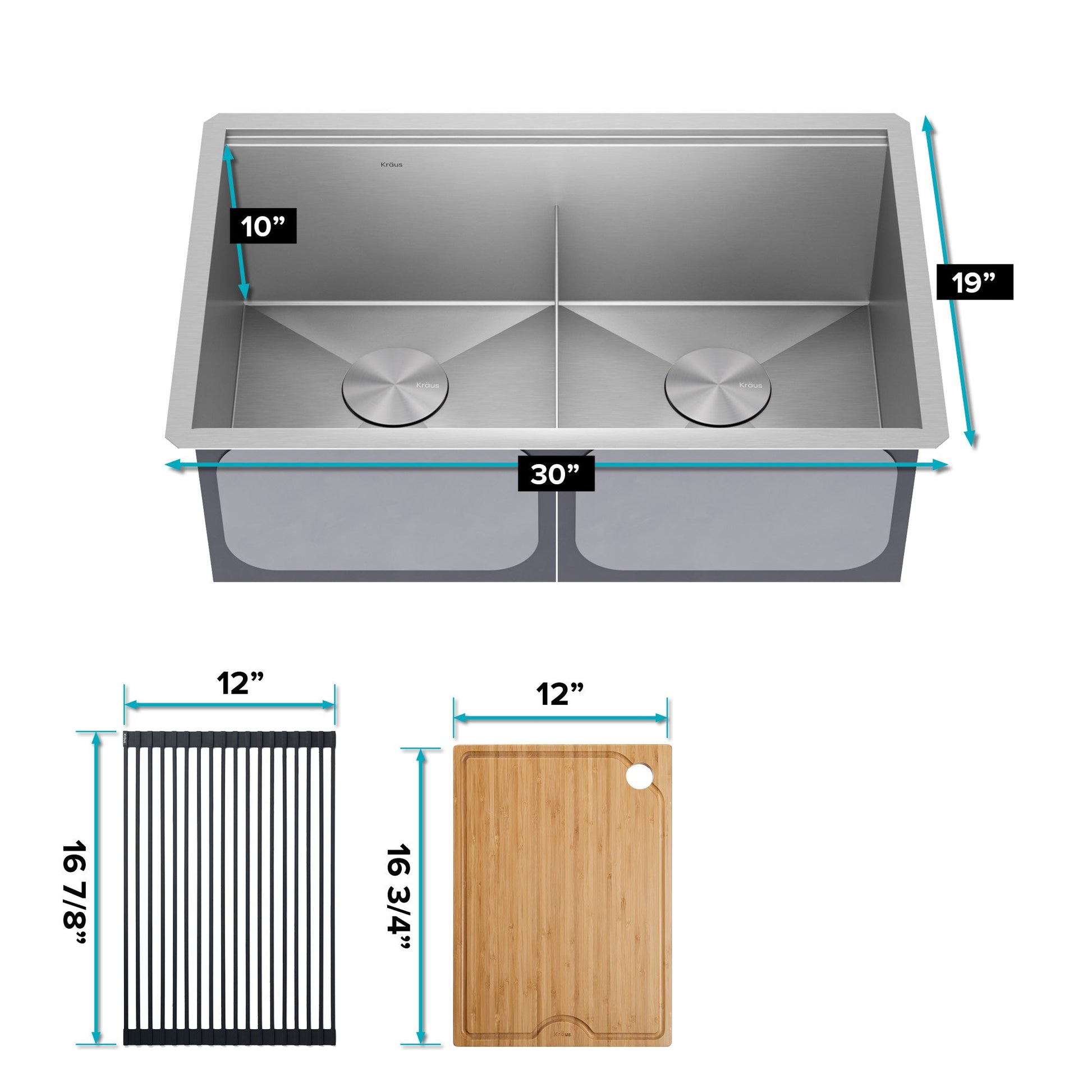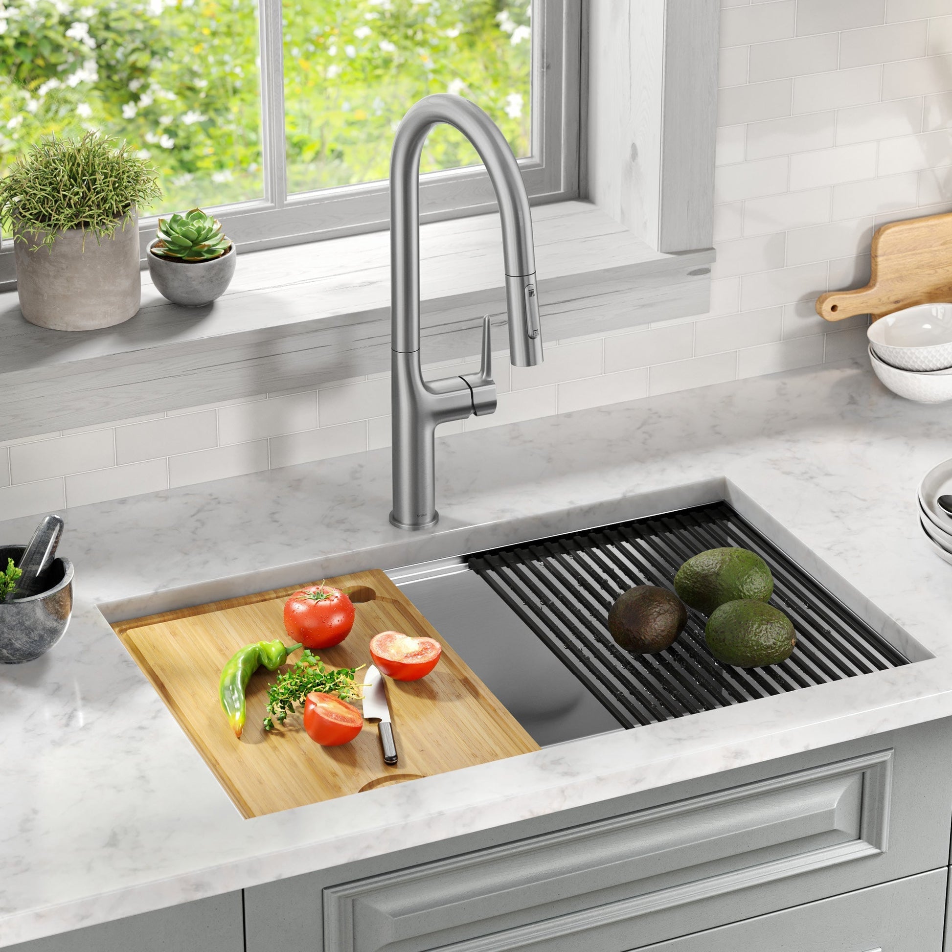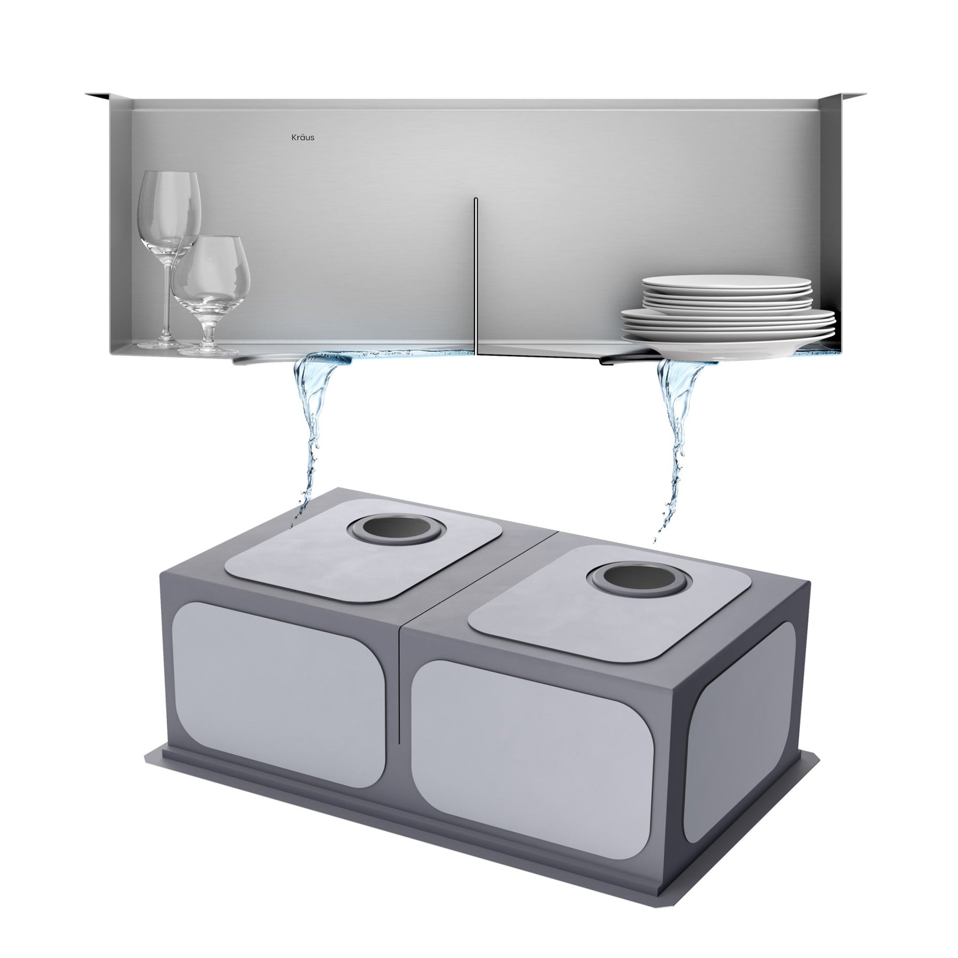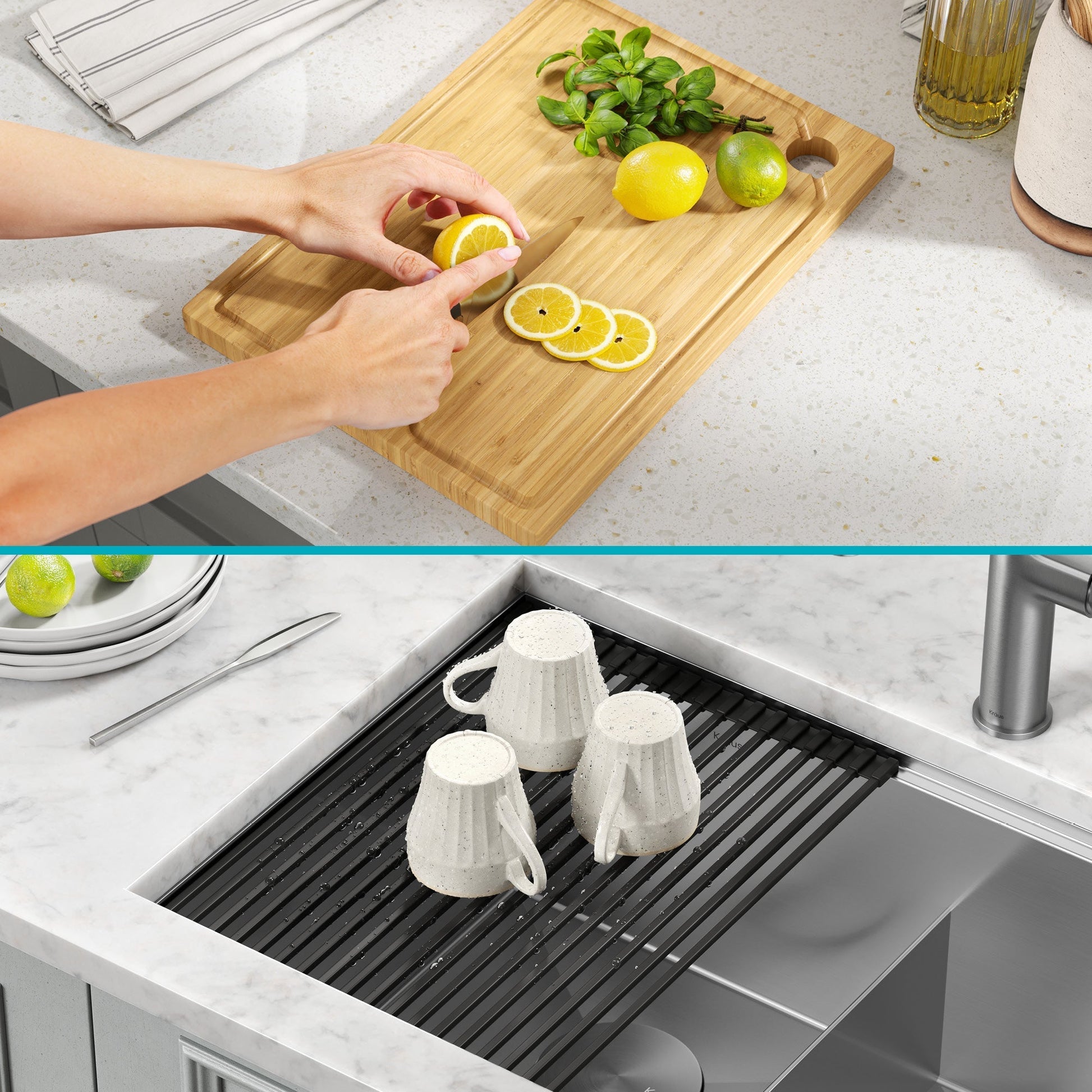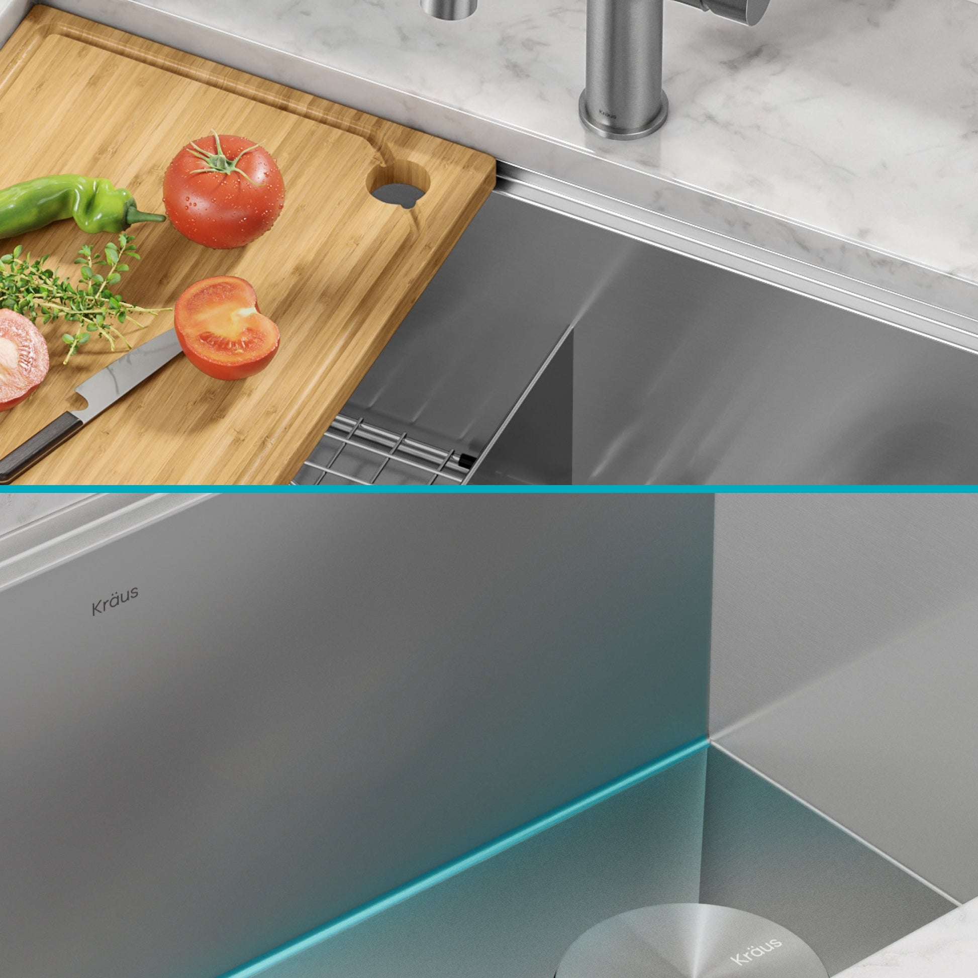 Cook, serve, and entertain in style with KRAUS Kore Workstation Sinks. Engineered with an integrated ledge to support custom sliding accessories, this sink creates a multifunctional workspace to streamline all your kitchen tasks from meal prep to cleanup. The kit includes a heavy-duty cutting board and roll-up dish rack that allow you to work right over the sink without losing space on the kitchen counter. Kore sinks are made with KRAUS TRU16 the thickest 16-gauge stainless steel for maximum durability.Â