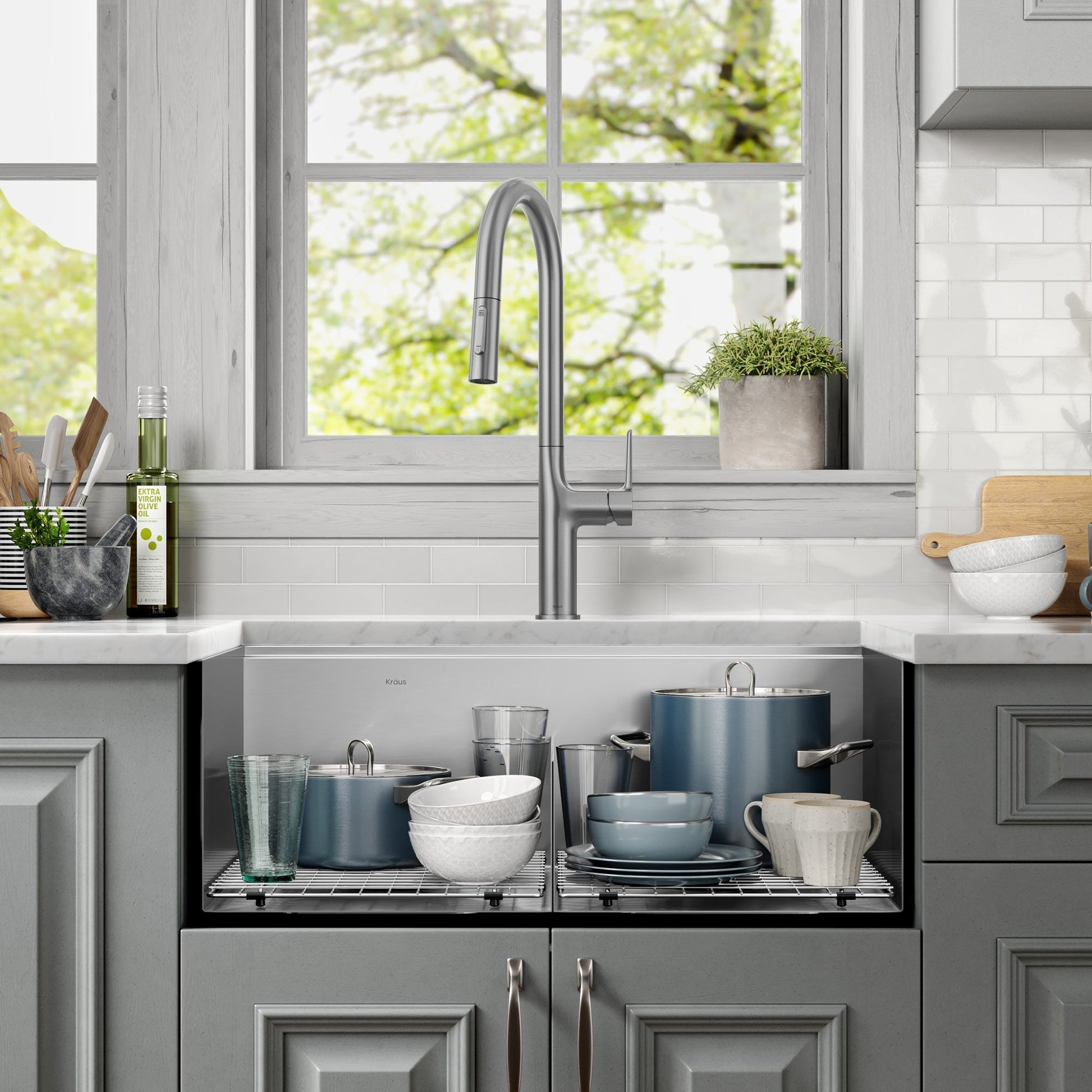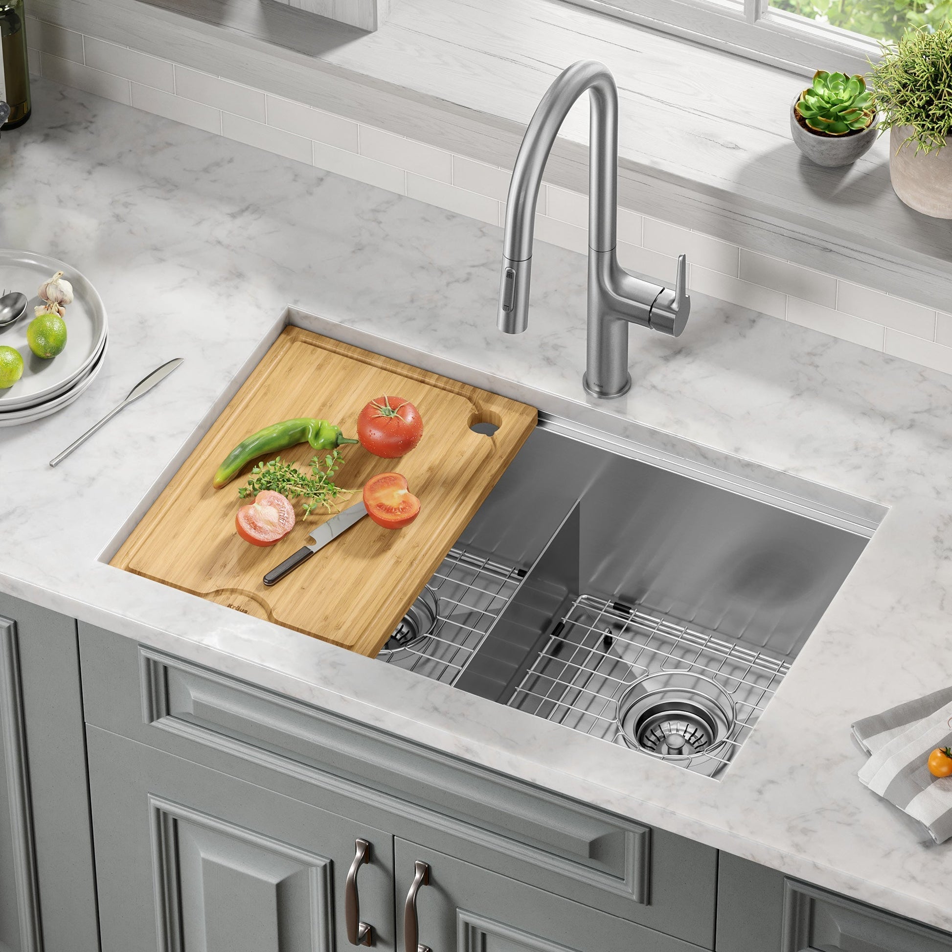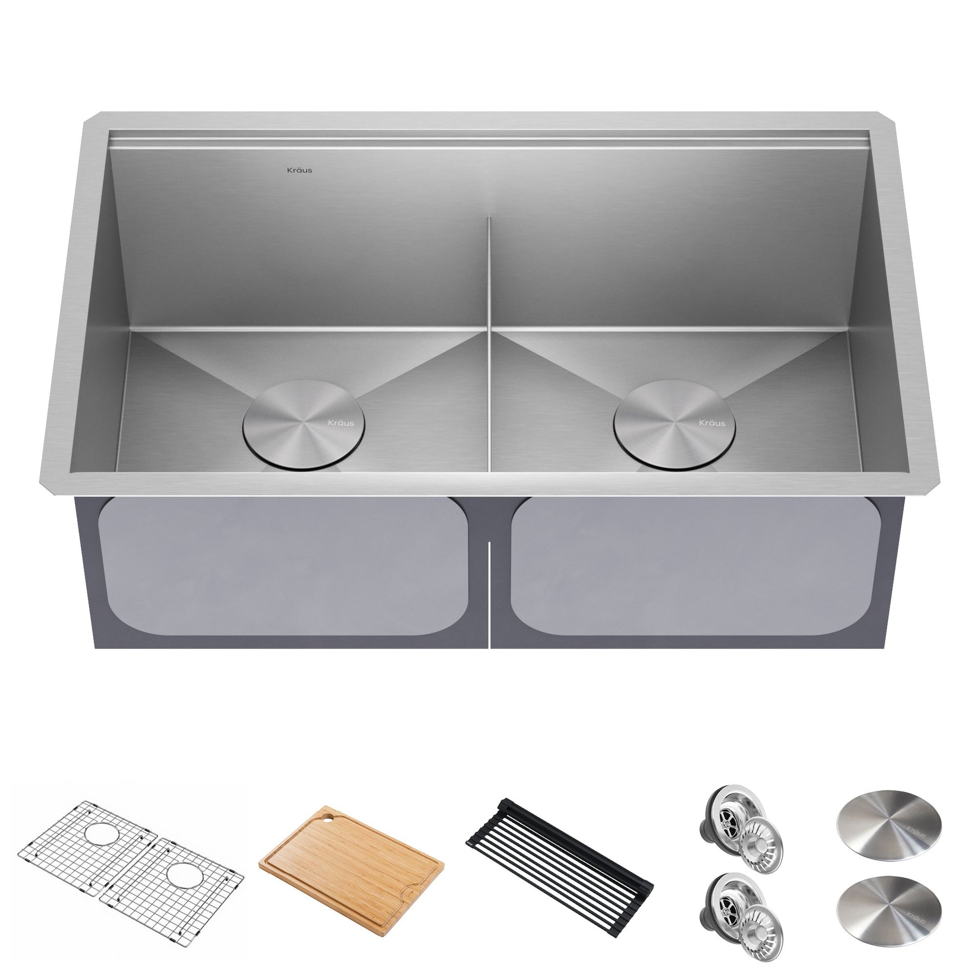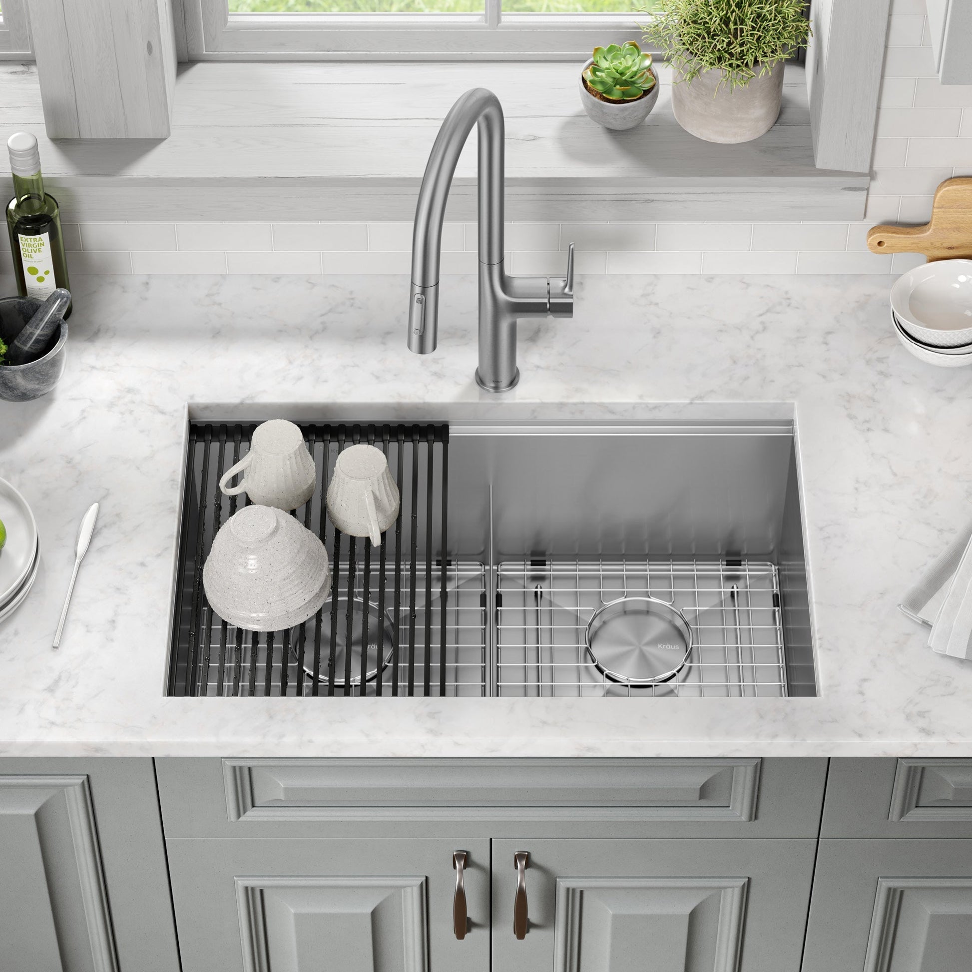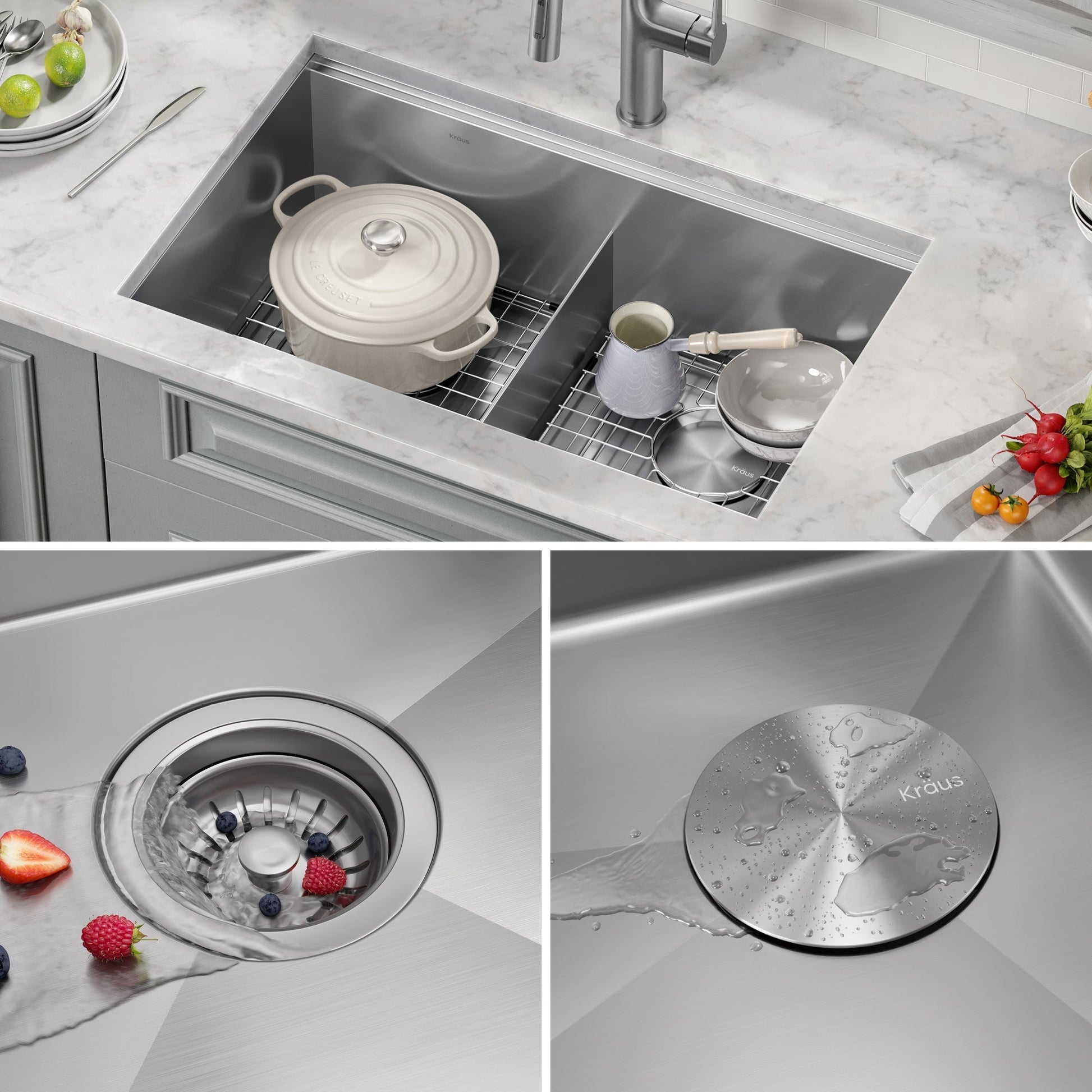 Cook, serve, and entertain in style with KRAUS Kore Workstation Sinks. Engineered with an integrated ledge to support custom sliding accessories, this sink creates a multifunctional workspace to streamline all your kitchen tasks from meal prep to cleanup. The kit includes a heavy-duty cutting board and roll-up dish rack that allow you to work right over the sink without losing space on the kitchen counter. Kore sinks are made with KRAUS TRU16 the thickest 16-gauge stainless steel for maximum durability.Â
