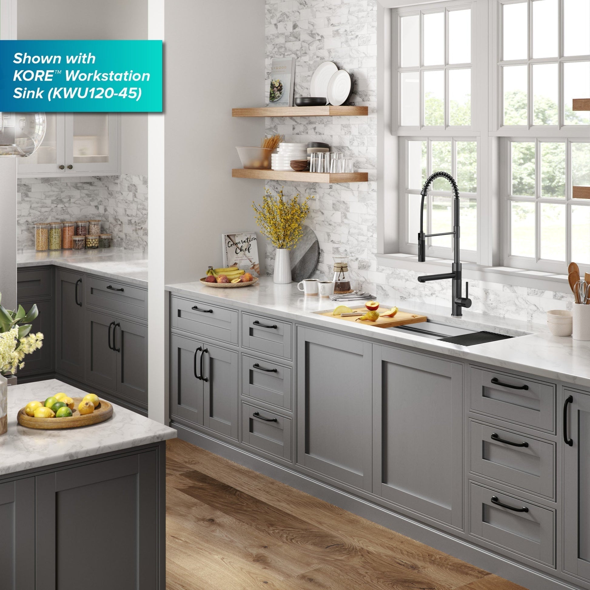 - COMMERCIAL-STYLE FAUCET with an industrial open-coil spout, pull-down sprayer, and rotating pot filler offers a distinctively professional look that will elevate the style of any kitchen