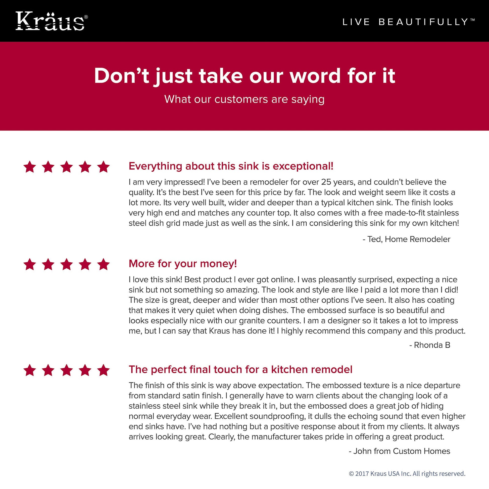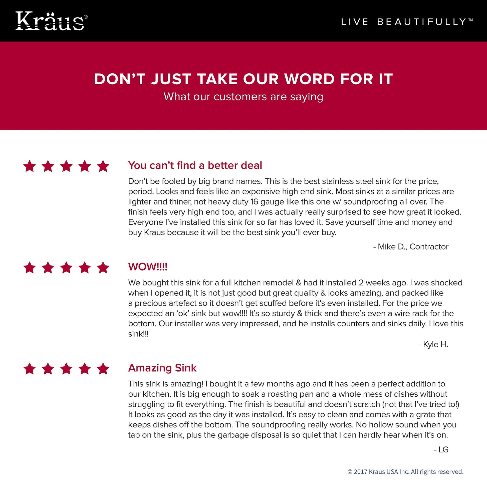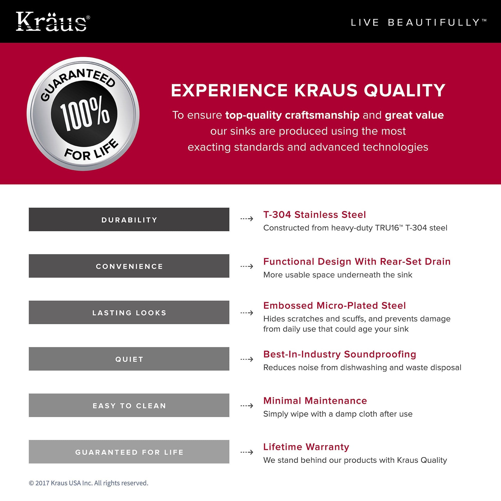 KRAUS TRU16: Real 16-gauge industrial grade stainless steel, always 1.5mm. Durable and dent-resistant, thicker than competitor products