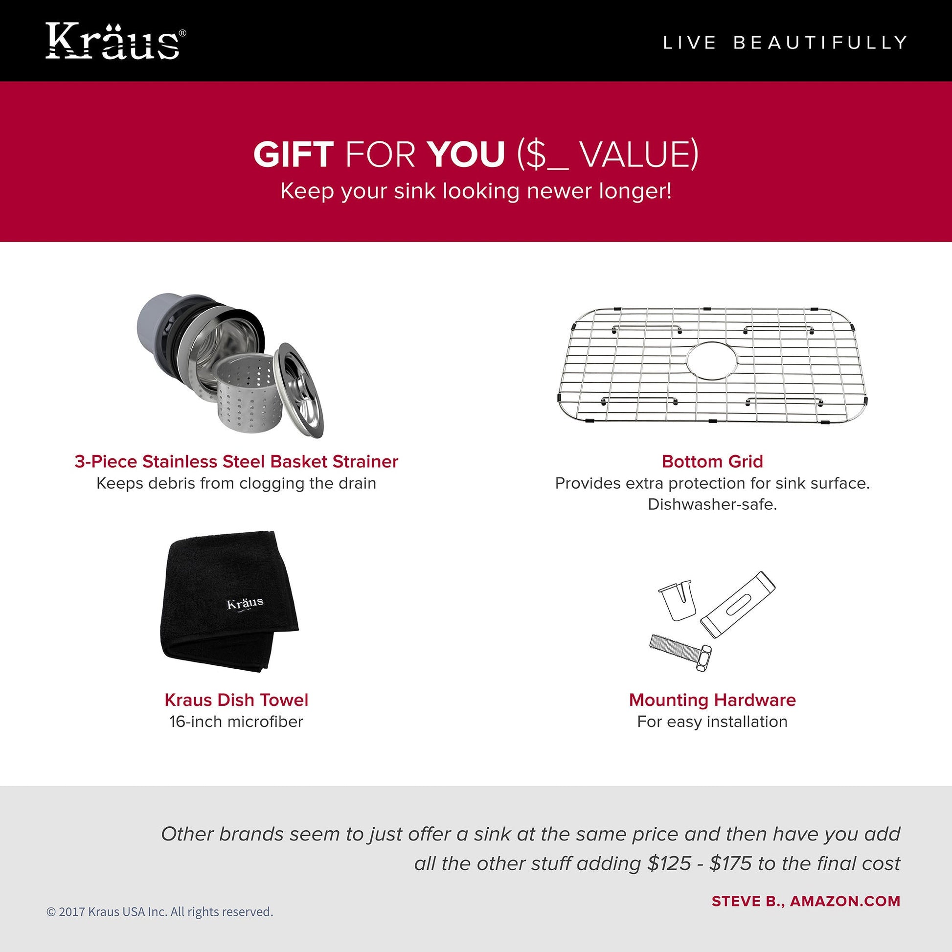 FREE KITCHEN ACCESSORIES: Bottom Grid KBG-14, 3-Piece Basket Strainer, KRAUS 100% Cotton Dish Towel, all packaged with sink in a premium KRAUS Utility Bag