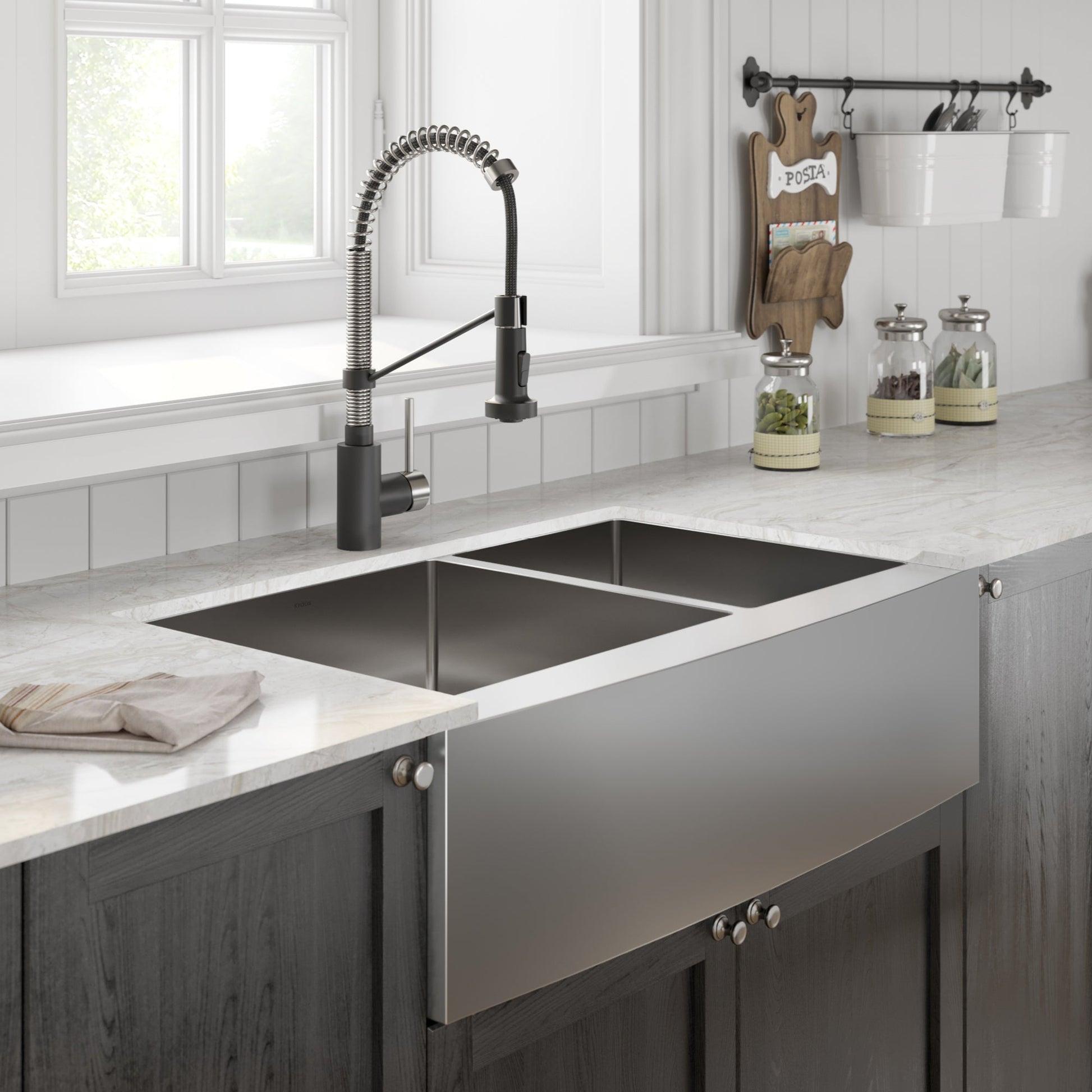 Enjoy the advantage of high-end kitchen sinks without the high price tag with the best-selling Standart PRO Farmhouse Series by KRAUS. This KRAUS sink features a contemporary twist on the classic apron front design, for an effortlessly stylish look that enhances any kitchen. Industrial-grade corrosion-resistant T304 stainless steel and extra-thick TRU16 real 16-gauge construction offer rugged durability. Award-winning NoiseDefend technology insulates the basin with superior soundproofing. A deep bowl offers plenty of room for all your dishes, while gently rounded corners make this sink easy to clean. Commercial-grade satin finish offers lasting protection, with a beautiful sheen that complements any kitchen decor. A rear-set drain ensures optimal drainage even with dishes in the basin, while engineered channel grooves help direct water to the drain, for a clean and quick-drying sink.
