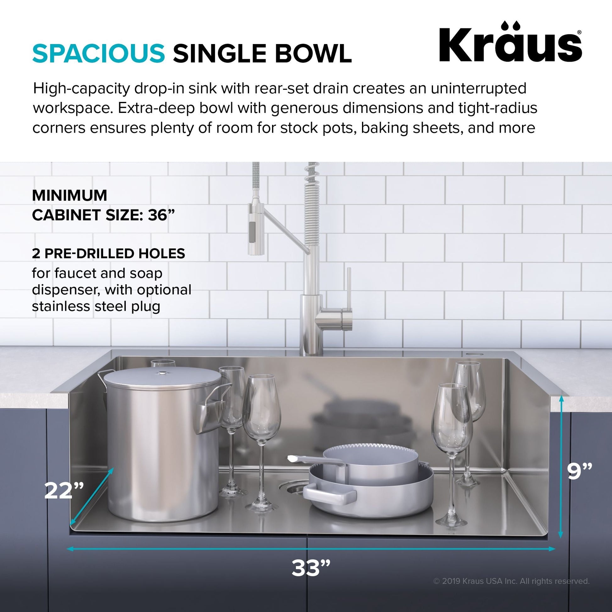 SINK DIMENSIONS: 33 in. L x 22 in. W x 9 in. H, Minimum Cabinet Size 36 in.