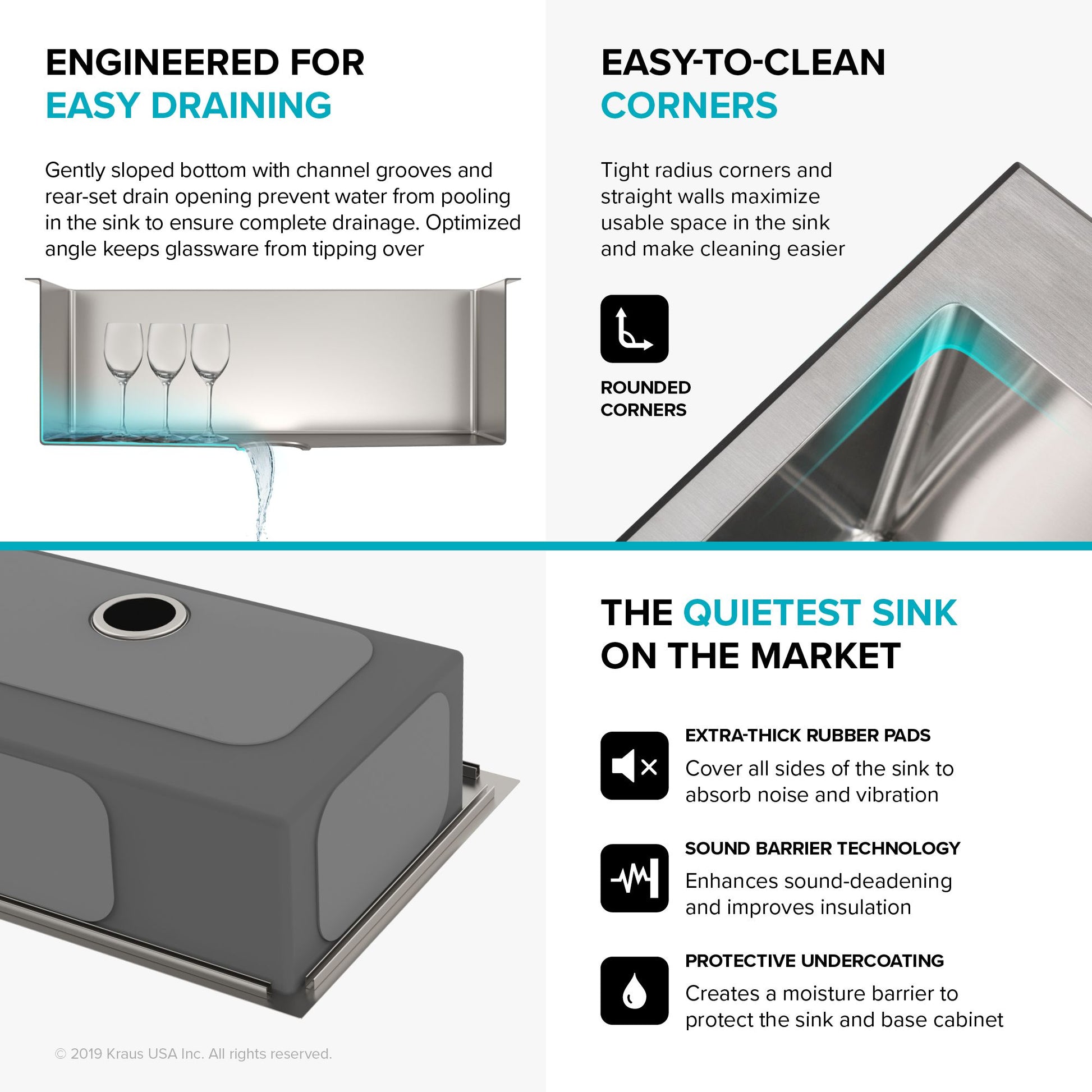 Stark is everything that a kitchen combo should be, pairing an ultra-modern stainless steel sink with an industrially-inspired pull down faucet to maximize functionality with bold contemporary style. A convenient dual mount design allows you to install this sink as an undermount, or as a drop-in with any type of kitchen counter.Featuring tight-radius corners, straight walls, and a rear center-set drain, the high-capacity sink offers a sleek modern look that's hard to find in a drop-in configuration. Handcrafted from highest quality T304 stainless steel for maximum durability and a lifetime of worry-free use. A gently sloped bottom and creased channel grooves allow for superior drainage. Designed with an optimized 18-inch height that fits under any kitchen cabinet, the commercial-style faucet features a pull-down sprayhead with 20-inch reach for optimal efficiency. Enjoy the unparalleled quality and superior style of Stark, and build your perfect kitchen with KRAUS