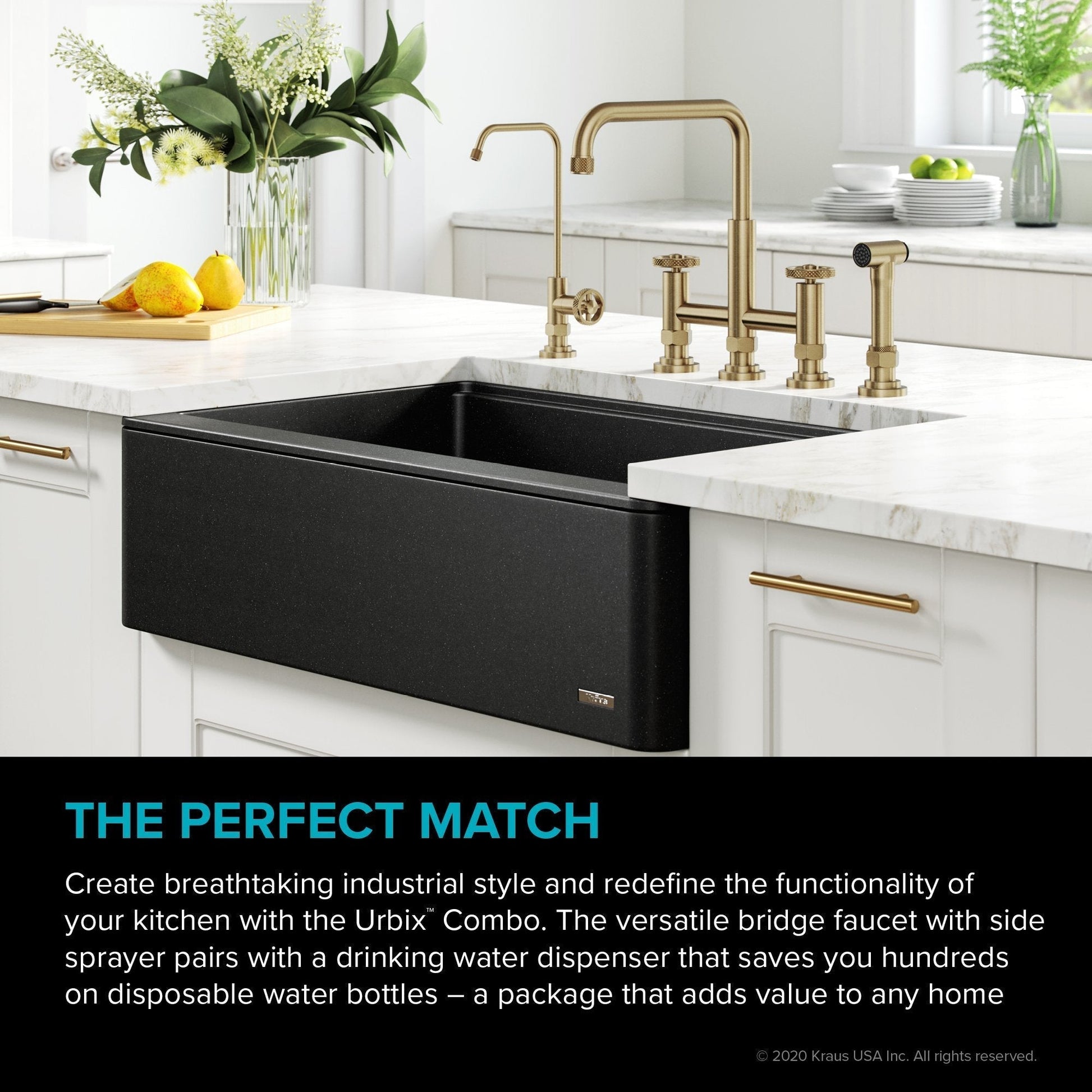 Create breathtaking modern style and redefine the functionality of your kitchen with the Urbix Faucet Combo. Diamond-textured handles and hexagonal bolt-shaped details create a bold industrial aesthetic. Made with lead-free solid brass, the versatile bridge faucet with side sprayer combines with a matching filter faucet that saves you money by eliminating the need for bottled water - a package that adds value to any home! The 2-function bridge faucet includes a side sprayer that provides superior maneuverability, allowing you to reach every hard-to-get spot in and around your kitchen sink. For added flexibility, the spout height can be adjusted up to 1 inch, with a locking feature to ensure stability. The drinking water faucet provides filtered water on demand and connects to a range of under-counter purification systems for water that's free of bacteria, heavy metals, and trace chemicals (filtration system sold separately). The high-arc spout is perfect for filling glasses, pitchers, and reusable water bottles. Heavy-duty solid brass construction ensures reliable long-lasting use. Enjoy the perfect combination of quality and enhanced functionality for a healthier home!