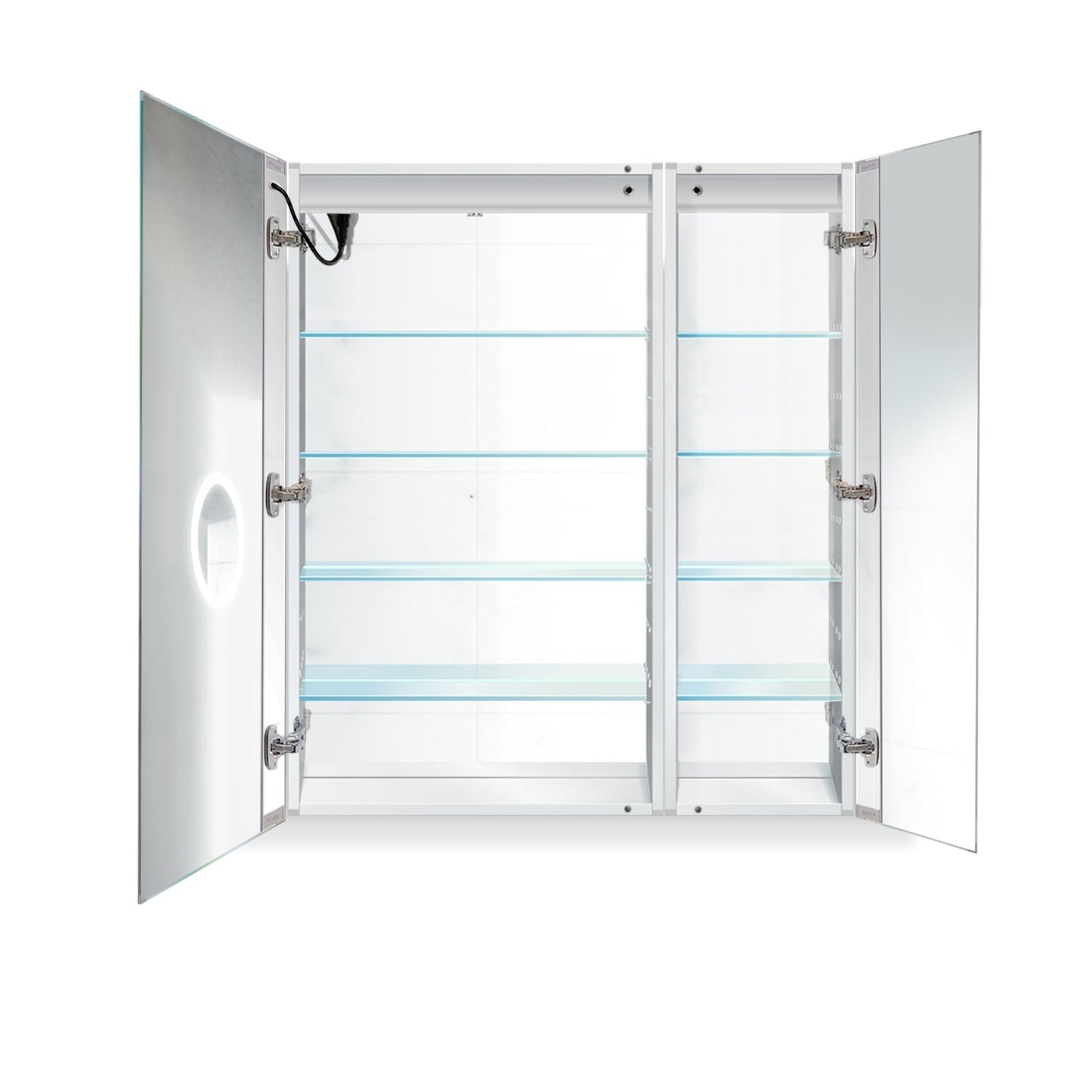Open the lighted section cabinet to reveal the full suite of amenities. In the mirrored door, a 3x magnified, LED-lit mirror is perfect for detailed makeup application. The mirrored interior is illuminated automatically for a luxurious touch. Our wide-angle hinges provide freedom of motion and panorama. The 2+2 smart outlet contains two traditional outlets and two USB interfaces to keep beauty tools, as well as a smartphone or tablet, close at hand. We ensure reliable optical clarity with active defogging technology. This LED Medicine Cabinet is limited only by your imagination.