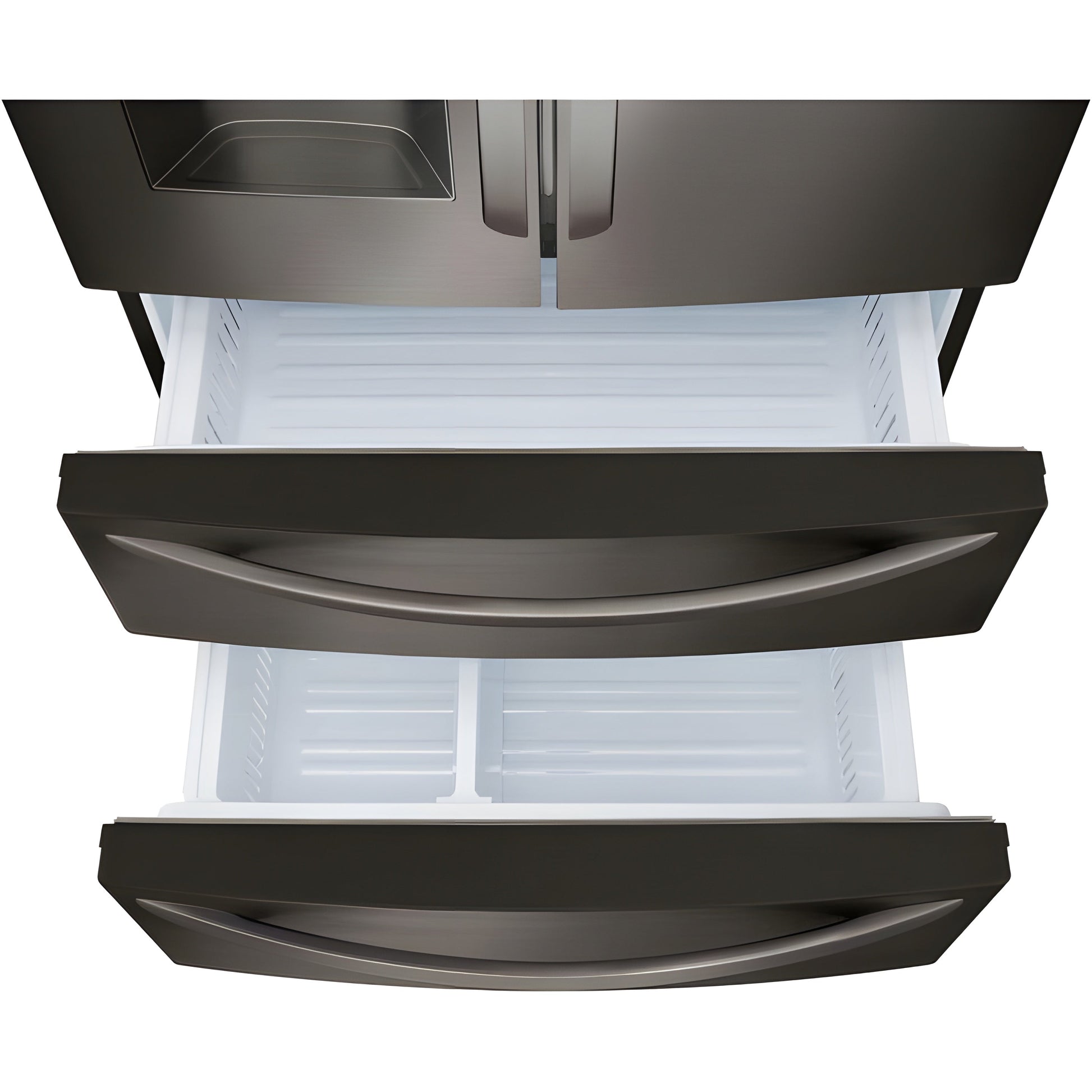 A: This 28 cu. ft. refrigerator offers a spacious 4-door design, advanced cooling features, and a sleek black stainless steel finish for a modern look and efficient food storage.