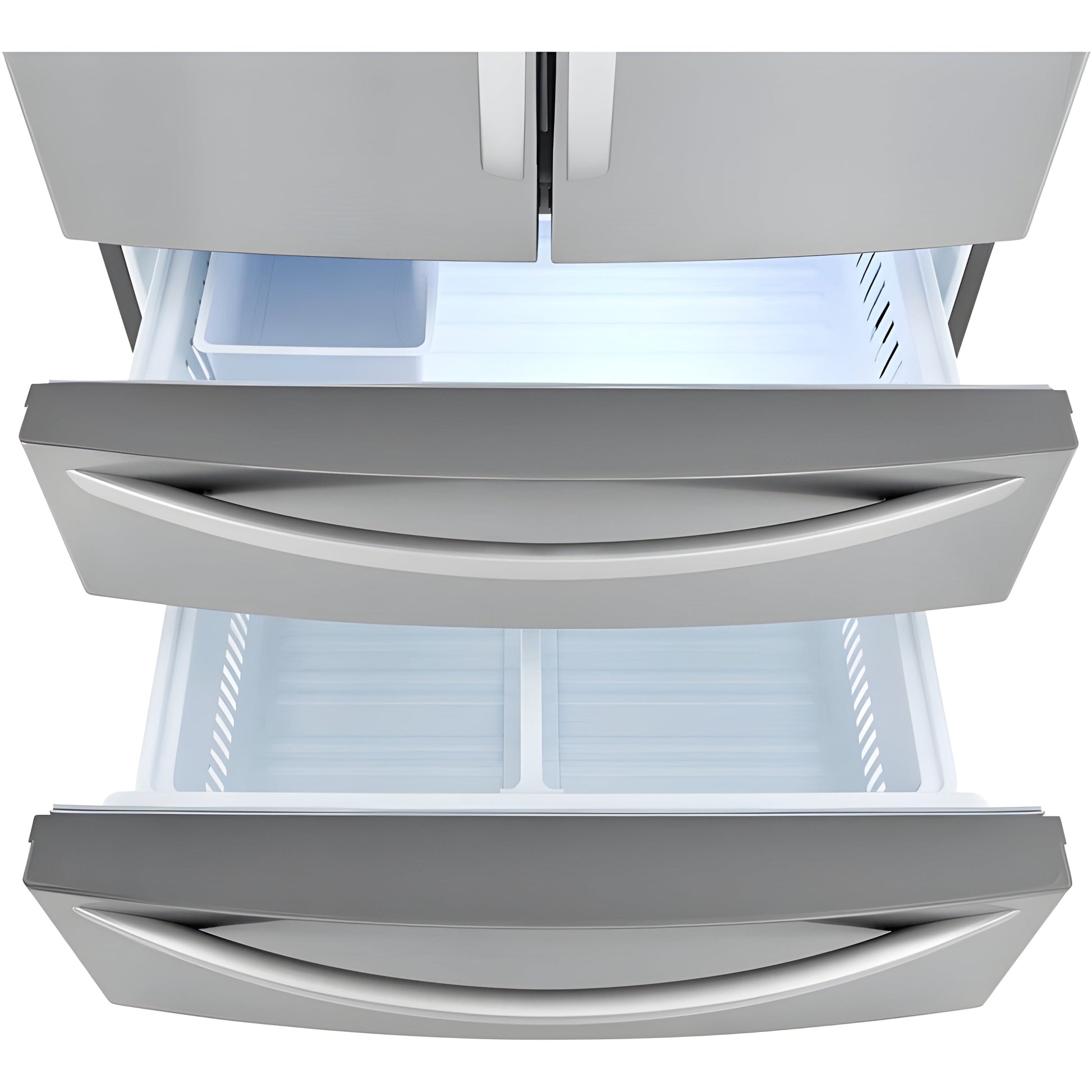 The LG 4-door French door refrigerator features a large 27.0-cu. ft. interior capacity. Enjoy a double pull-drawer style bottom freezer with 2-tiers for simple organization. The Door Cooling + vent allows cool air to reach all areas of the refrigerator to help maintain consistent temperatures.