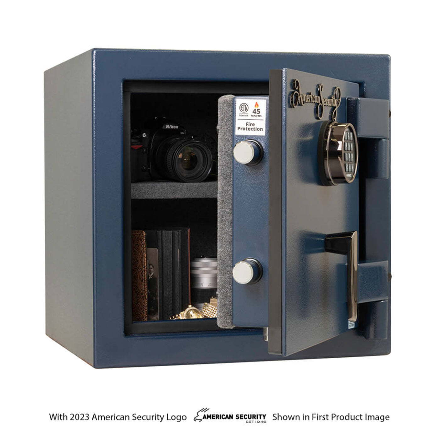 New for 2017 models, the AMSEC AM2020 features a black chrome lock, handle and American security logo along with a gray fabric interior and one adjustable shelf. These safes are attractive with their deep blue powder-coated finish.