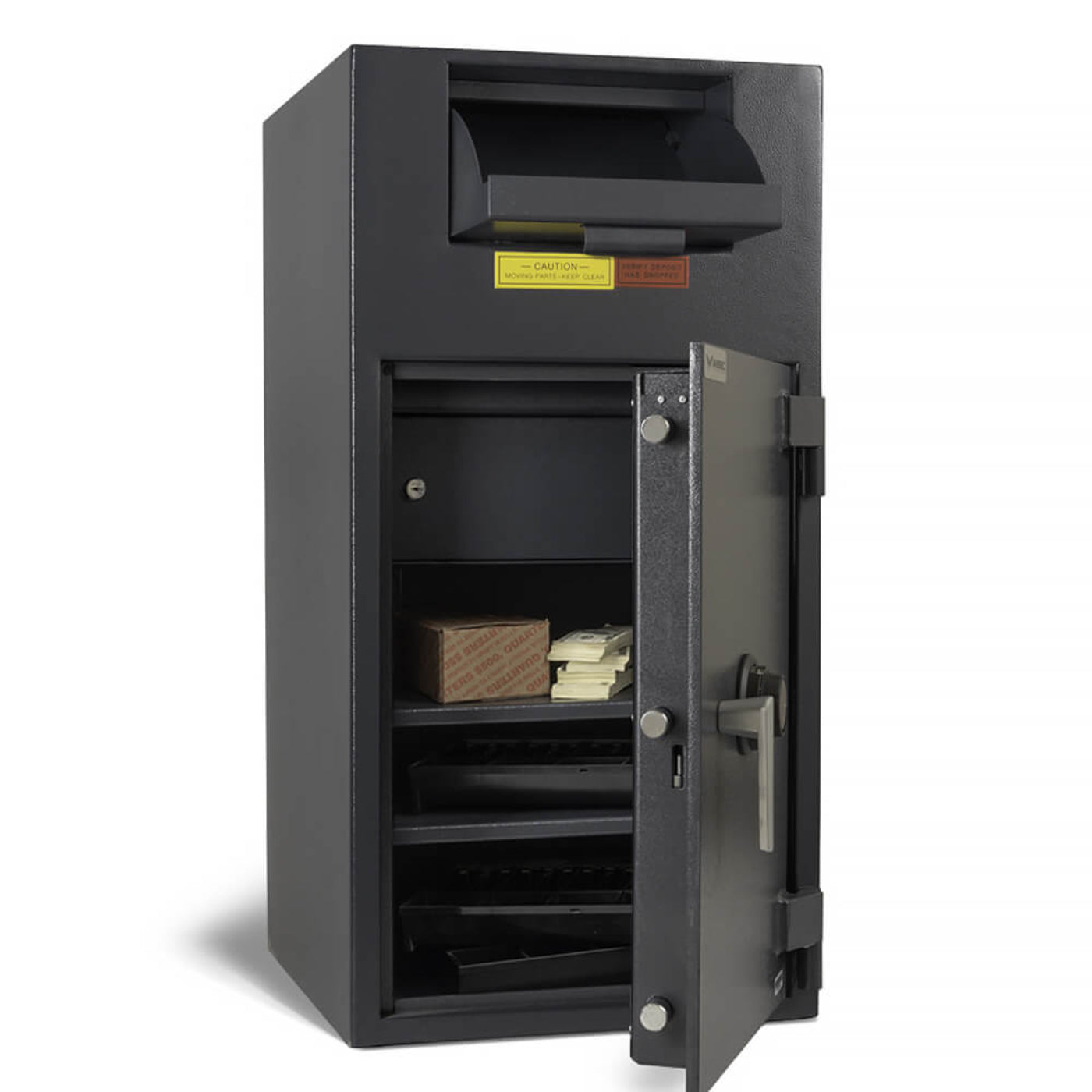 The depository door is a recessed heavy duty 1/8" door protected by dual anti-fish baffles and a maximum capacity of: 4" x 9" x 11-1/2".