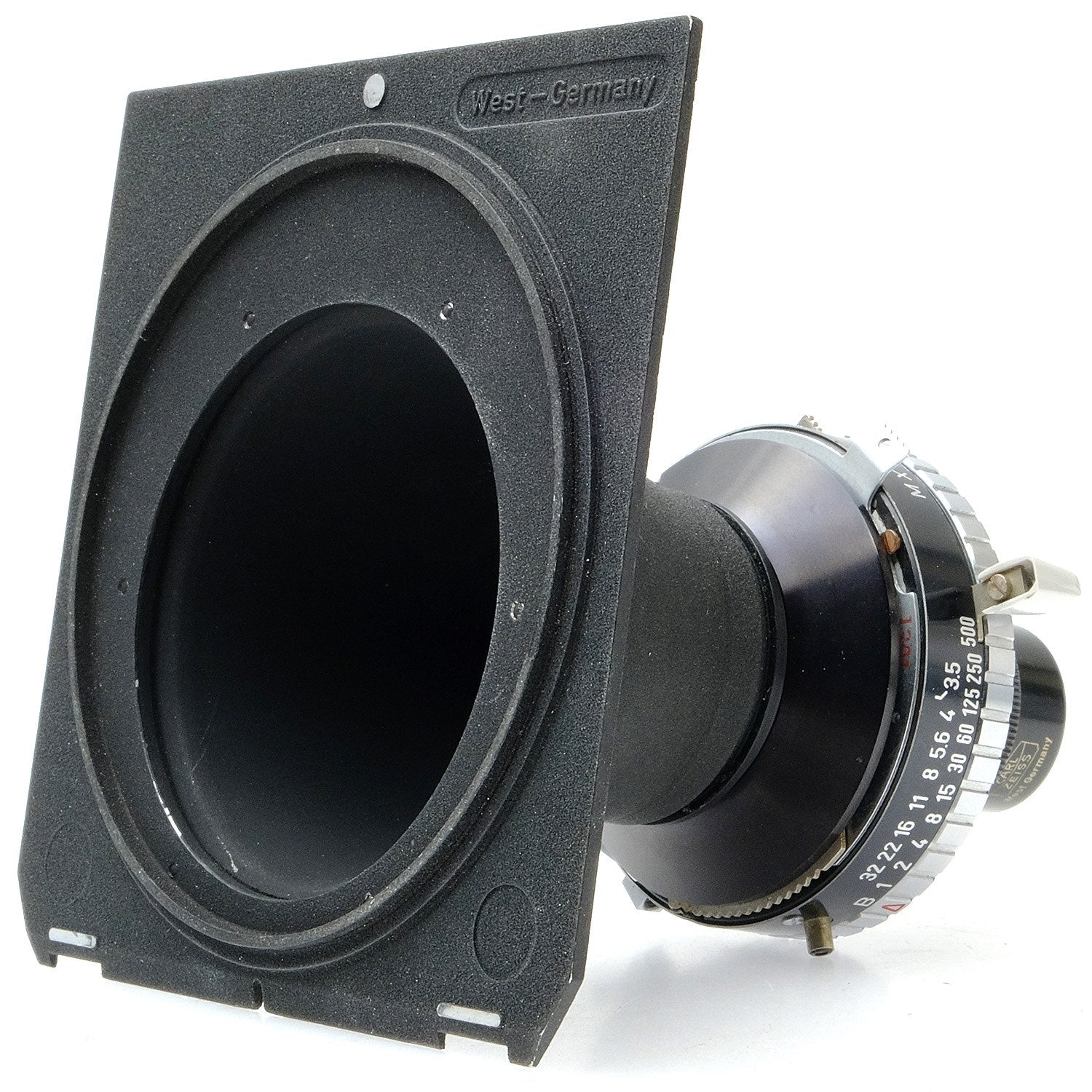 This Zeiss 63mm f4.5 Luminar Macro Lens, #4788624, is in great condition with minor handling wear. I rate it cosmetically a (9+). The aperture ring is extremely stiff, but the aperture functions properly and the glass has no marks or fungus. There's some faint haze and dust inside. It has coverage up to 4x5" and optimized magnification between 2x & 10x. The included Linhof Synchro-Compur shutter is in similar condition, also rated a (9+). The shutter speed ring is a bit stiff, but the shutter is accurate at all speeds. This lens includes a flared retaining ring and a Linhof Technika conical lens board. Please refer to the photos for details.