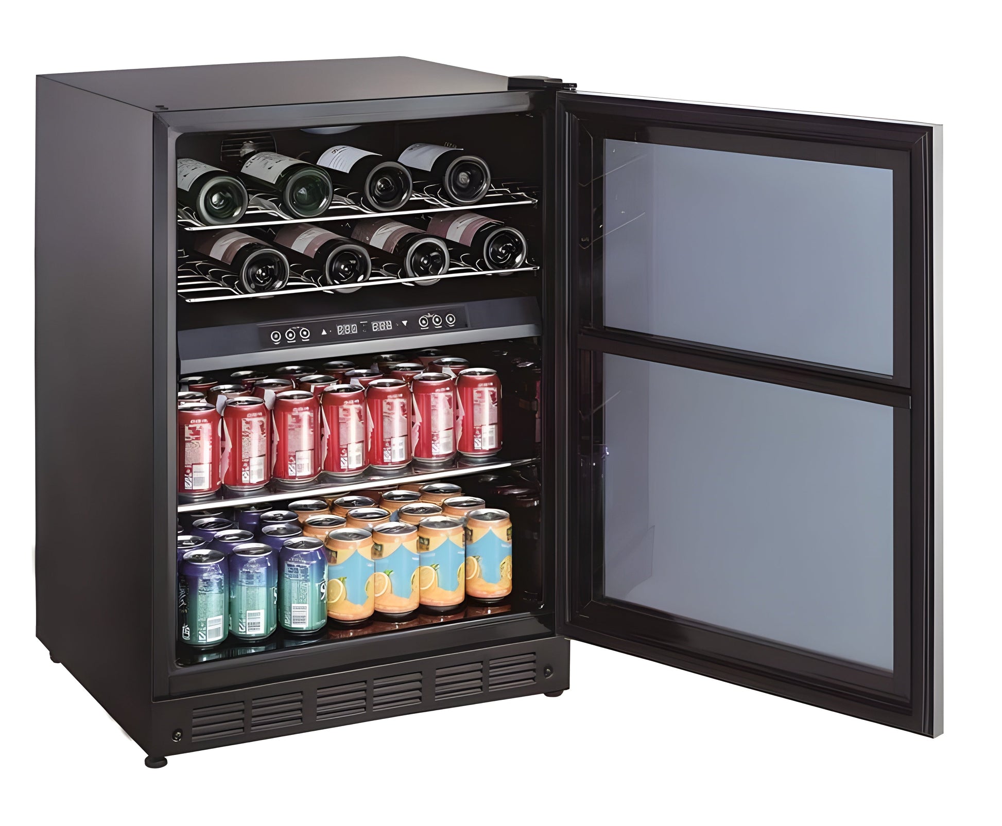 This 24" Wine and Beverage Center by Magic Chef features dual temperature zones. The beverage center can hold 44 bottles, 140 cans or 16 bottles and 77 cans. The center features a fingerprint proof stainless steel door frame, adjustable digital thermostat and soft blue LED lighting.Â