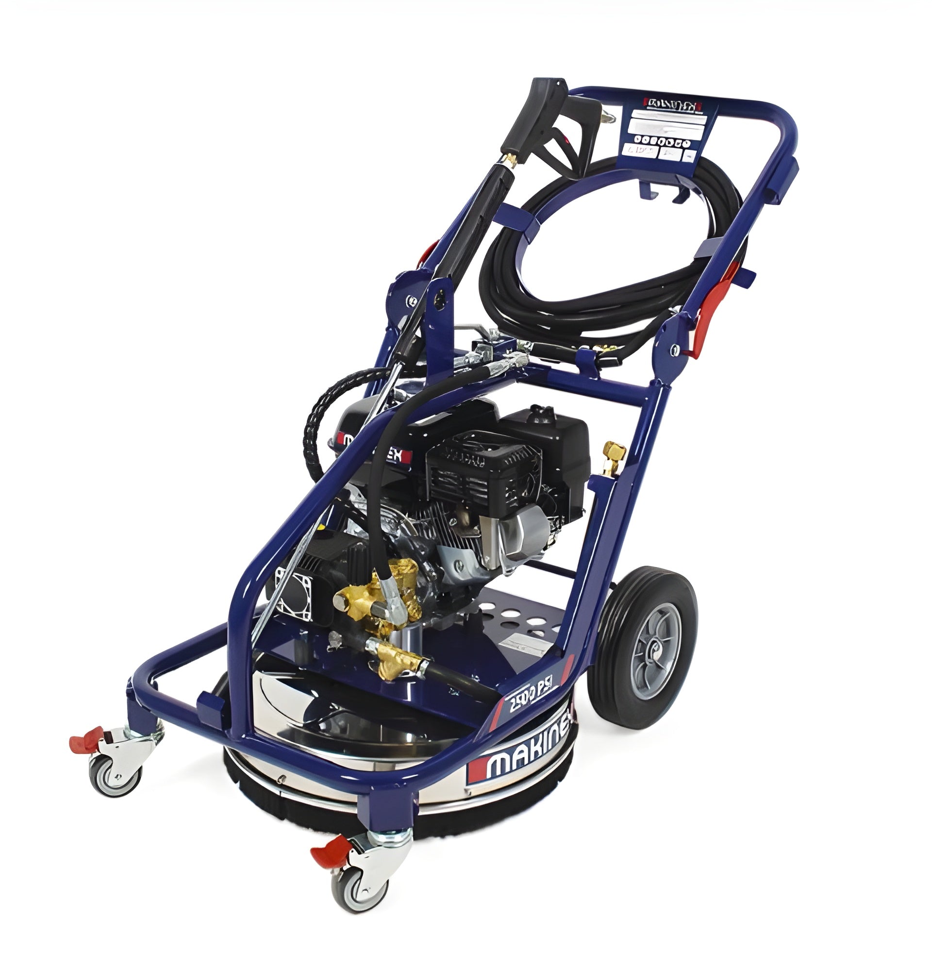 The Makinex Dual Pressure Washer features a Honda engine and a 30ft hose to access hard-to-reach places. Other features include rubber mounts to reduce vibration from the engine, brake castors for locking in place, and a heavy-duty geared pump with a thermal release valve. There is also a convenient lifting eye and a foldable handle to assist with transportation and storage.