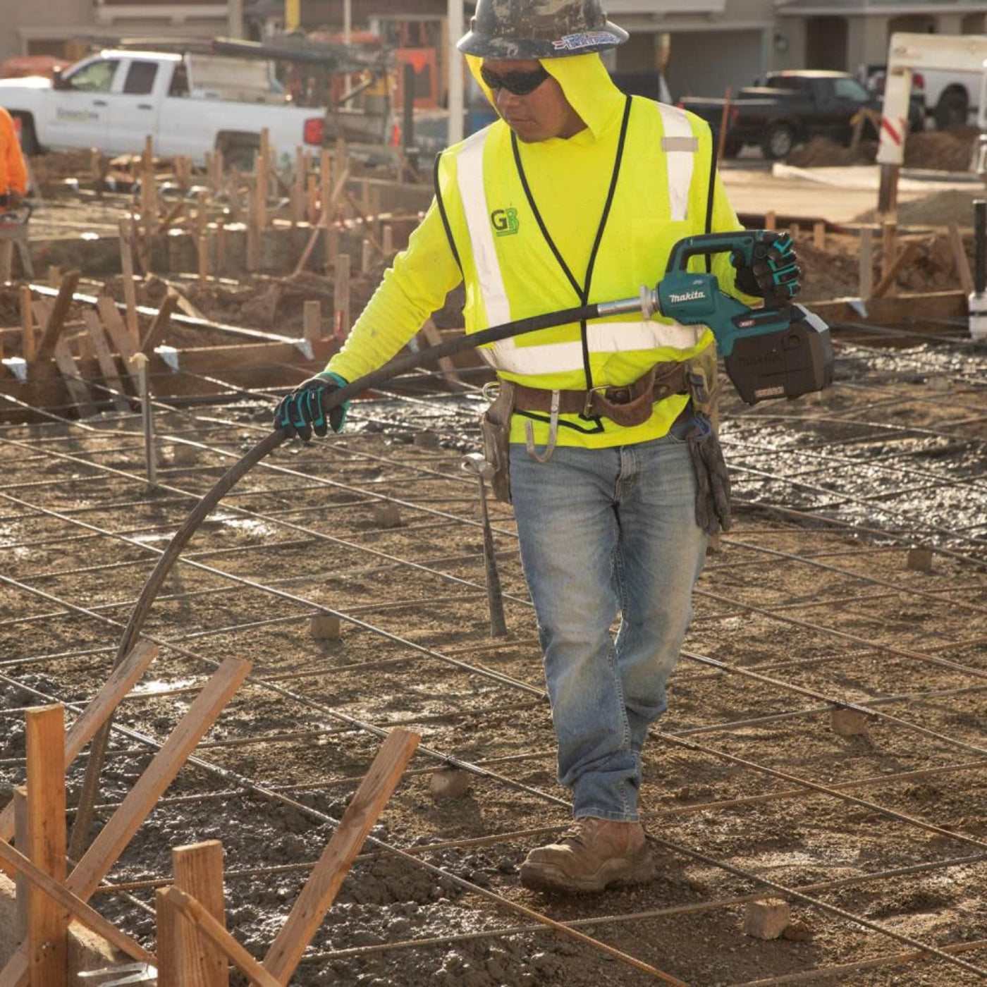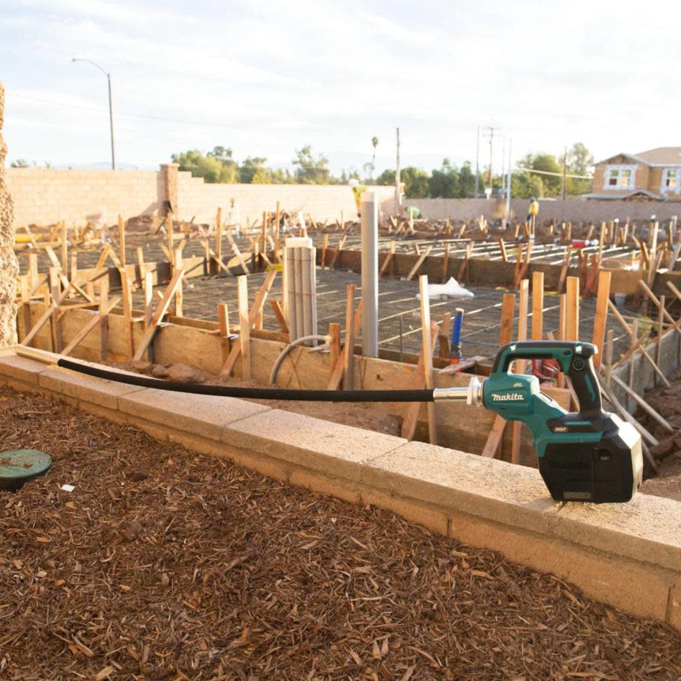 The Makita cordless 5β1/2 ft concrete vibrator is run by brushless motor that delivers 15500 VPM and provides maximum run time of up to 45 minutes in normal mode and 60 minutes in power mode for strengthening concrete. The power mode helps in selecting the appropriate power level for wide range of applications including compaction of floors, pillars and mat foundations. Dual directional switch improves versatility and convenience to hold the tool in either horizontal or vertical positions for easy access to hard-to-reach areas. By covering the switch and battery, the tool is protected from external elements. The 1-1/4 Inch Dia vibrator with 5-1/2 ft shaft ensures uniform finish and helps in reducing defects in the concrete. The 77 Inch long compact and ergonomic design make it easy to handle and reduces fatigue during extended use. Digital communication features an XGT technology to protect the battery from over-heating, over-discharge and over-loading. Battery and charger sold separately.