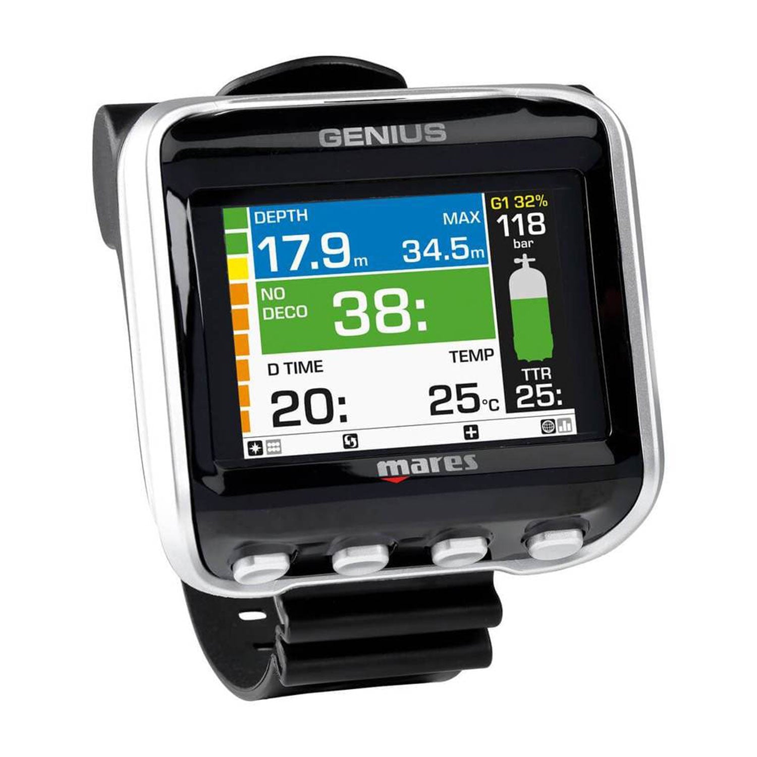 A: The Mares Genius is an advanced scuba dive computer that provides comprehensive dive data, including wireless air integration, depth, time, and decompression limits, all displayed on a user-friendly interface.