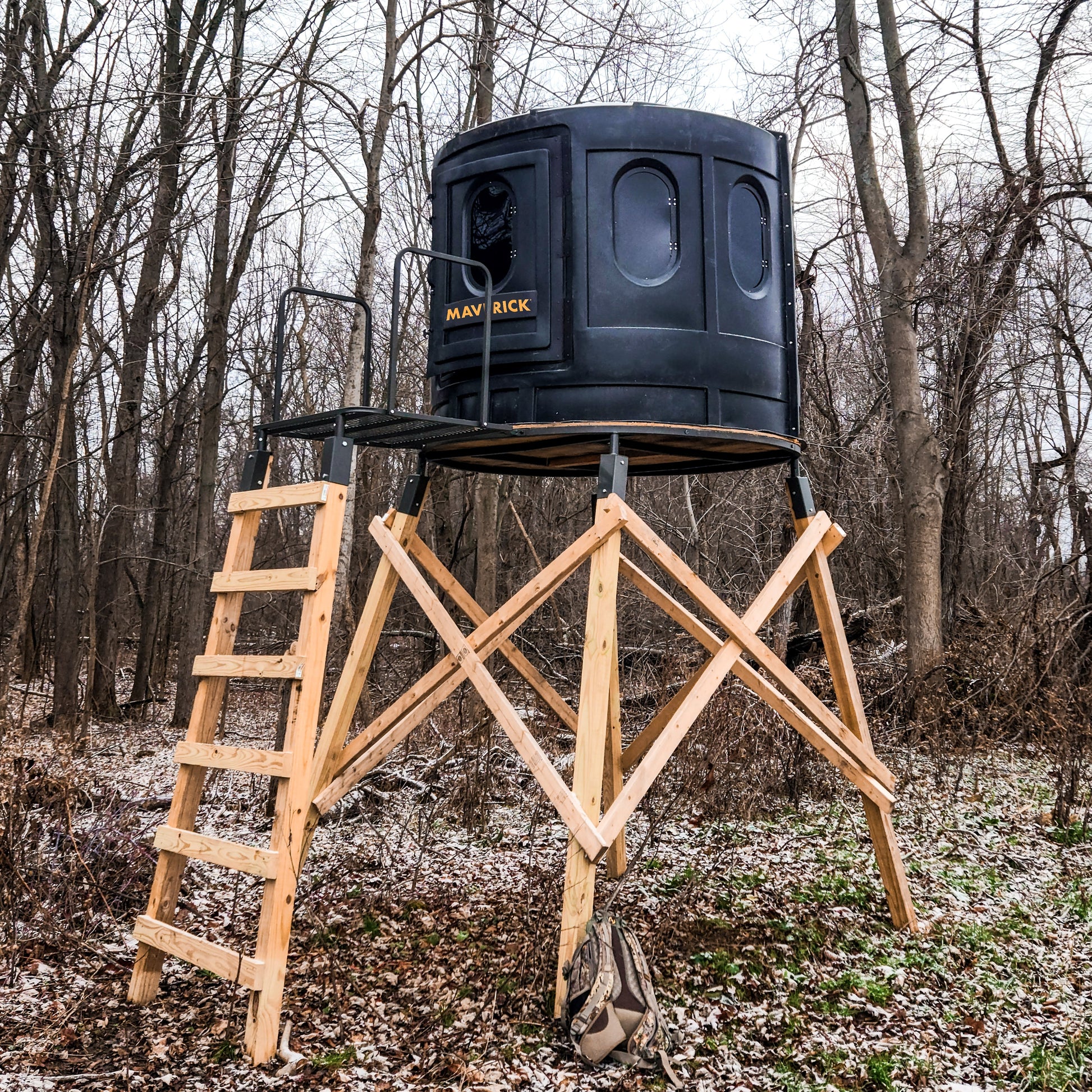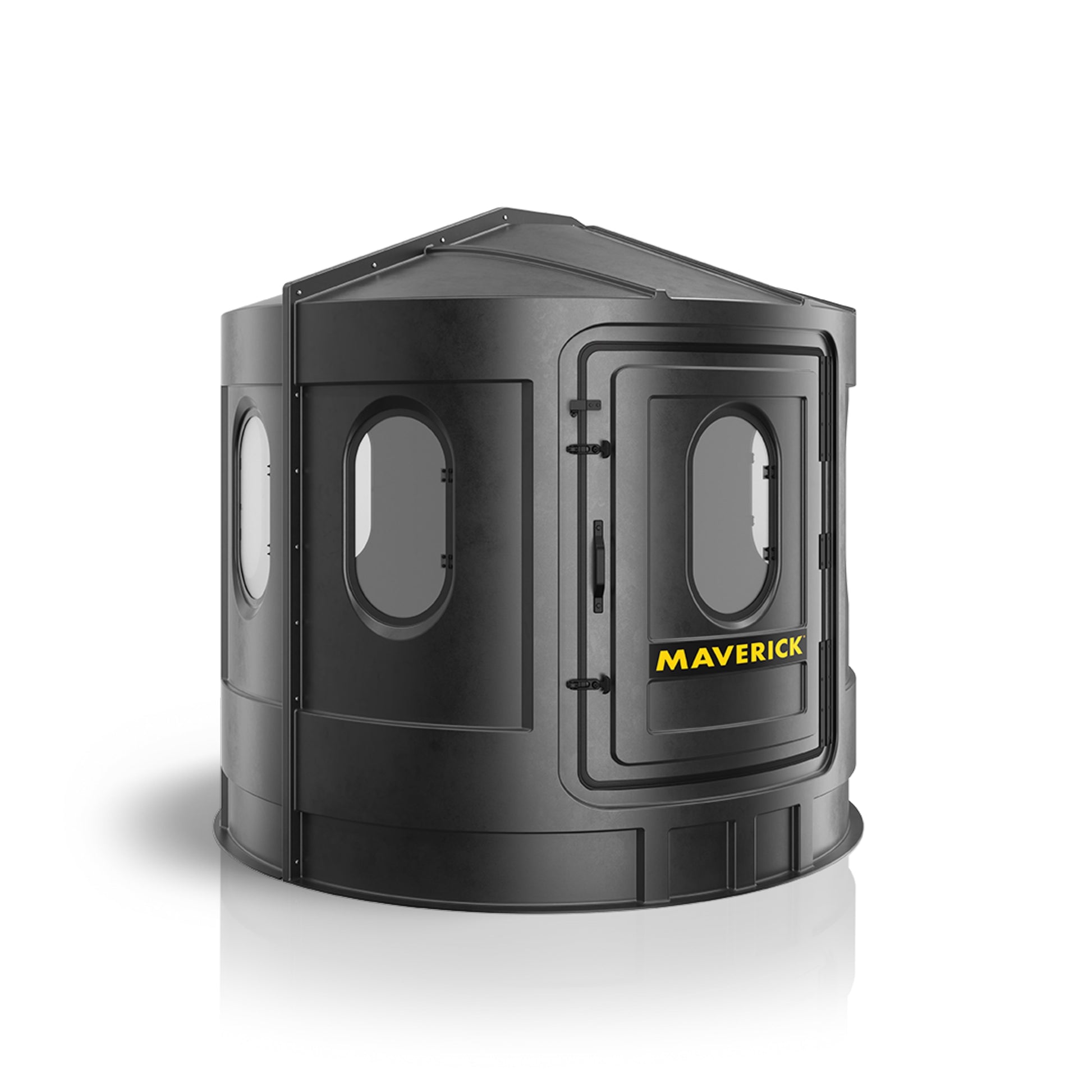 Its patented rainproof overhang where the two pieces connect keeps out everything but water. Its 2" bottom flange for securing it to the ground or a platform keeps you dry and provides stability in high winds. With Maverick's 360-degree viewing and shooting, no yearly setup or takedown, you can spend more time hunting and less time working.