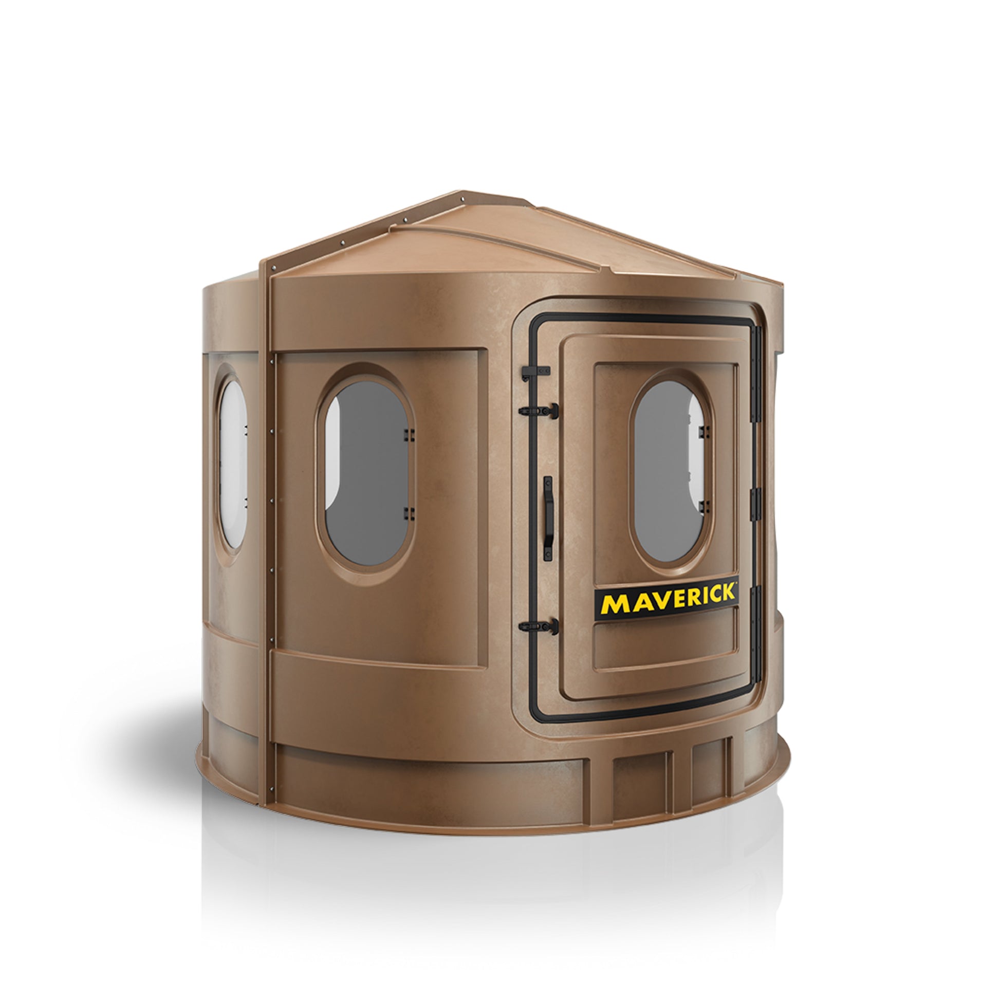 Its patented rainproof overhang where the two pieces connect keeps out everything but water. Its 2" bottom flange for securing it to the ground or a platform keeps you dry and provides stability in high winds. With Maverick's 360-degree viewing and shooting, no yearly setup or takedown, you can spend more time hunting and less time working.