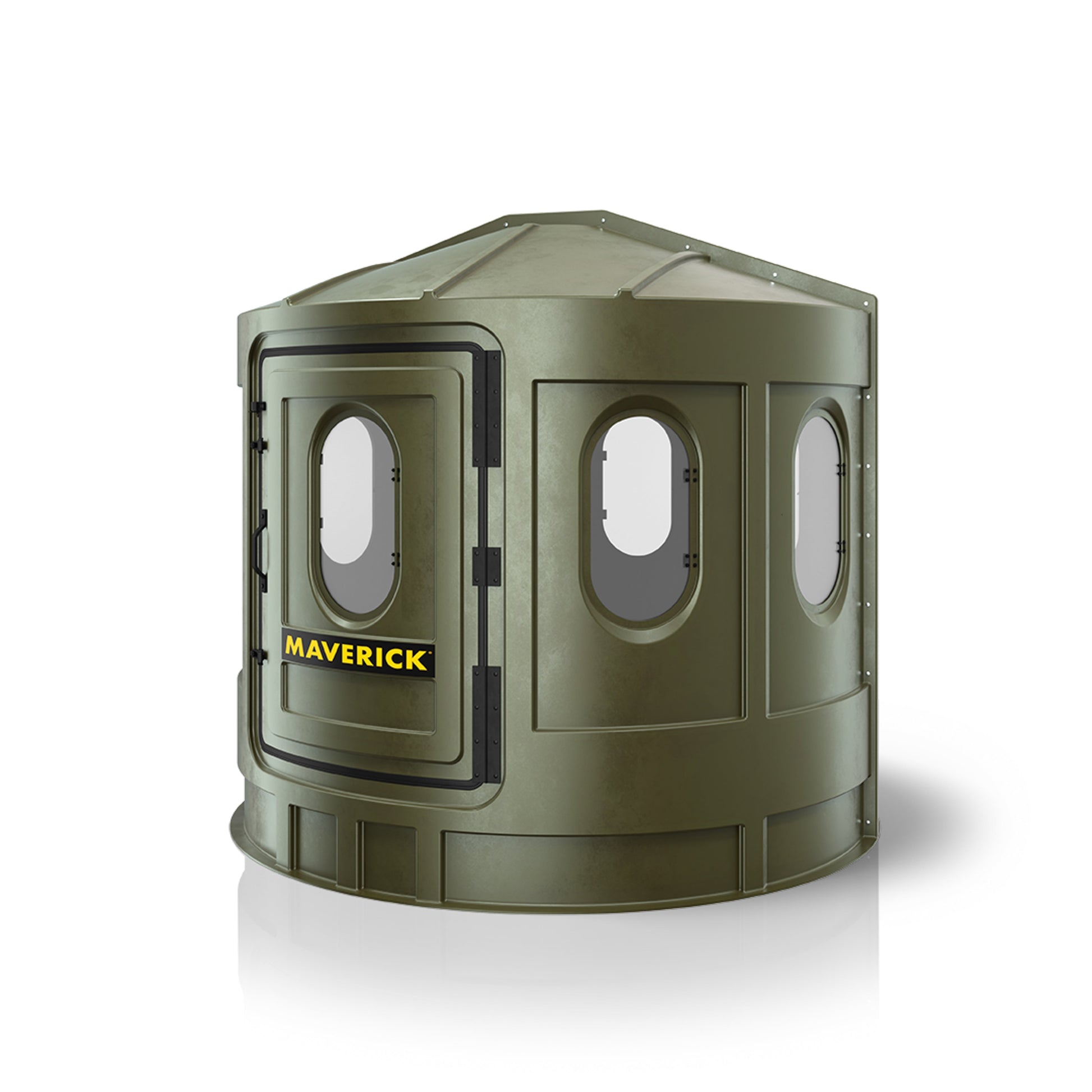 Its patented rainproof overhang where the two pieces connect keeps out everything but water. Its 2" bottom flange for securing it to the ground or a platform keeps you dry and provides stability in high winds. With Maverick's 360-degree viewing and shooting, no yearly setup or takedown, you can spend more time hunting and less time working.