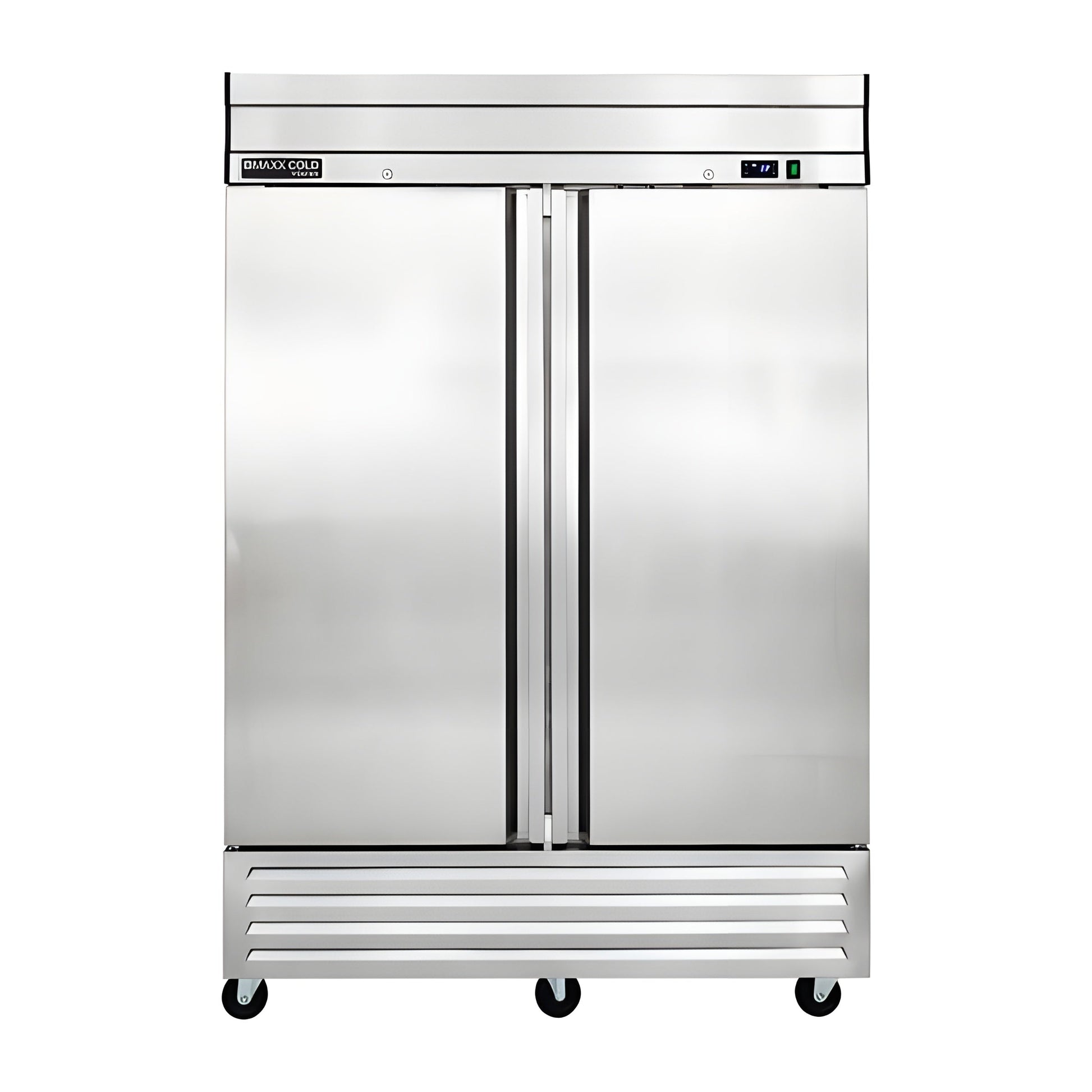 Ideal for use in restaurants, cafes, bakeries, catering businesses and more, the Maxx Cold V-Series 2 Door Reach-In Freezer is a smart investment. Offering ample storage space for frozen foods, ingredients and more, this commercial reach-in freezer measures 54"W and has a storage capacity of 42 cubic feet. Built to withstand the demands of a commercial kitchen environment, it is constructed of a durable, easy-to-clean stainless steel exterior and painted aluminum interior. This reach-in freezer has two self-closing, locking solid doors with easy-to-grip recessed handles, and the unit's open door alert beeps when the door has been open for three minutes. Six adjustable heavy-duty wire shelves let you organize and store frozen food and beverage items efficiently. The unit has an easily accessible bottom mount for cleaning and is equipped with 4-inch swivel casters for easy mobility in your commercial kitchen. The digital control system lets you easily adjust the temperature with the range of -10°F to 10°F (-23°C to -12°C), and the LED temperature display is easy to read. This single-door reach-in freezer features automatic interior lighting, an automatic defrost system and urethane foam insulated walls and doors. The unit is equipped with an integrated condensate evaporator; therefore, no drain line connection is needed. Investing in the Maxx Cold V-Series 2 Door Reach-In Freezer is a practical and essential decision for businesses in the foodservice industry. Covered by the Maxx Cold Six-Month Parts and Labor Limited Warranty.