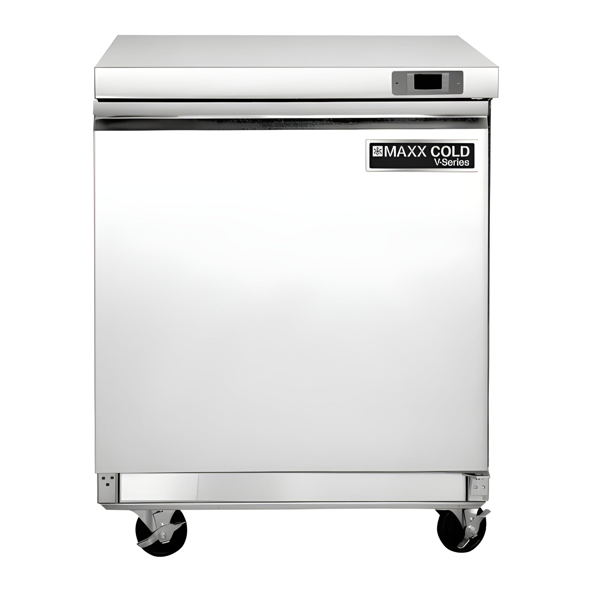 The Maxx Cold V-Series 1 Door Undercounter Freezer provides convenient frozen storage without sacrificing valuable floor space in your commercial kitchen. This compact undercounter freezer features a stainless steel exterior and powder coated aluminum interior for durability and ease of cleaning. Measuring 29 inches wide, it offers 7.8 cubic feet of storage and has one door with an easy-to-grip recessed handle. This stainless steel undercounter freezer has one adjustable heavy-duty wire shelf for storing and organizing frozen foods and ingredients such as meat, desserts, seafood and more. With its compact size, this commercial undercounter freezer easily fits under counters and other workspaces, making it ideal for kitchens with limited space. The unit includes four 3" swivel casters (two with brakes) for easy mobility and cleaning. Additional features include a solid state digital control system, LED temperature display, and urethane foam insulated walls and door. The unit has a temperature range of 0°F to 10°F to hold your frozen products at their ideal storage conditions. The condensate evaporator is integrated to the unit, meaning no drain line connection is needed. The Maxx Cold V-Series 1 Door Undercounter Freezer offers quick access to frozen ingredients, making it a valuable addition for restaurants, pizzerias, bars, bakeries, cafes and more. Covered by the Maxx Cold Six-Month Limited Warranty.