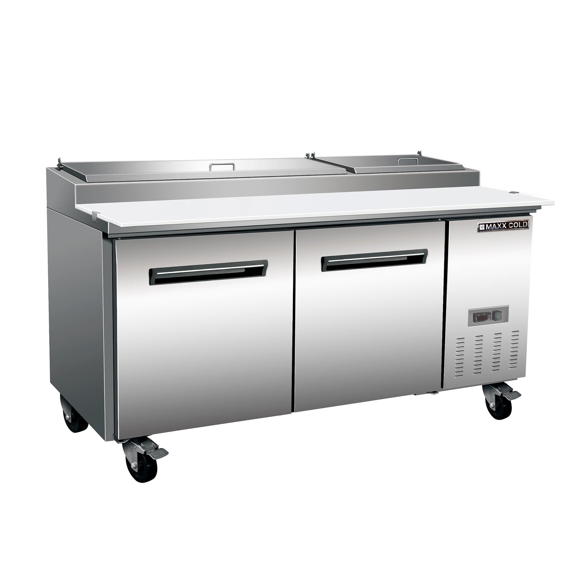 - Features: Maxx Cold X-Series Refrigerated Pizza Prep Table, two-section, 70.8"W, 22 cu. ft. storage capacity, two-section, (2) solid hinged doors with recessed handles, (2) adjustable shelves, electronic thermostat & digital LED temperature display, insulated top cover, cooling system self-contained, stainless steel exterior, painted aluminum interior, (4) 3" casters (2 locking & non-locking), side mounted compressor, includes: cutting board & (9) 1/3 size polycarbonate pans, R290 Hydrocarbon refrigerant, 5 amps, cETLus, ETL-Sanitation