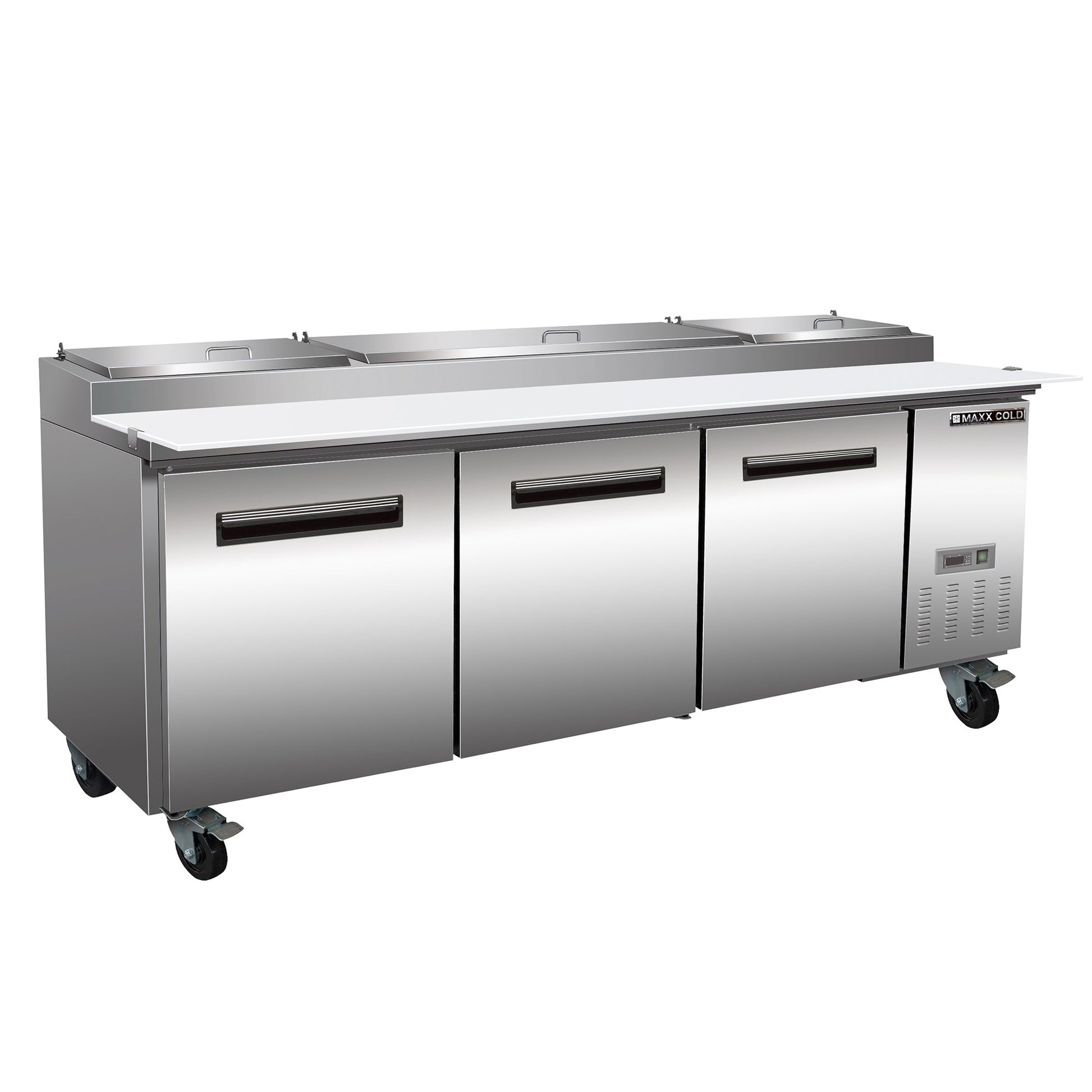 - Features: Maxx Cold X-Series Refrigerated Pizza Prep Table, three-section, 94.2"W, 32 cu. ft. storage capacity, (3) solid hinged doors with recessed handles, (3) adjustable shelves, electronic thermostat & digital LED temperature display, insulated top cover, cooling system self-contained, stainless steel exterior, painted aluminum interior, (4) 3" casters (2 locking & non-locking), side mounted compressor, includes: cutting board & (12) 1/3 size polycarbonate pans, R290 Hydrocarbon refrigerant, 5 amps, cETLus, ETL-Sanitation