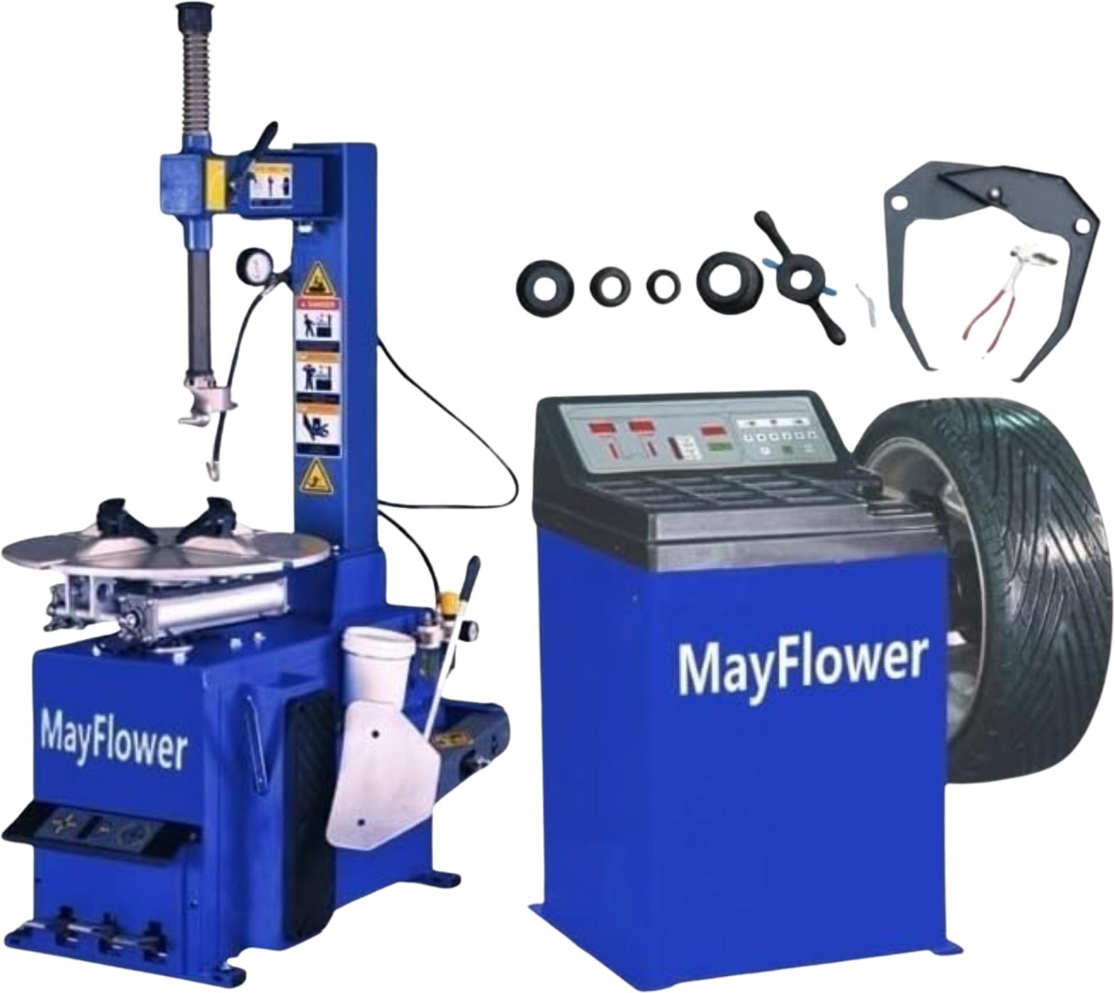 950 Semi Automatic Tire Changer Rim clamping outside 10″-20″ Rim clamping inside 12″-24″ Motor Horsepower 1.5 HP Strong Motor Mayflower use quality motors as good as brand tire changer machines. The bird head is designed with protector and claws are lifetime warranty Maximum Tire Diameter 37″ (960mm) Maximum wheel Width 12″ Bead Break force 5600 lbs. pnuematic piston Includes bead blast air blast Operating pressure 120-145 psi (8-10 bar) Quick Inflation (Bead Blaster) and Air reserve tank Voltage 110V only Includes 4 clamp protectors and Steel mount head(shown in picture) 530 lbs. Shipping Weight Blue Powder Coat Finish 680 Electronic wheel balancer Rim Diameter 10″-24″ Rim Width 1.5″-20″ Max. wheel diameter: 44″ (1117mm) Maximum wheel weight 155 lbs Cycle Time 6-9 seconds 110 volt power Balancing accuracy: -1g to +1g Pre set to American Standard Measurements Standard Dynamic Mode, Static Mode, ALU 1-3 Mode, Motorcycle Mode Includes 3 centering cones Includes Quick Release Wing Nut Includes all accessories shown in the pictures 270 lbs. Shipping Weight Blue Powder Coat Finish 1 Year Warranty! + 100% Satisfaction Guarantee