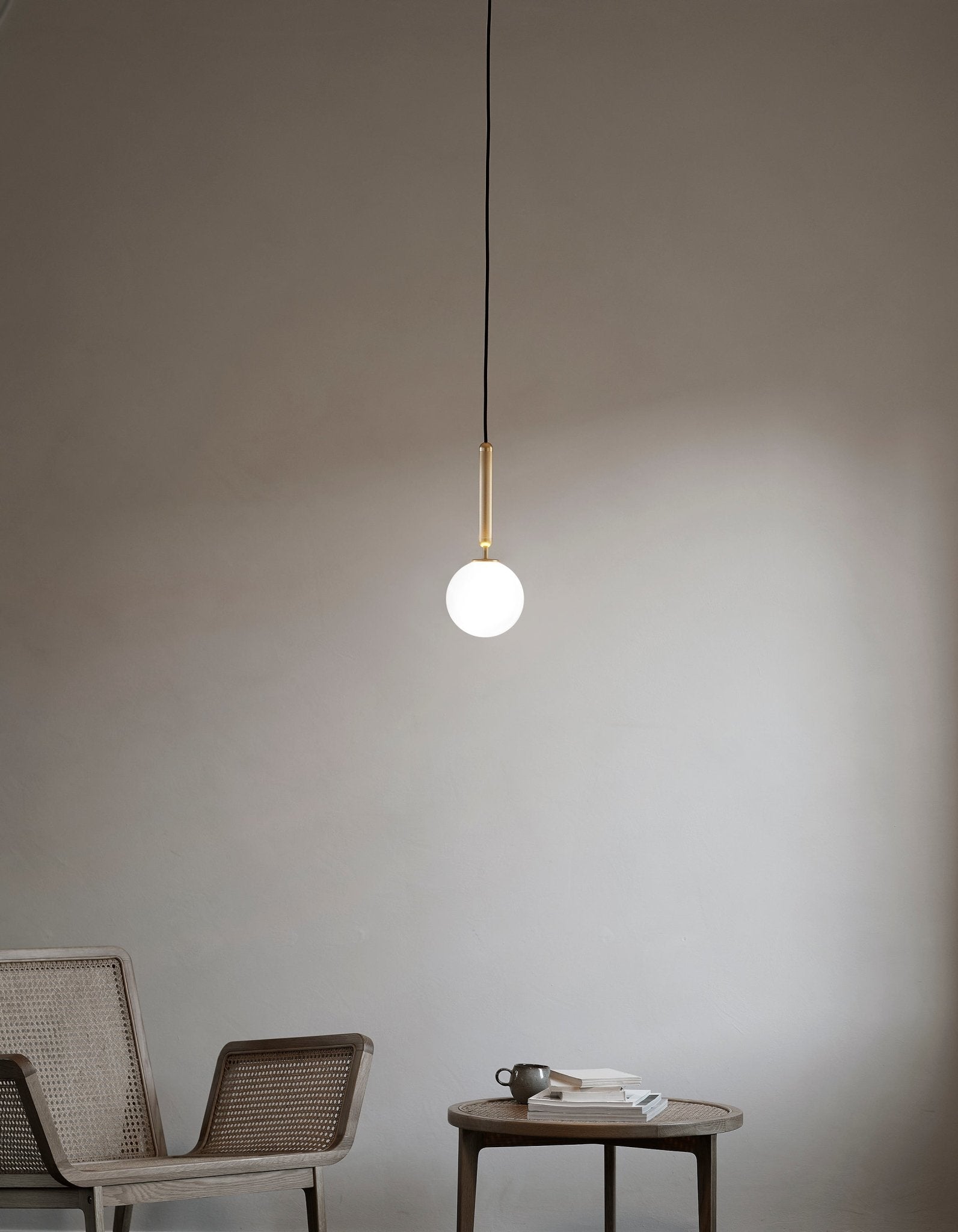 The Miira 1 Pendant by Nuura adds a modern touch to any space with its elegant and simple design. The mouth-blown glass globe is suspended from a single cord, creating a soft, inviting glow. Perfect for a round coffee table or living room furniture, this pendant light enhances any Scandinavian design. Additionally, its minimalist style effortlessly fits into modern interiors, offering a timeless and sophisticated lighting solution.