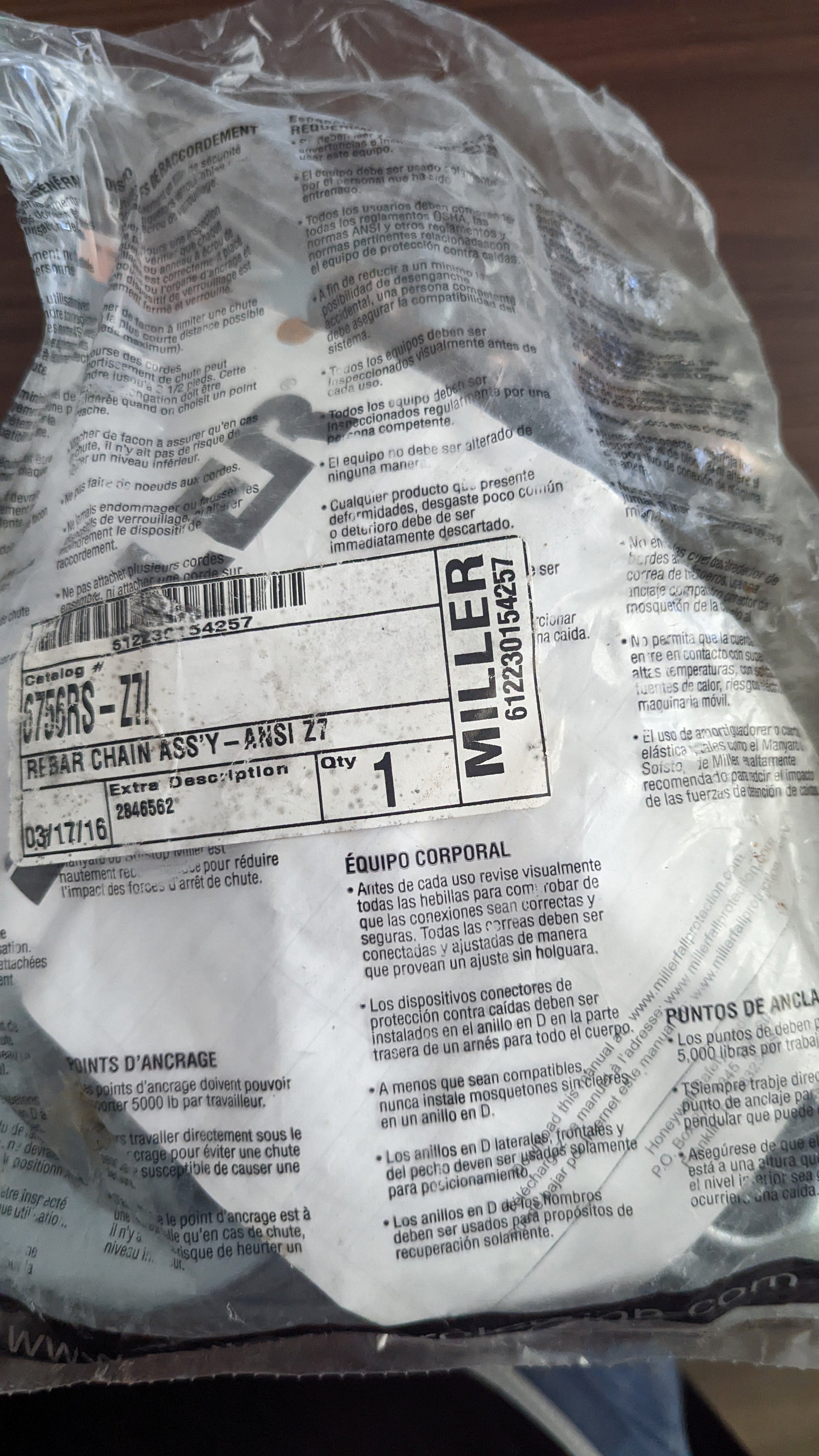 The Miller 6756RS-Z7/ is a longer rebar positioning assembly 24 in. overall when deployed. It has an intermediate swivel on the bottom of the rebar hook and twist link chain to avoid binding. Two steel self-closing, self-locking snap hooks attach to the worker's positioning D-rings. This unit also comes with a chain length adjuster for positioning fine tuning. The 6756RS-Z7/ meets OSHA 1926.502 and ANSI A10.32 fall safety requirements. It is important to note that a positioning assembly like the 6756RS-Z7/ is not intended for fall safety, but for securing the worker in place to do their job. Additional fall safety measures such as a shock-absorbing lanyard or SRL are also required.