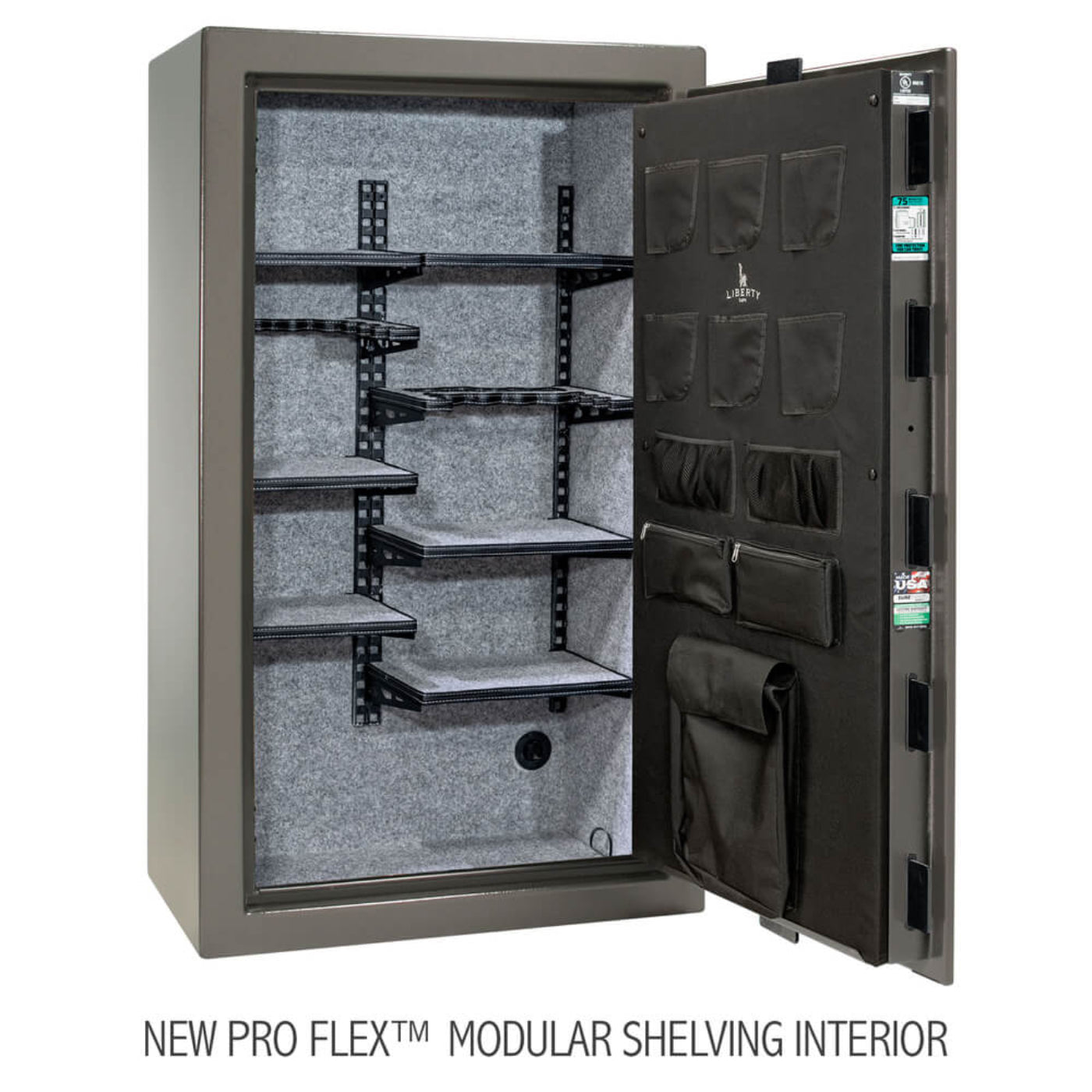 After you've entered the correct combo on the electronic lock, you'll begin to turn the SureTight 3-Spoke handle and retract the 4-sided solid steel Military style locking bars. As the door of the Colonial 30 begins to open you'll notice the included economy door panel organizer that maximizes storage space with pistol pockets, mesh pouches and zippered pockets. The interior features the 3-in-1 flex interior capable of storing up to 25 long guns. Liberty now also includes a Factory installed single power outlet kit that allows you to charge and run electronics inside the safe.