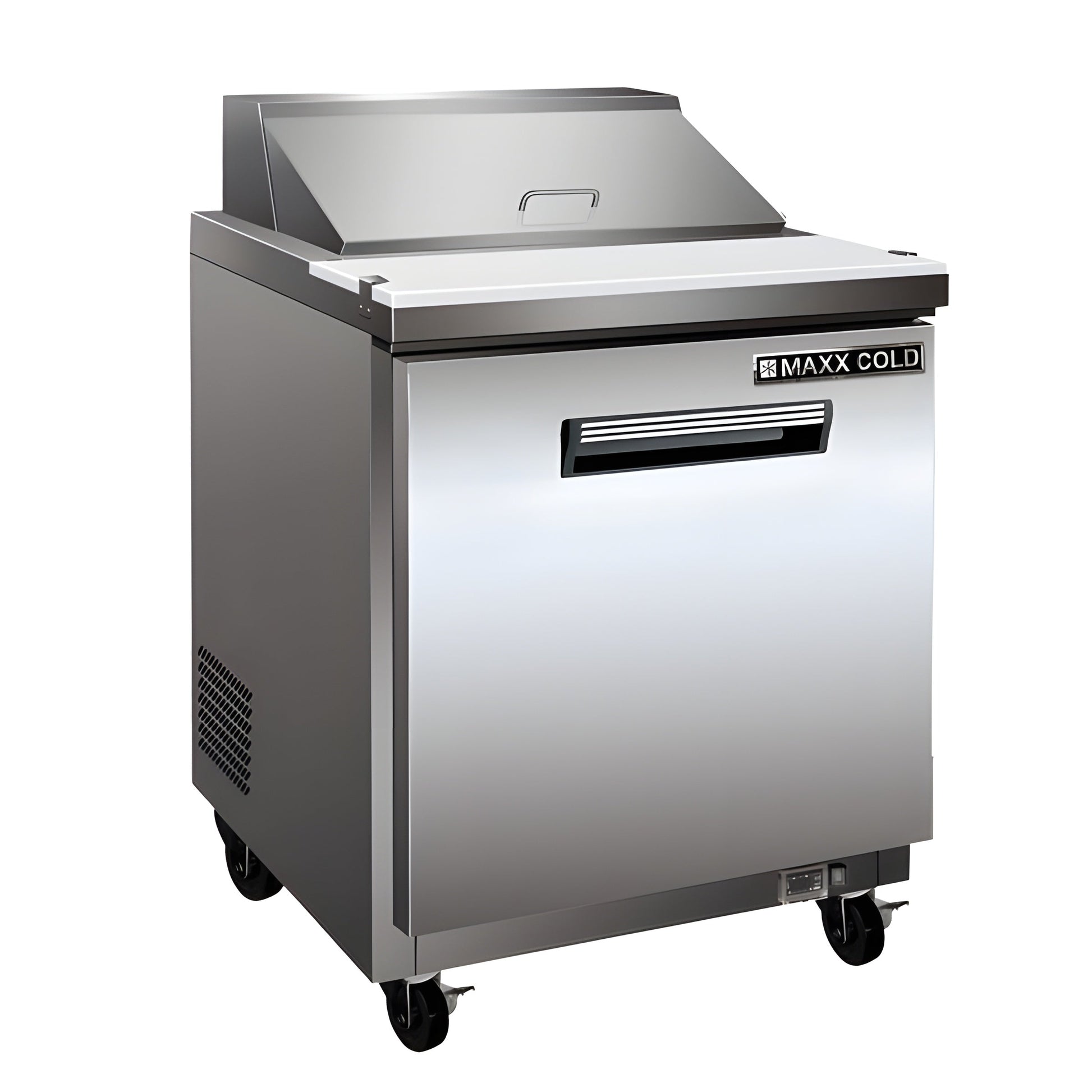 Maxx Cold 28.9 inch wide refrigerated food prep station allows for easy accessibility, optimum storage capacity and flexibility to assist you in quick and easy food preparation. Ideal for any commercial sandwich shop, cafeteria, fast foodservice operation this model will help streamline your foodservice operations in the front or back of house/kitchen. The durable stainless-steel one-door model can accommodate full-size sheet pans. This commercial food service kitchen unit is designed with easy to grip recessed door handles, fully adjustable heavy-duty wire shelves (1 per section/door) and is equipped with a full set of clip-on divider bars and eight (8) 4” deep plastic pans. This one-door commercial refrigerant kitchen essential offers up to 7 cubic feet (198 L) of storage that can hold 8 pans. Equipped with a sanitary food grade quality ensuring 11.42" cutting board constructed of deep polyethylene, the unit is mounted on four (4) 3” diameter swivel casters (two with brakes) to facilitate maneuvering when needed. Additionally, if ADA (American Disability Act) or lower profile requirements are needed, shorter caster options are . This energy efficient refrigerated prep station is engineered with solid-state controls and a forced-air system that delivers consistent and easily adjustable temperature performance. This unit is designed to maximize energy cost savings with its polyurethane foam insulated walls and LED temperature display. The condensate evaporator is integrated to the unit, meaning no drain line connection is needed. The eco-friendly refrigeration system utilizes R290A hydrocarbon refrigerant to maintain optimum temperatures from 33 to 41 degrees Fahrenheit or 1 to 5 Celsius.