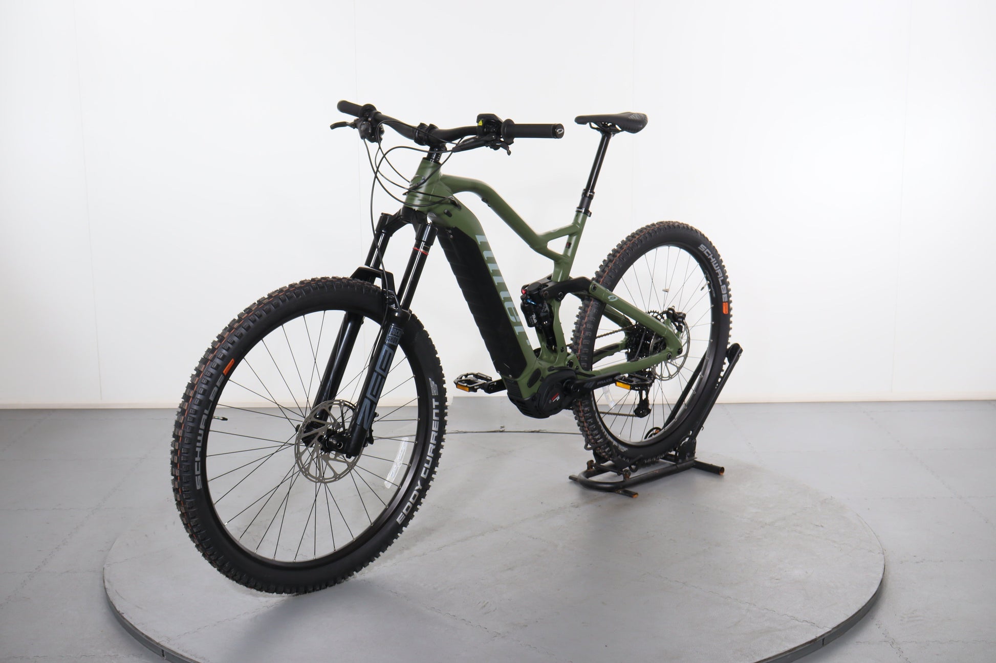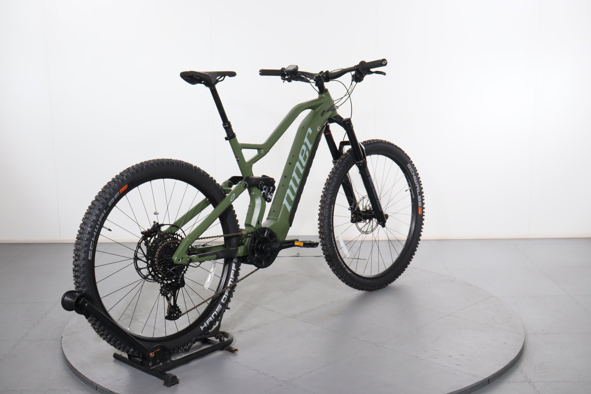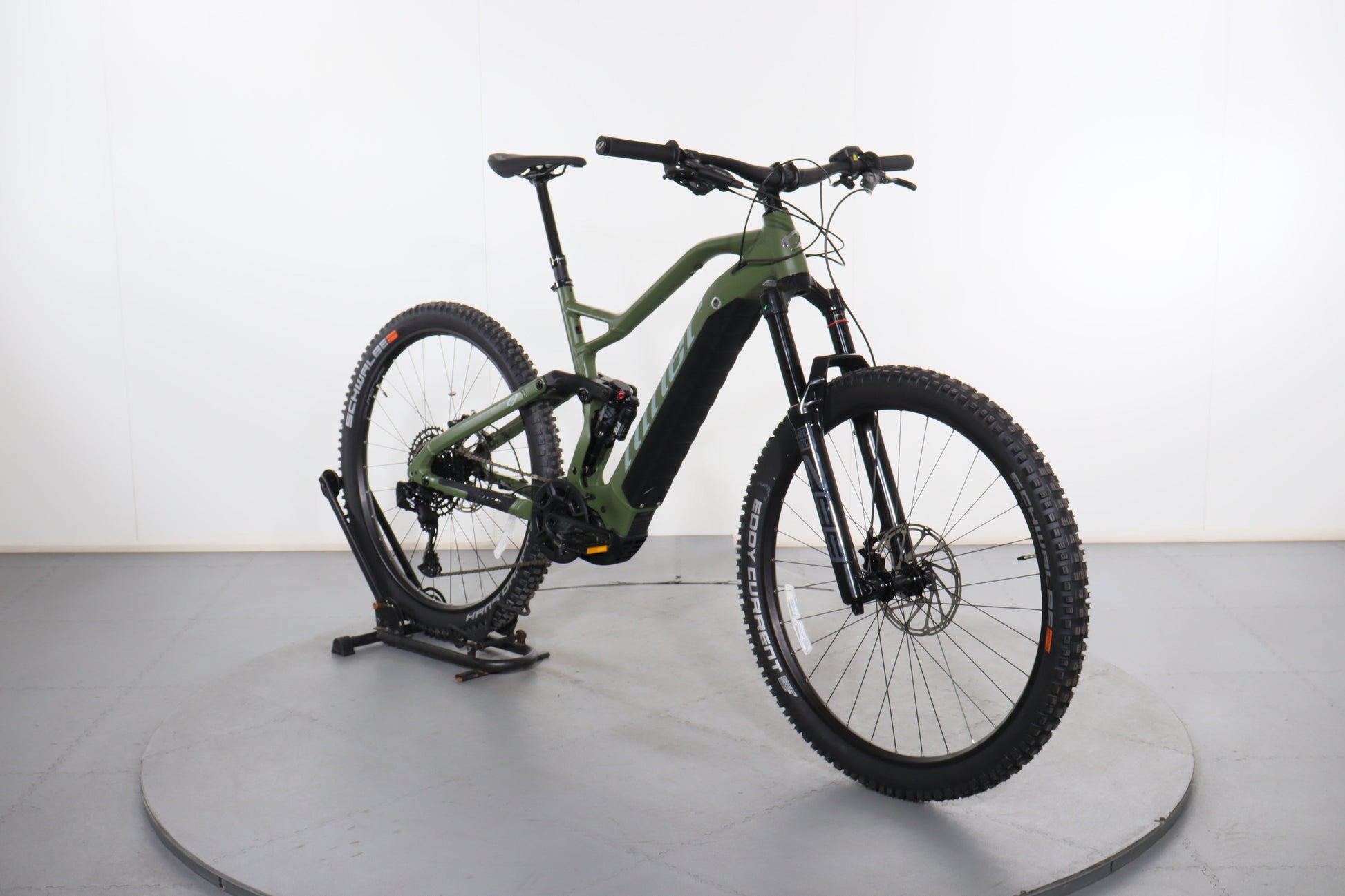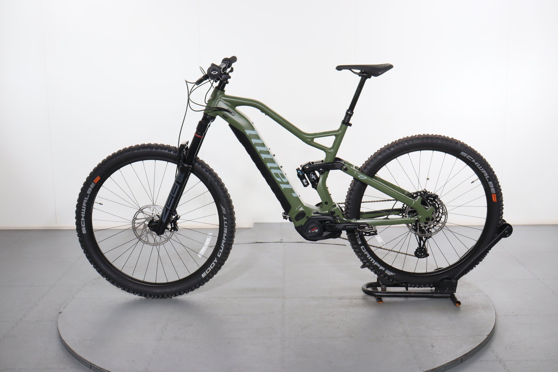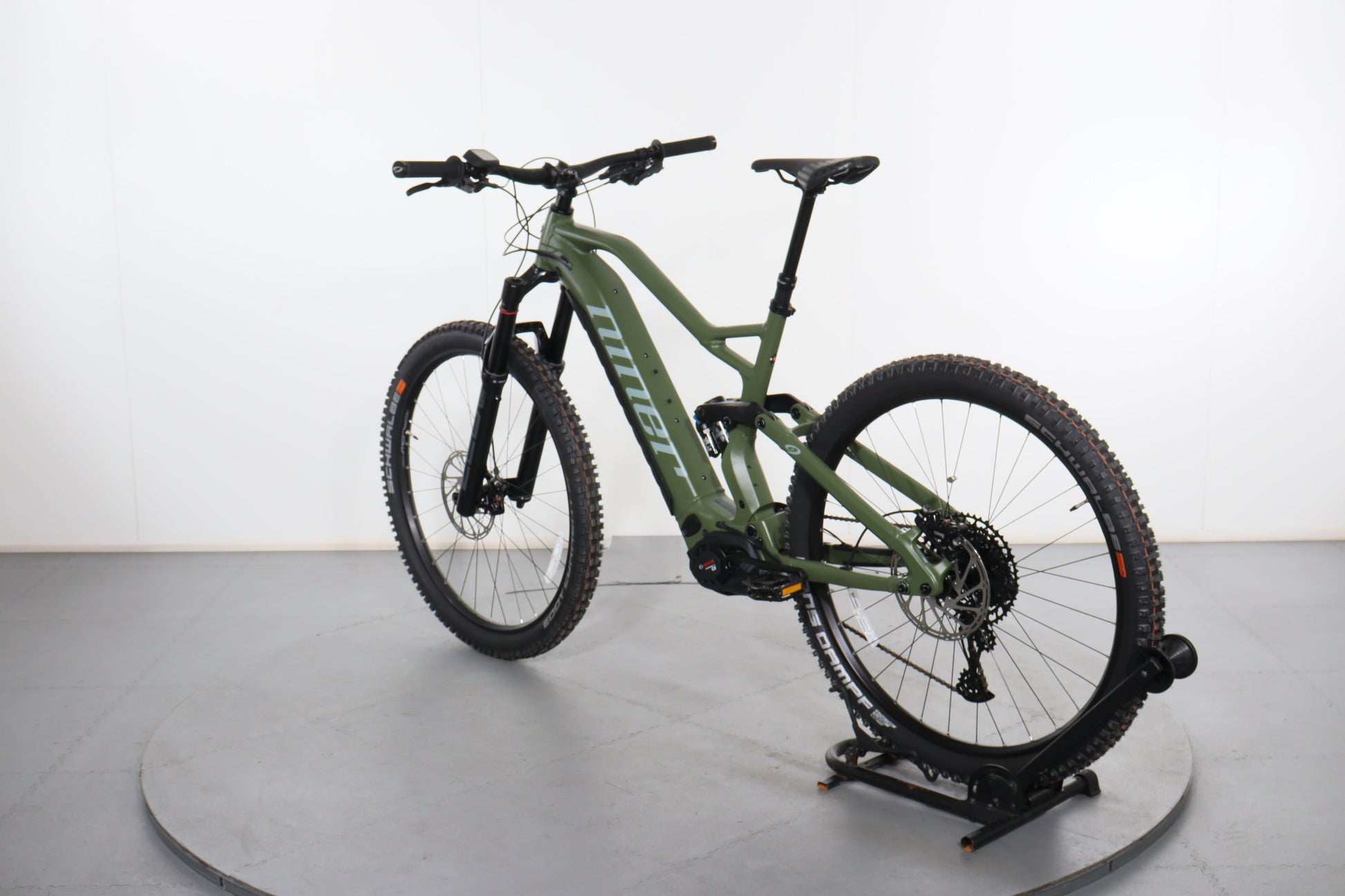 A: The bike uses 29-inch wheels with Schwalbe Eddy Current tires in the front and Schwalbe Hans Dampf tires in the rear, providing excellent traction and stability on both climbs and descents.