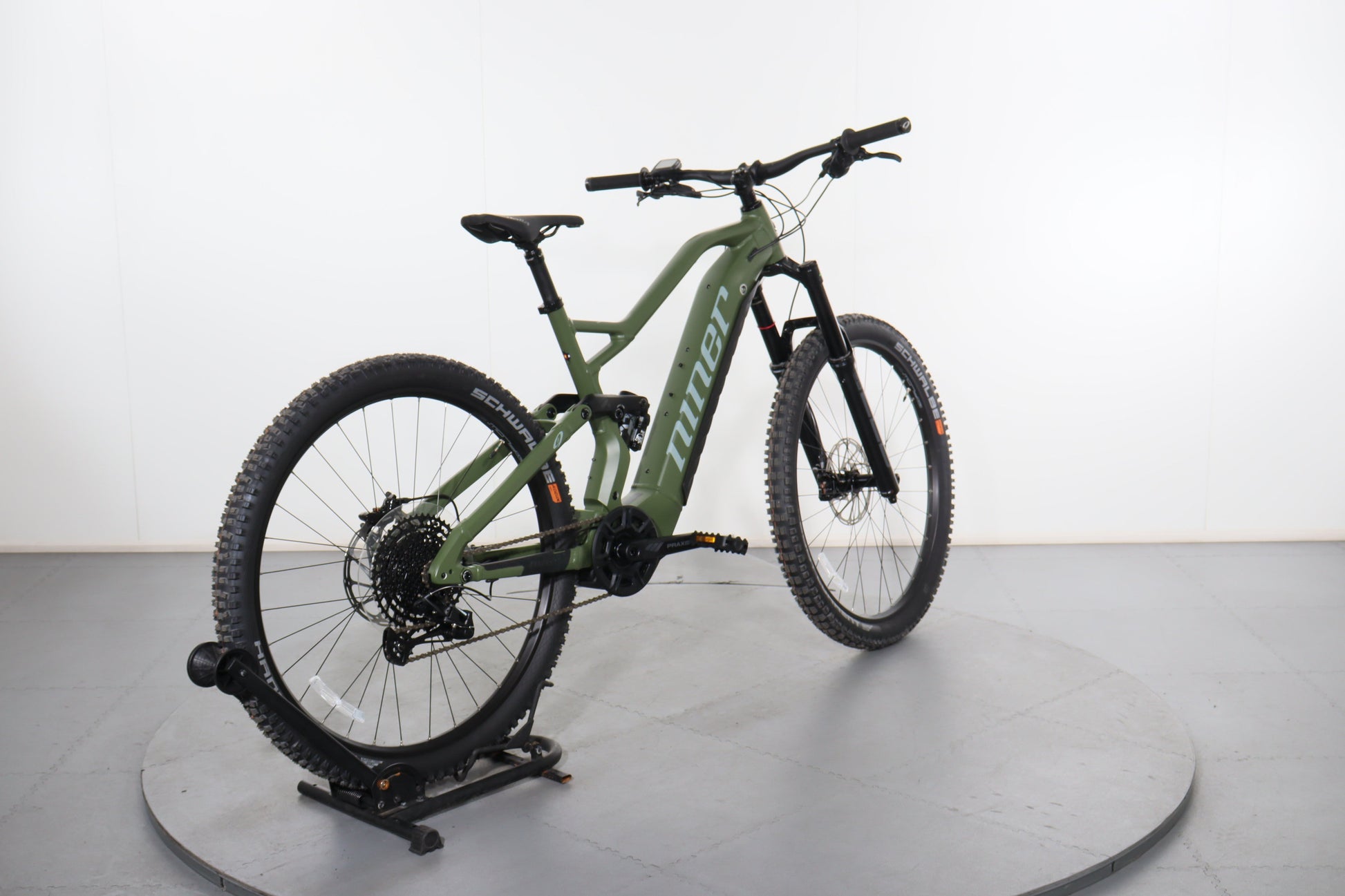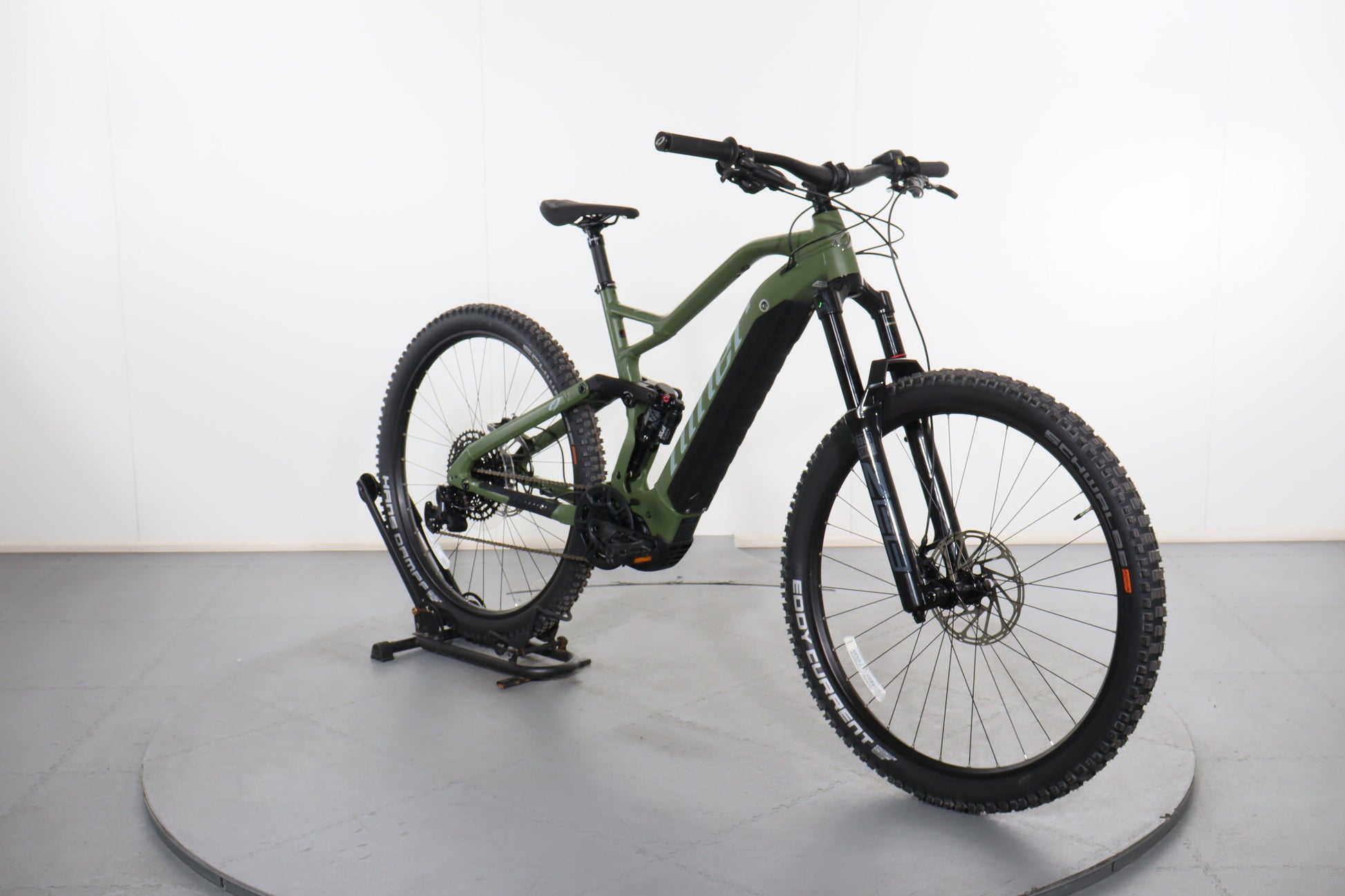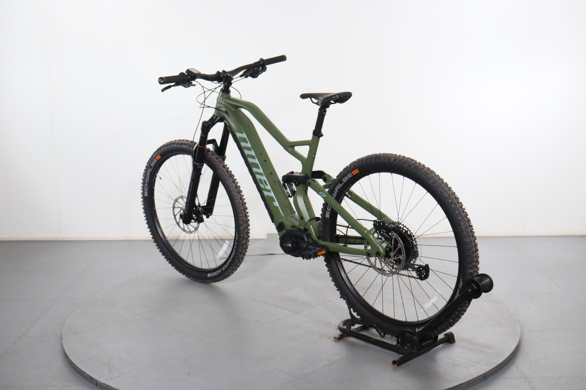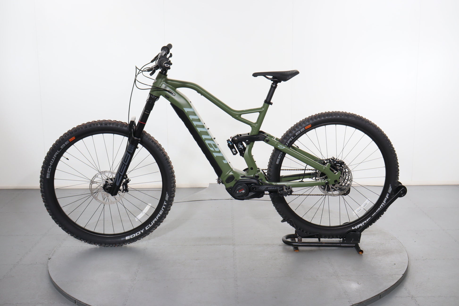 A: It features 29-inch wheels with Schwalbe Eddy Current tires in the front and Schwalbe Hans Dampf tires in the rear, offering excellent traction and stability.