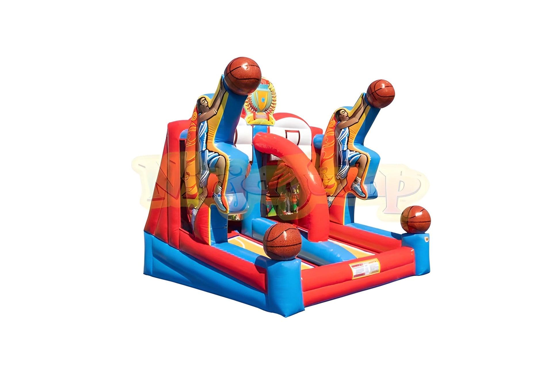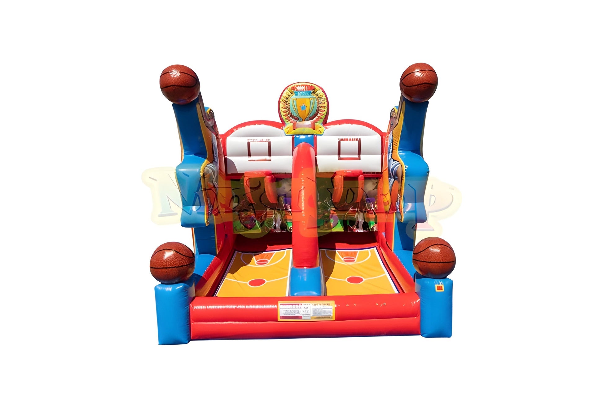 This fast-paced competitive Shooting Stars inflatable game will have participants offering up their best shots, in this dueling basketball game unlike any other. Each player can engage in a crossover shooting action as they try to make baskets, and as the ball return from each shot makes it to the opponent's lane, the first player to get rid of all their basketballs rules this inflatable court. This spirited inflatable game features full basketball court imaging, along with three-dimensional players and basketballs, sure to attract plenty of future NBA stars!