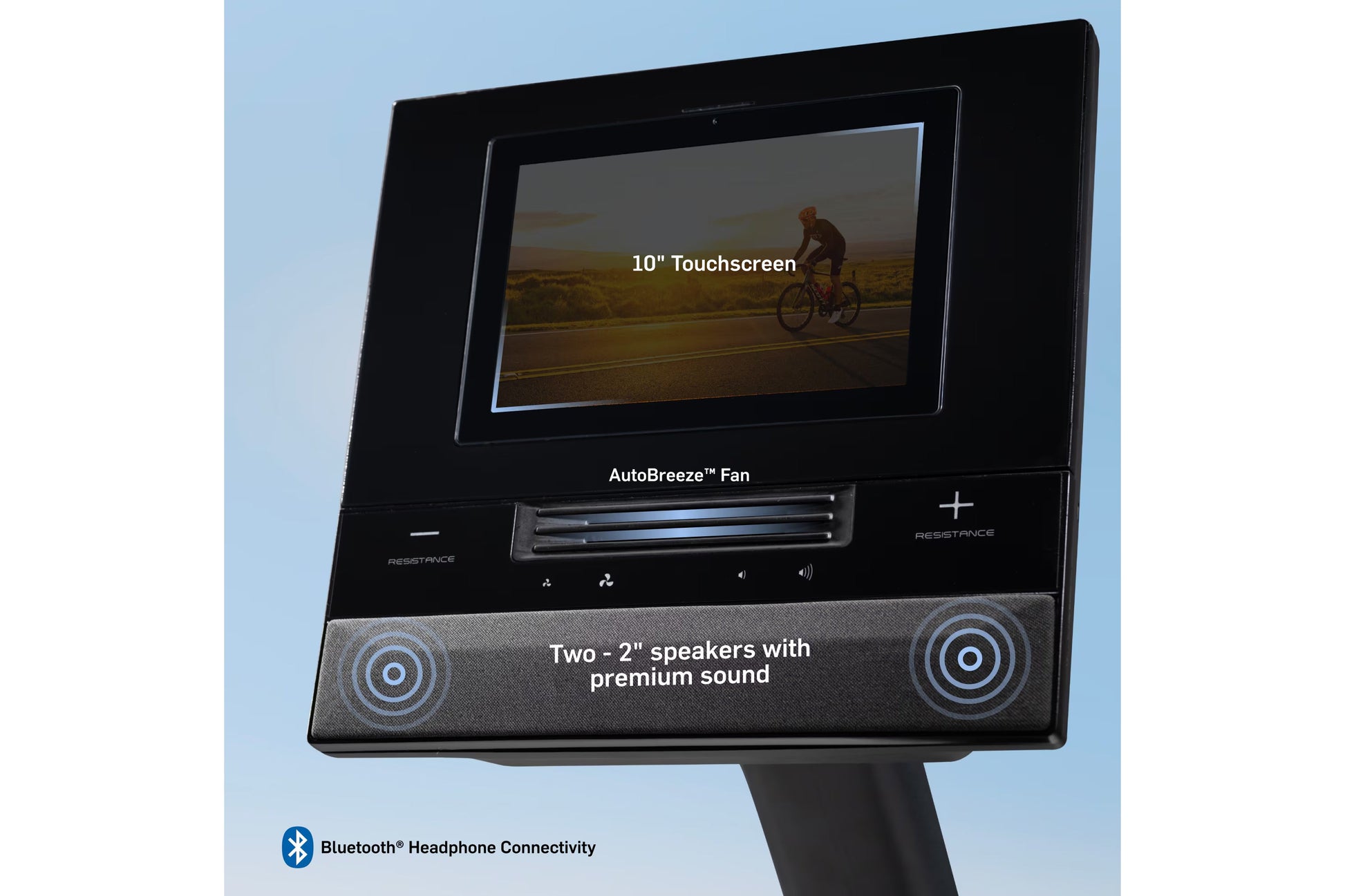 A: The bike includes a 10-inch touchscreen, adjustable resistance levels, an ergonomic design with a cushioned seat, and a quiet, smooth ride suitable for all fitness levels.
