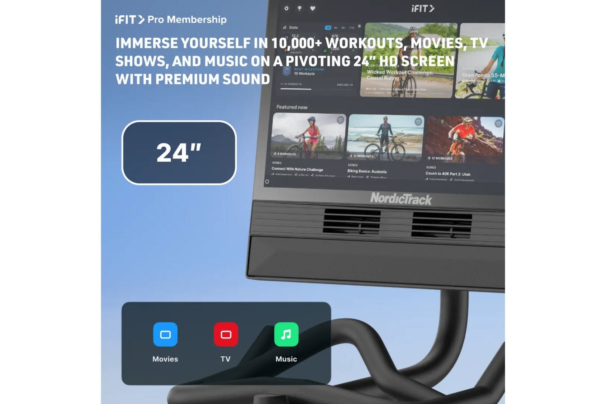 Immersive Experience Pivoting 24” touchscreen for trainer-led workouts & streaming with iFIT