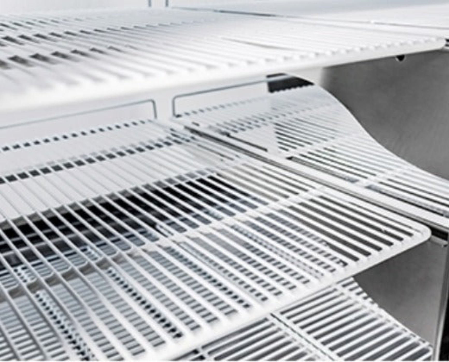 • The rounded corner for easy cleaning of inside storage as well as adjustable, heavy-duty PVC coated shelves