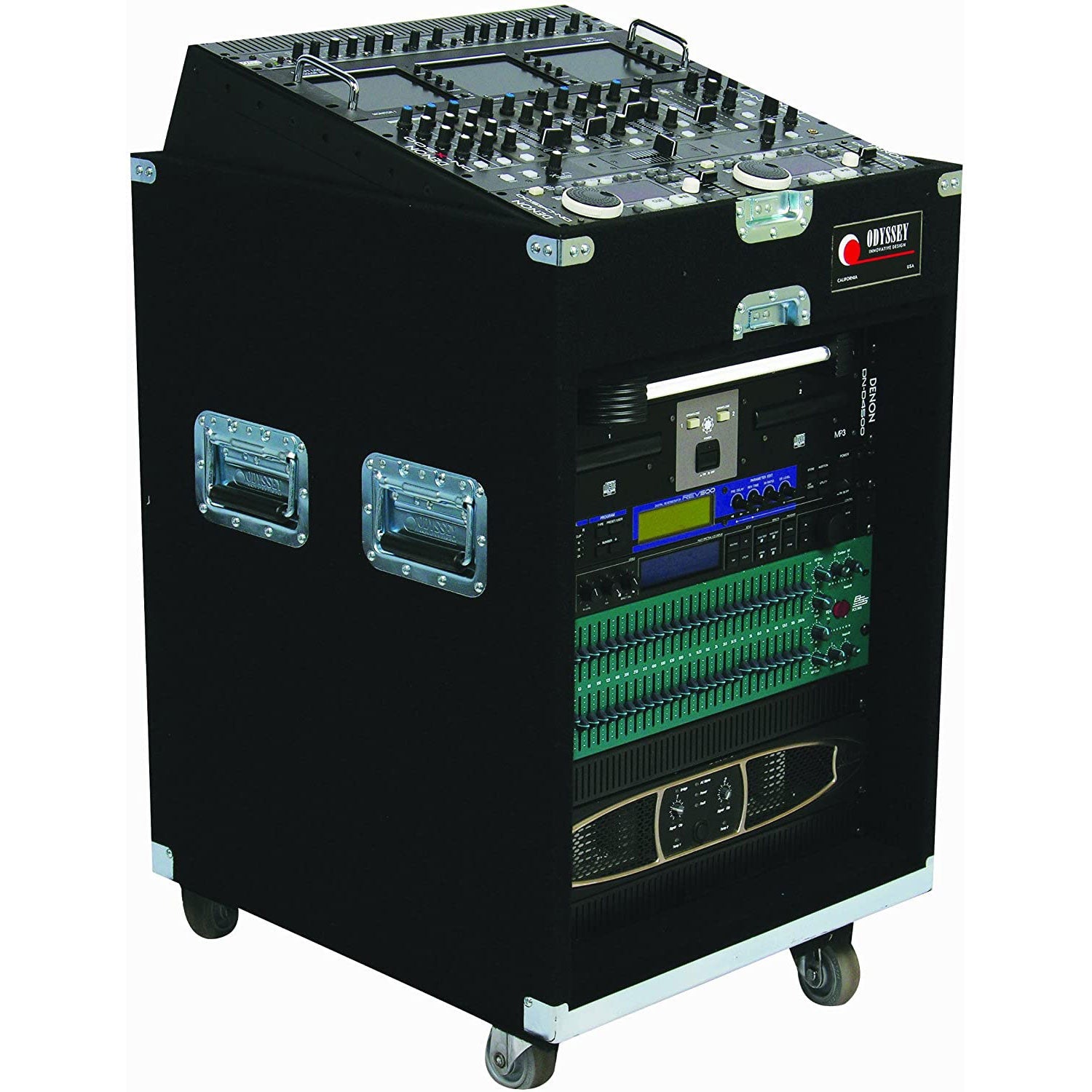 A: The Odyssey CXP1112W is a durable, carpeted combo rack designed for DJs and audio professionals. It features an 11-space slanted top rack and a 12-space vertical bottom rack, offering ample room for mounting mixers, amplifiers, and other essential equipment. The heavy-duty caster wheels provide easy mobility.