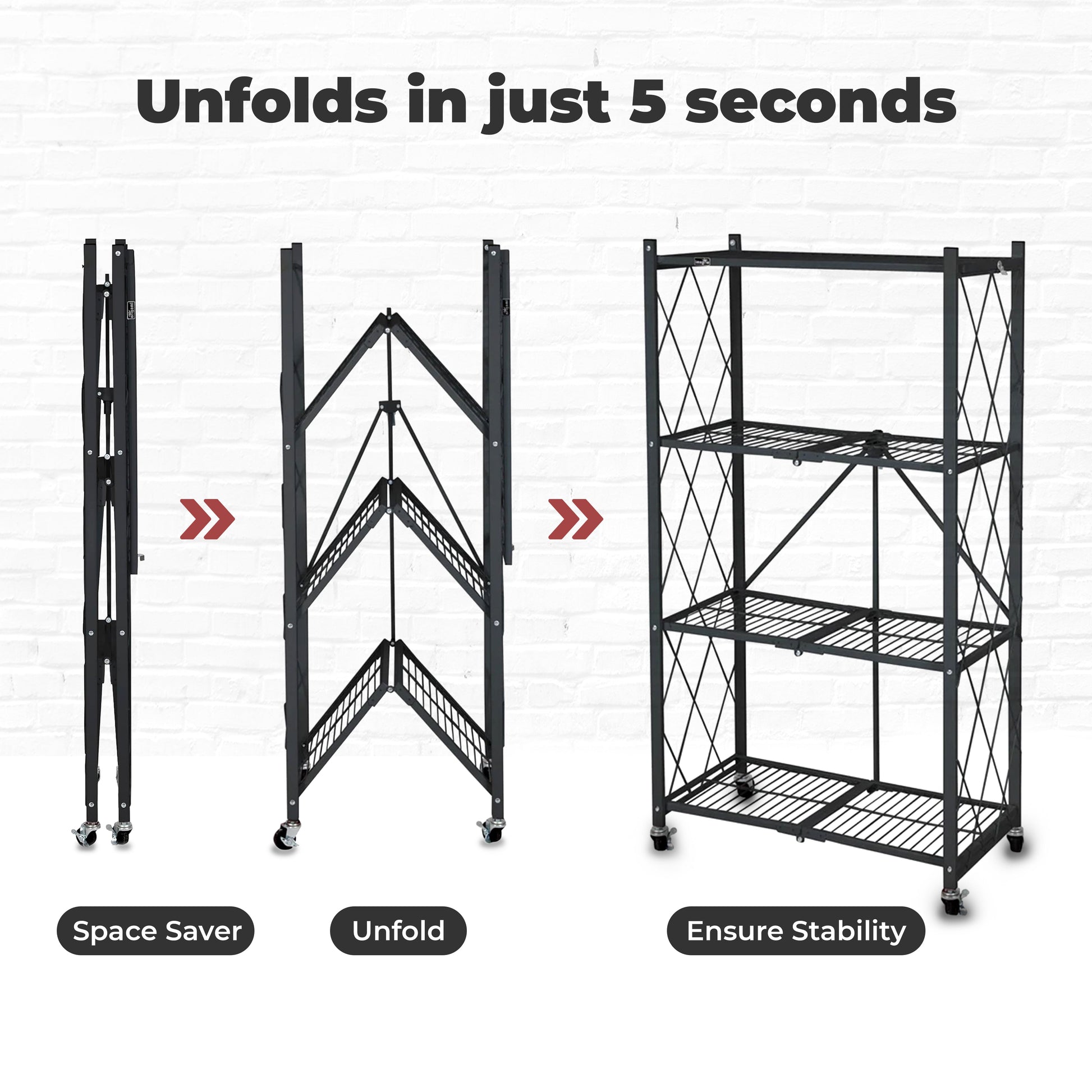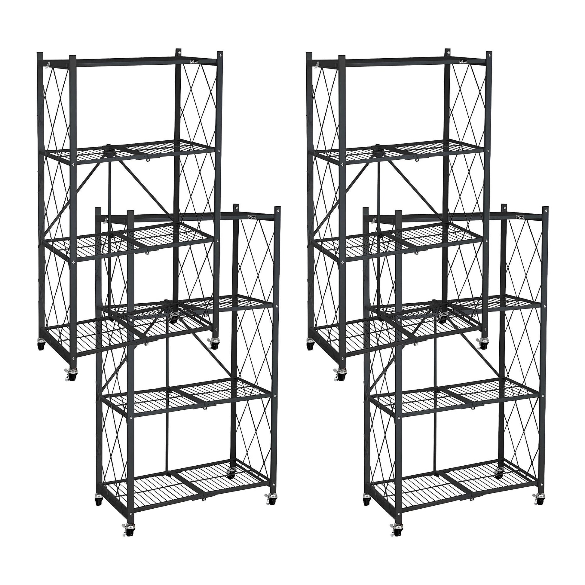 Instantly transform your cluttered garage or chaotic warehouse into a streamlined space of efficiency with the 4 pack of Origami 4-Tier Folding Shelf Garage Shelving.Say goodbye to the hassle of assembling shelves. These pre-assembled marvels unfold in just 5 seconds to reveal a sturdy wire steel shelving unit ready to tackle your organizational woes. Designed for convenience, this rolling shelf glides effortlessly wherever you need it, thanks to the built-in wheels. Crafted from commercial-grade powder-coated steel, these heavy-duty shelving units is built to withstand the rigors of any environment. Whether it's enduring the demands of a busy garage, a bustling warehouse, or even the elements in your garden, rest assured this shelf will hold up under pressure. Experience peace of mind knowing your belongings are securely housed on the steel hatches, providing stability even under heavy loads. With a remarkable 160-pound capacity, these shelves can effortlessly organize tools, equipment, and supplies, reducing clutter and saving you valuable time searching for misplaced items. For added versatility, choose to equip your shelves with the optional 4 wheels, increasing their portability for dynamic storage solutions. While the capacity is slightly lowered to 120 pounds with the wheels attached, the convenience they provide is priceless.Embrace the simplicity of organization and reclaim your time with the 4 pack of Origami 4-Tier Folding Shelf Garage Shelving. They're more than just a shelving unit; they're a game-changer for anyone seeking efficient storage solutions without the hassle.